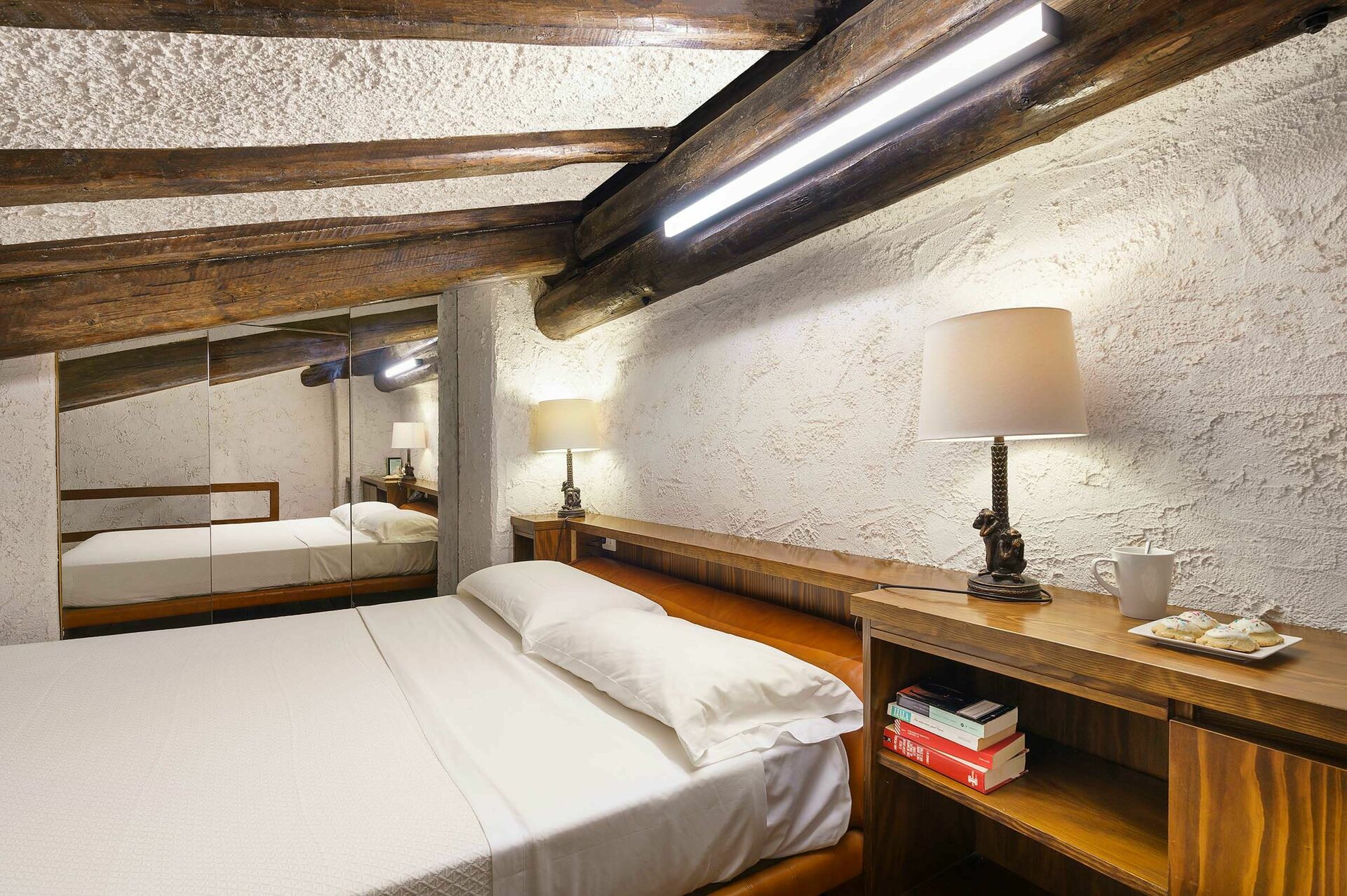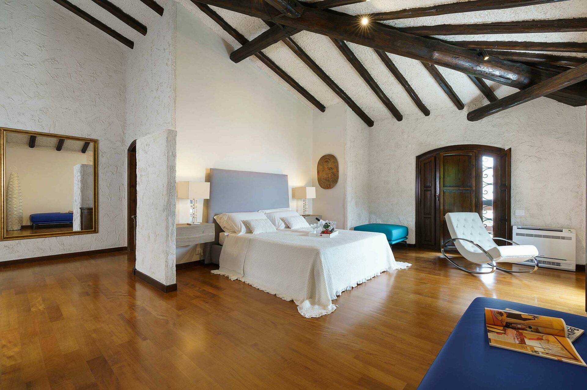 Eerste verdieping: 1 tweepersoonskamer met en-suite bad en douche, 1 tweepersoonskamer met en-suite douche, 1 slaapkamer met twee eenpersoonsbedden met en-suite douche, 1 slaapkamer met tweepersoonsbed op de vliering en en-suite douche.