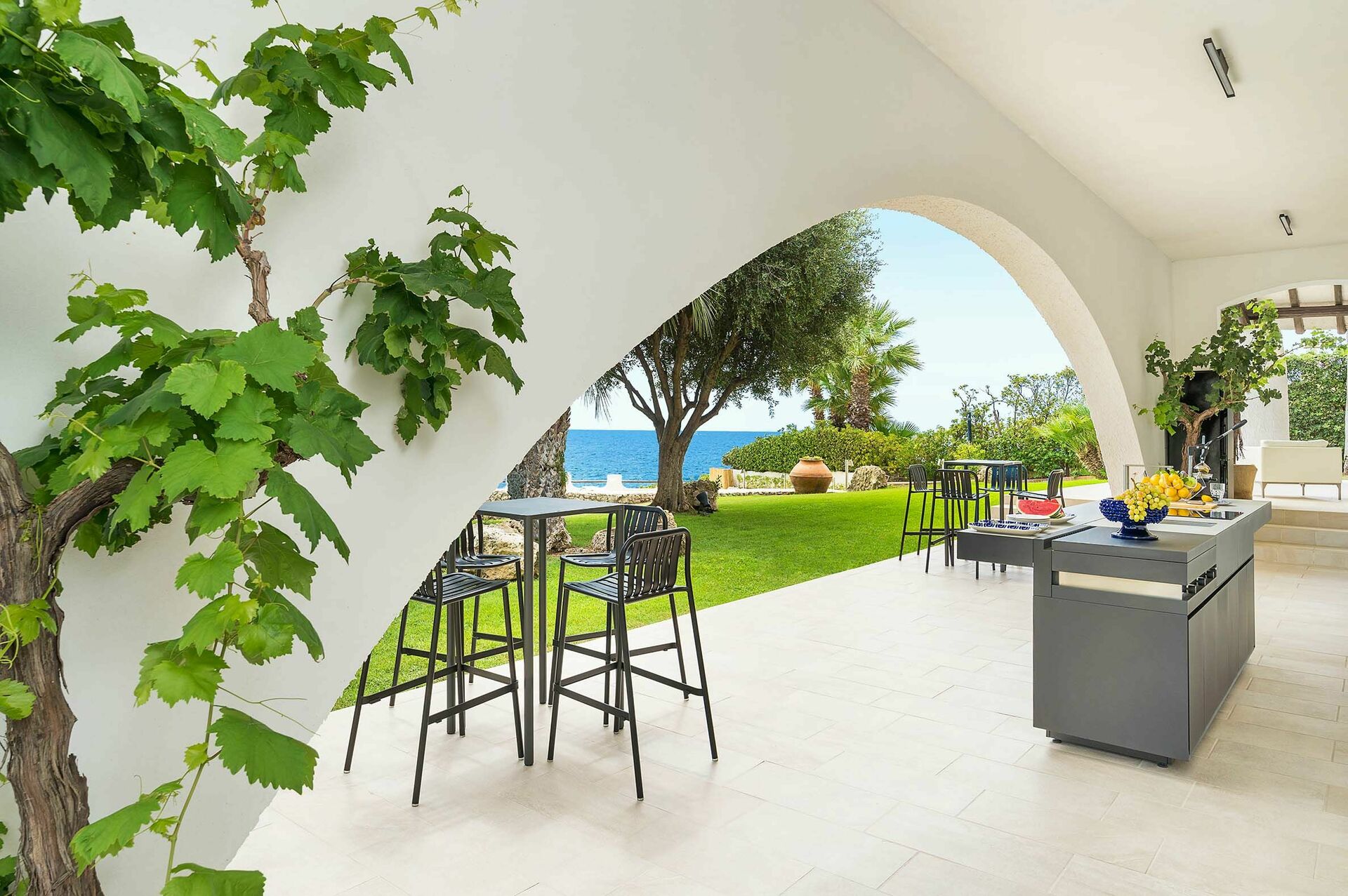 Deze prestigieuze vakantiewoning wordt omgeven door een goed onderhouden tuin met gazon en biedt ruime, goed uitgeruste buitenruimtes, een prachtig zwembad met zonneterras en een praktische privétoegang tot de zee en de rotsen beneden.