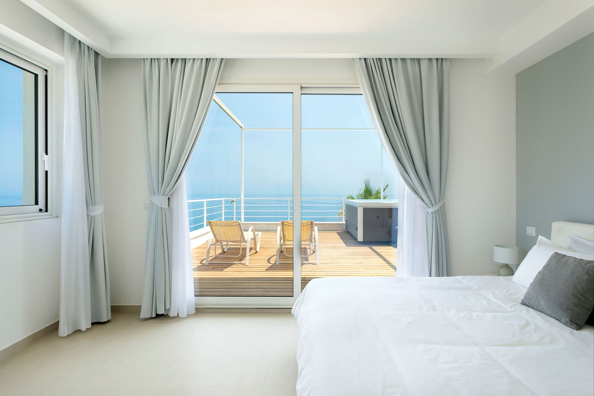 Beide slaapkamers op de eerste verdieping hebben toegang tot het terras met de jacuzzi.