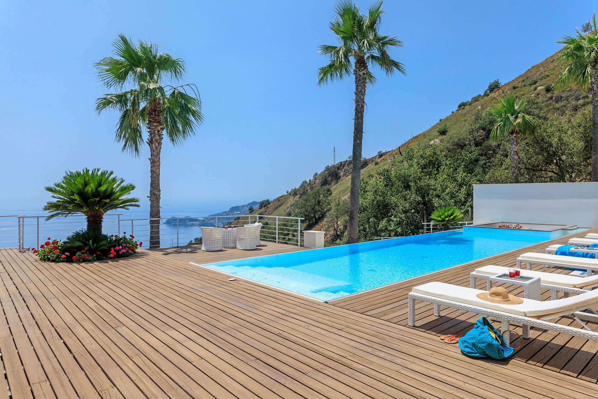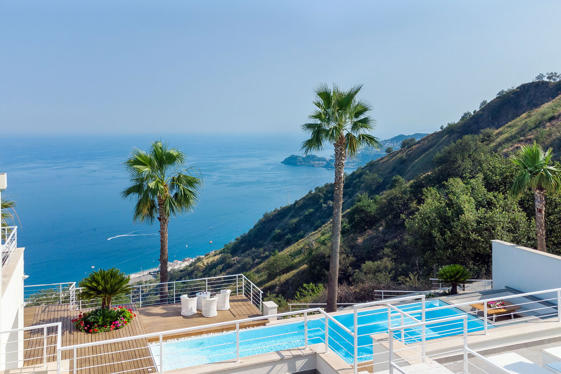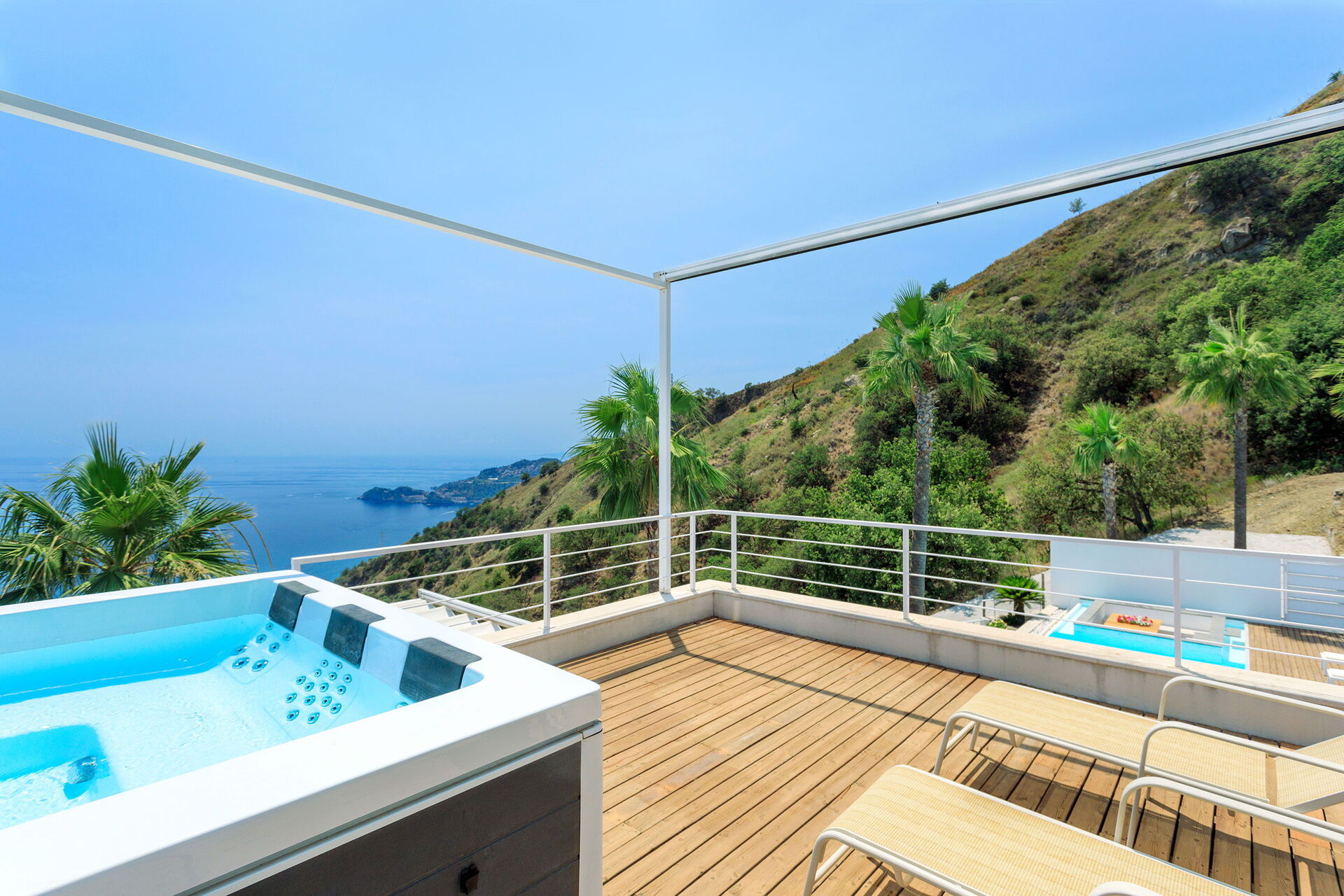 Modern en licht, deze exclusieve vakantievilla ligt op een ongelooflijk schilderachtige plek met een adembenemend uitzicht op de zee en de baai van Taormina. Geniet van het uitzicht vanuit het overloopzwembad met bubbelbad, vanaf de terrassen of vanuit de tuin.