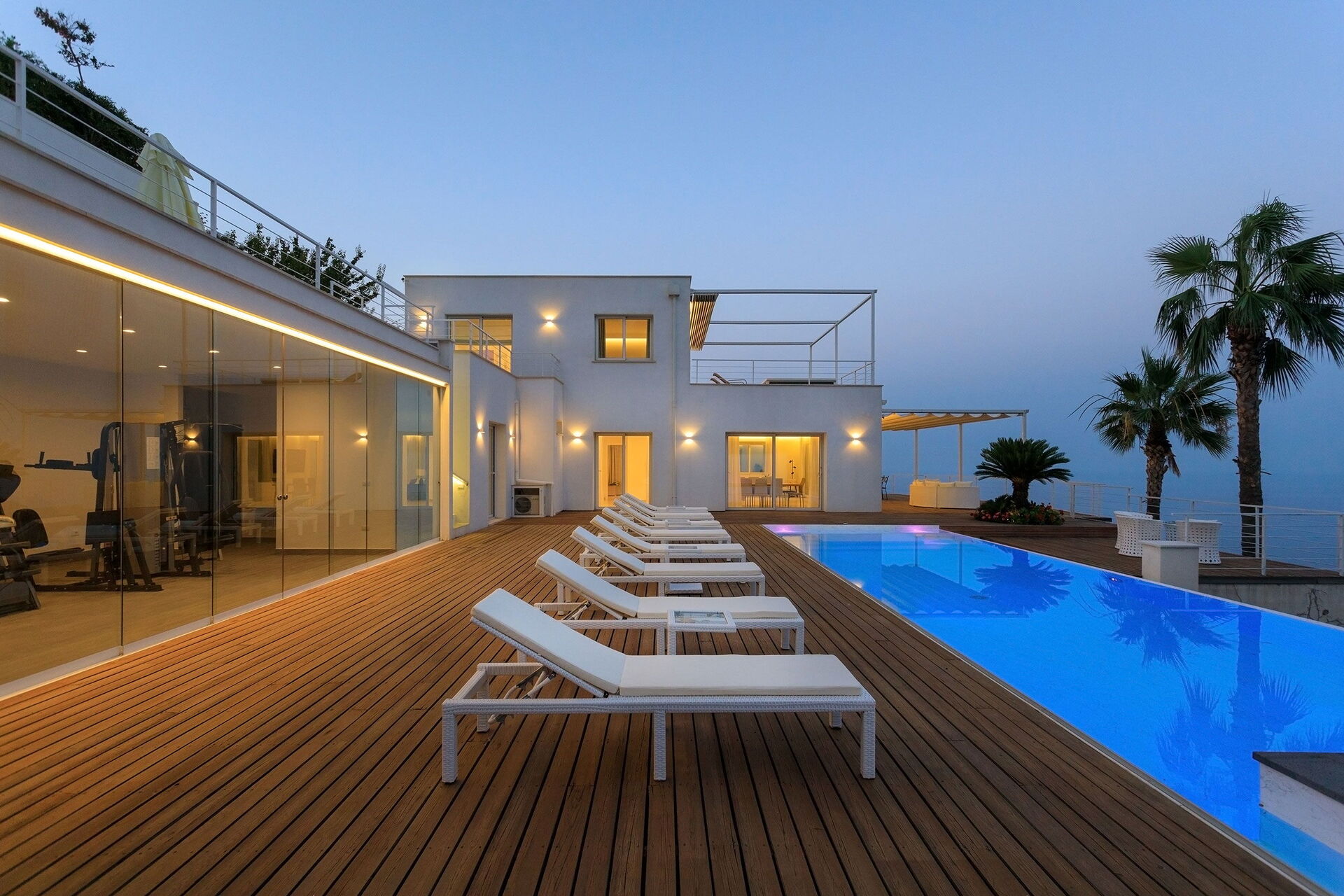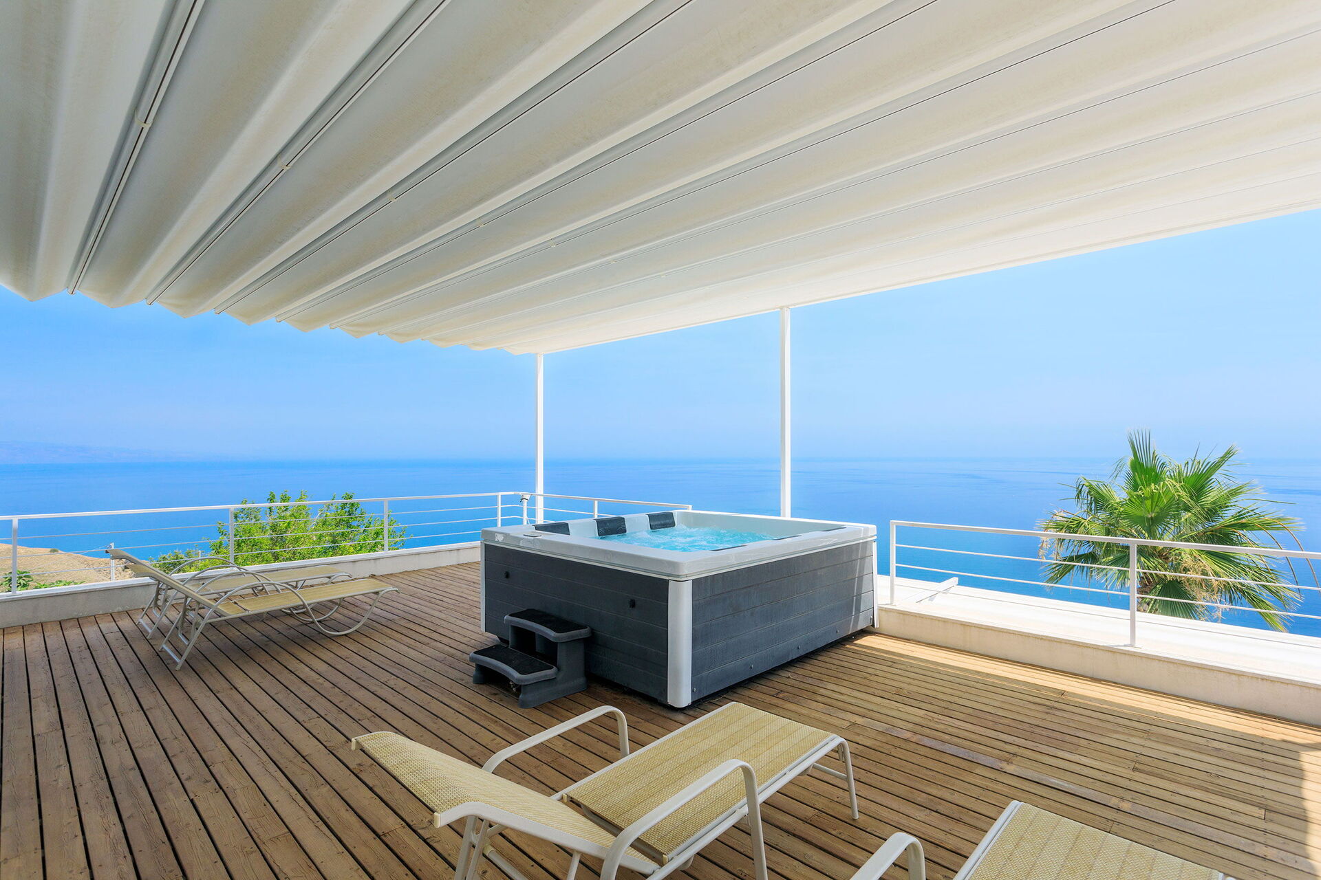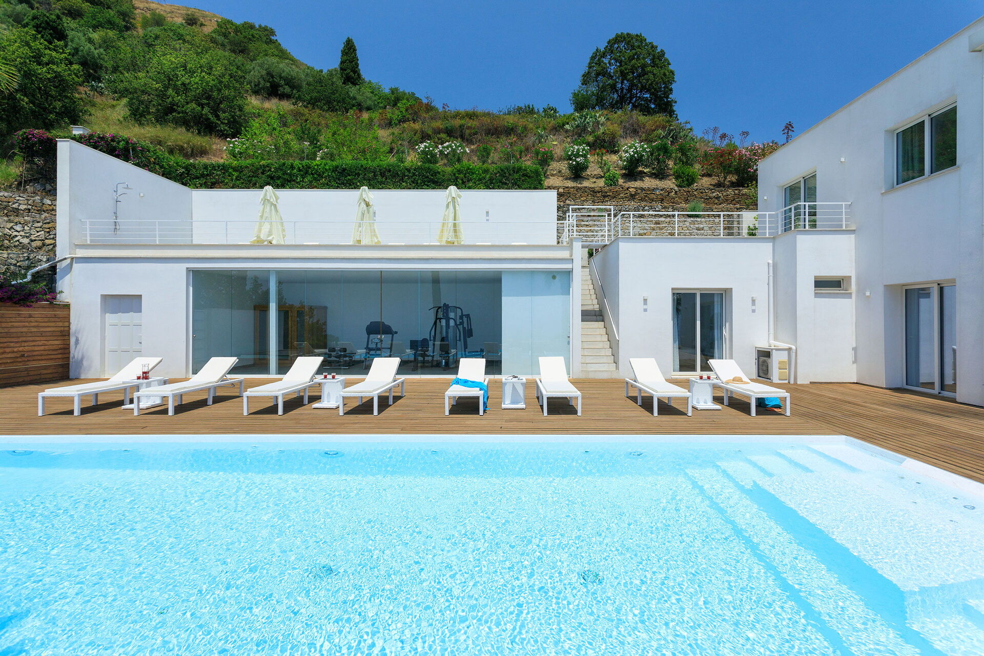 Ter beschikking van de gasten is er ook een hot tub buiten op het terras, en een ruimte met een fitnessruimte en een sauna.