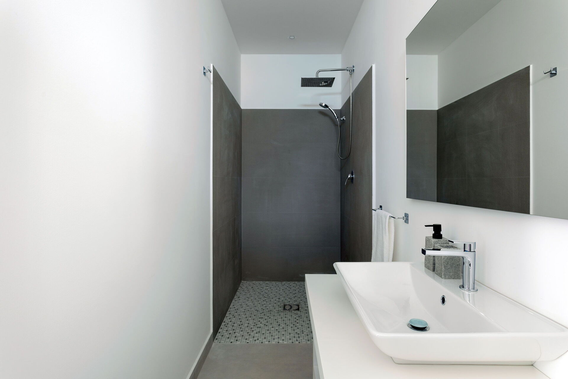Begane grond: (alleen toegankelijk van buitenaf, en niet verbonden met de rest van de villa aan de binnenkant): slaapkamer met tweepersoonsbed (airconditioning) met eigen badkamer met douche.