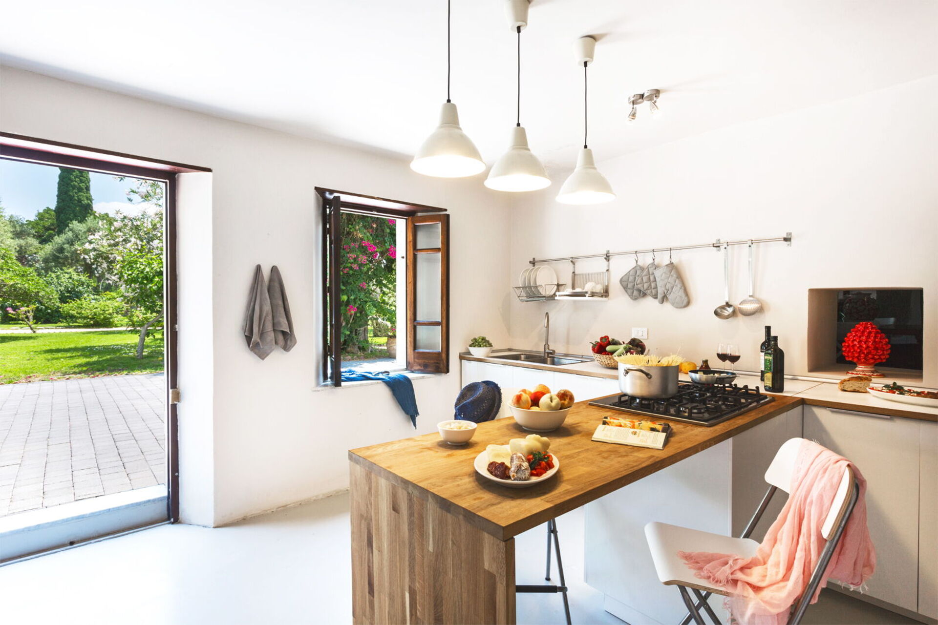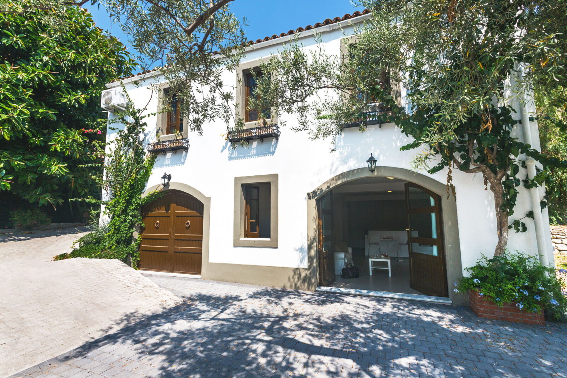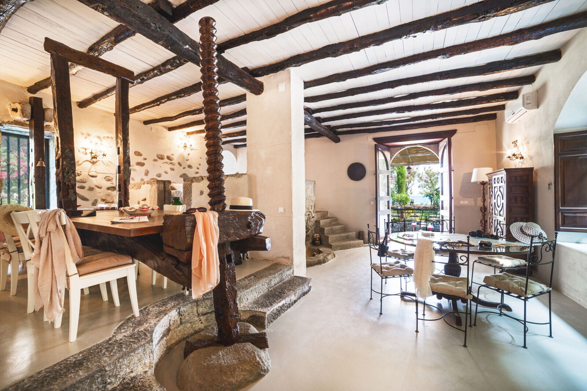 De villa is smaakvol ingericht met unieke elementen, zoals het tafelblad van de eettafel dat rust op een oude wijnpers – een eerbetoon aan de landbouwgeschiedenis van het huis. De weelderige tuin met palmbomen en olijfbomen draagt bij aan de charmante en sfeervolle omgeving.