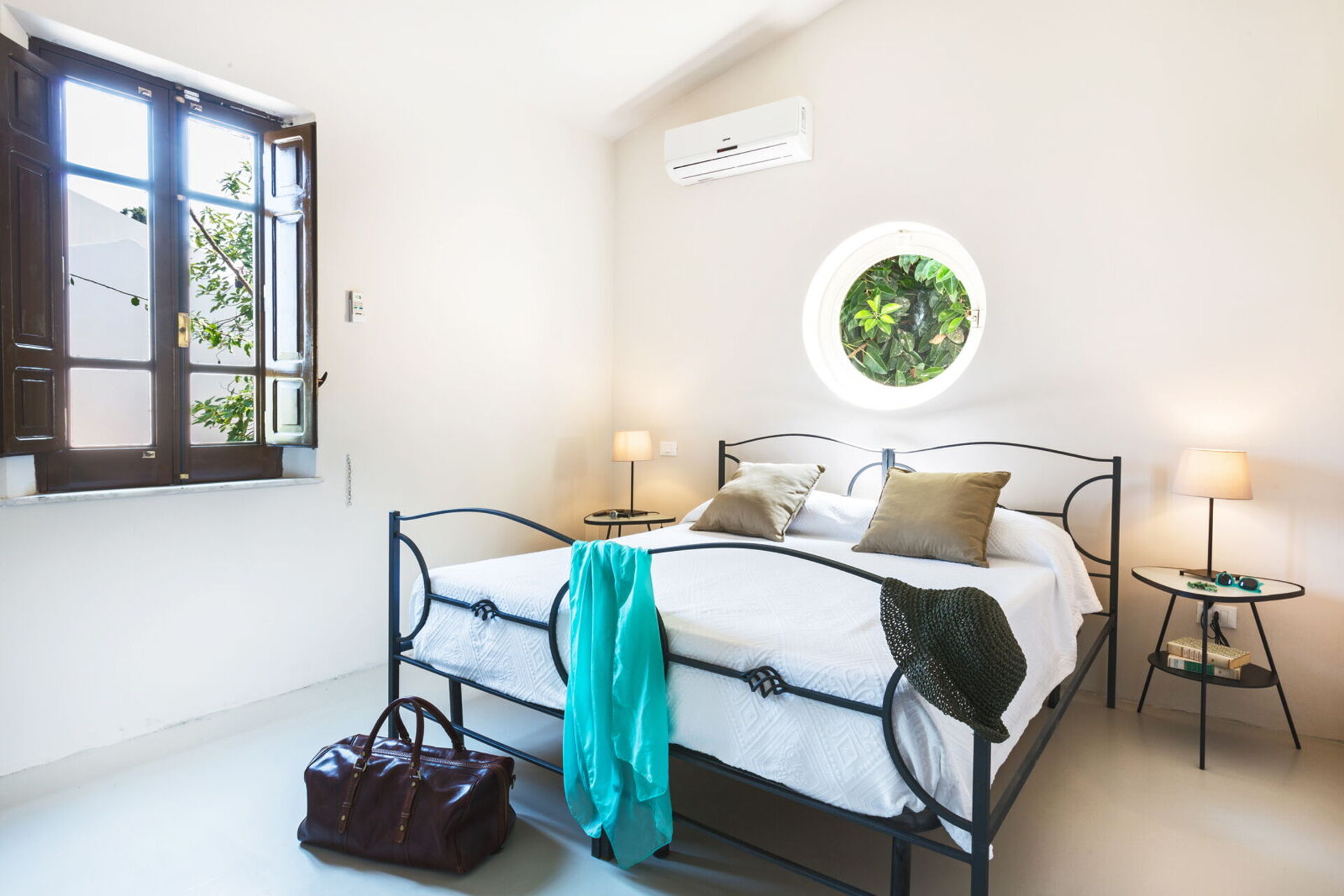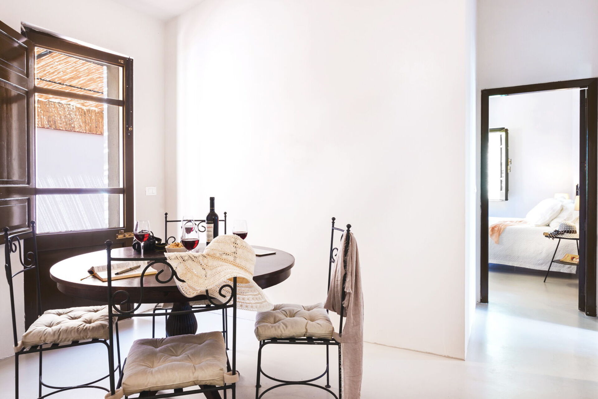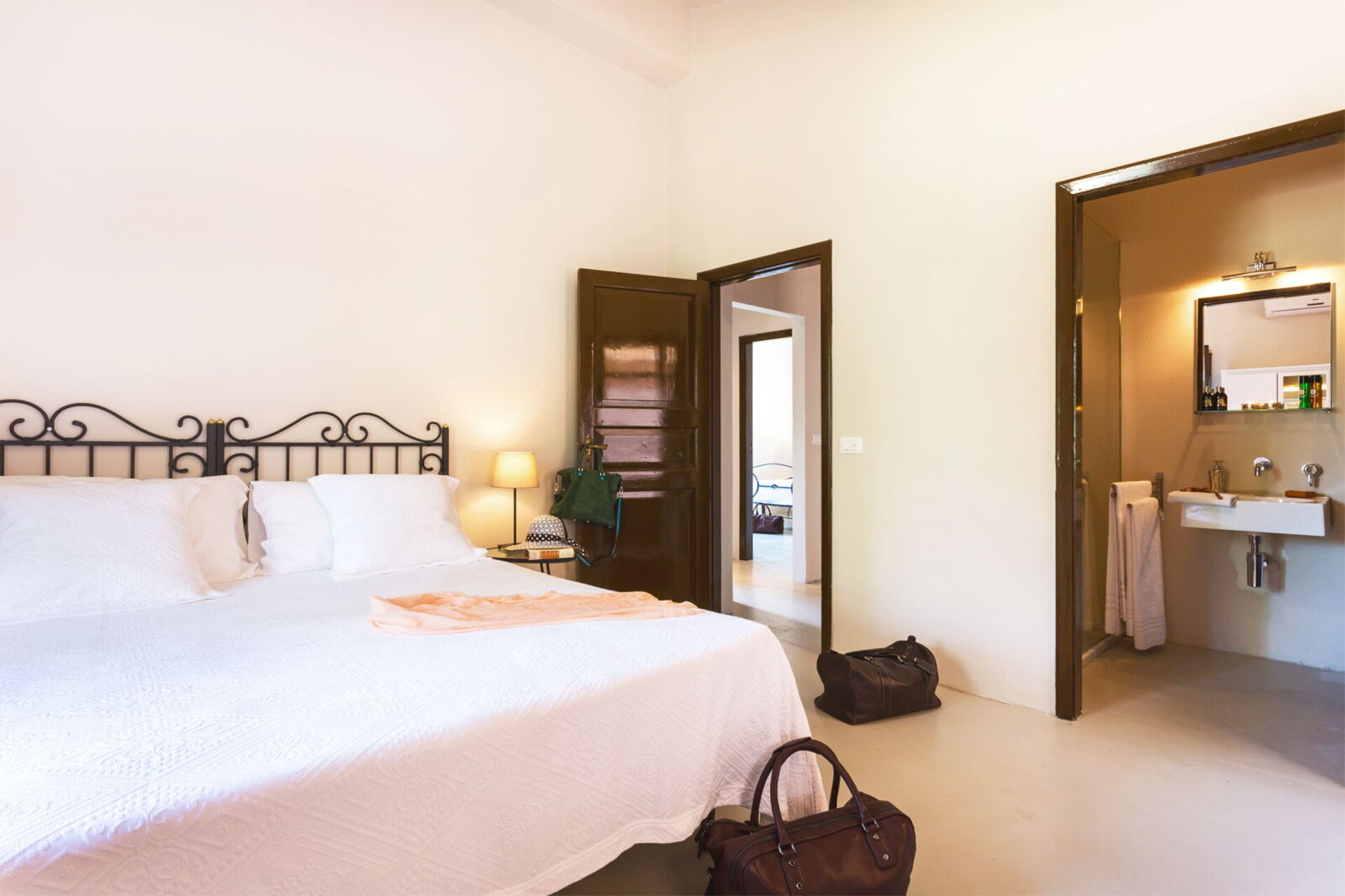 De villa is smaakvol ingericht met unieke elementen, zoals het tafelblad van de eettafel dat rust op een oude wijnpers – een eerbetoon aan de landbouwgeschiedenis van het huis. De weelderige tuin met palmbomen en olijfbomen draagt bij aan de charmante en sfeervolle omgeving.