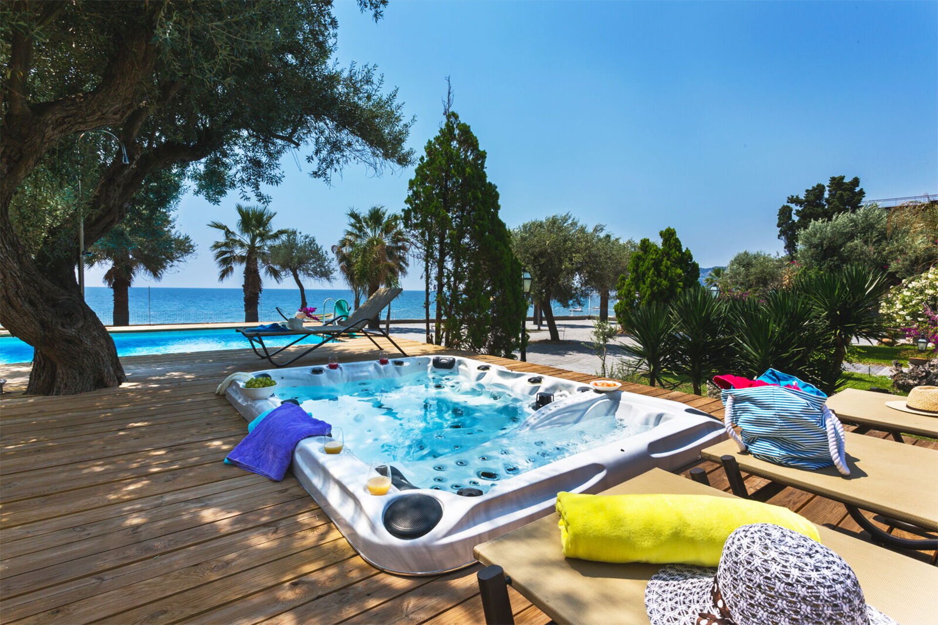 De buitenruimtes bieden volop ruimte om te genieten van het verblijf met familie of vrienden. Je vindt hier een verhoogd terras, ingericht voor maaltijden in de buitenlucht, en een zwembad met prachtig uitzicht op zee. Daarnaast is er een verwarmde jacuzzi waar je kunt ontspannen met uitzicht op de zee.
