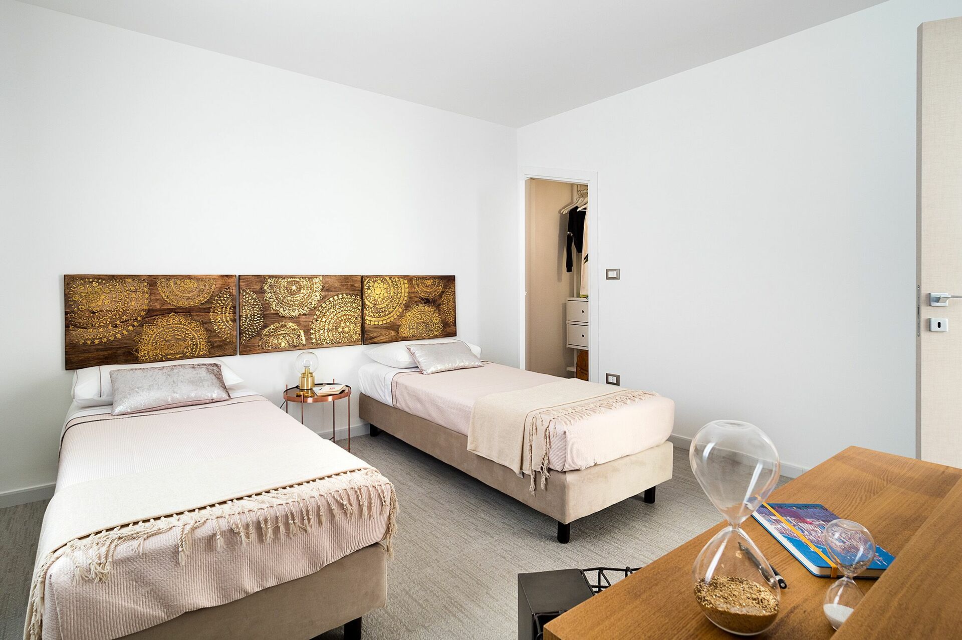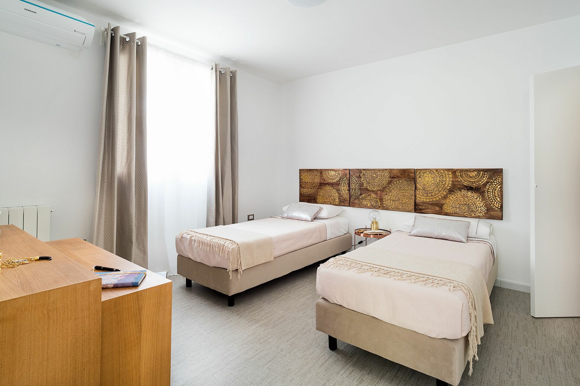 Begane grond: 2 slaapkamers met tweepersoonsbed, 1 slaapkamer met twee eenpersoonsbedden, zitkamer, 2 badkamers met douche, terras.