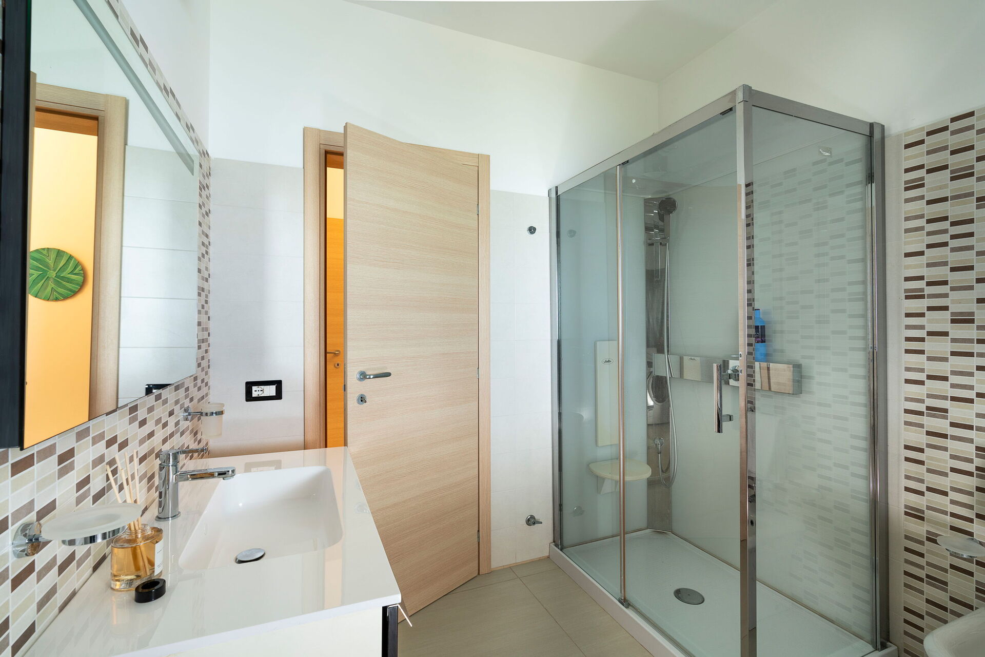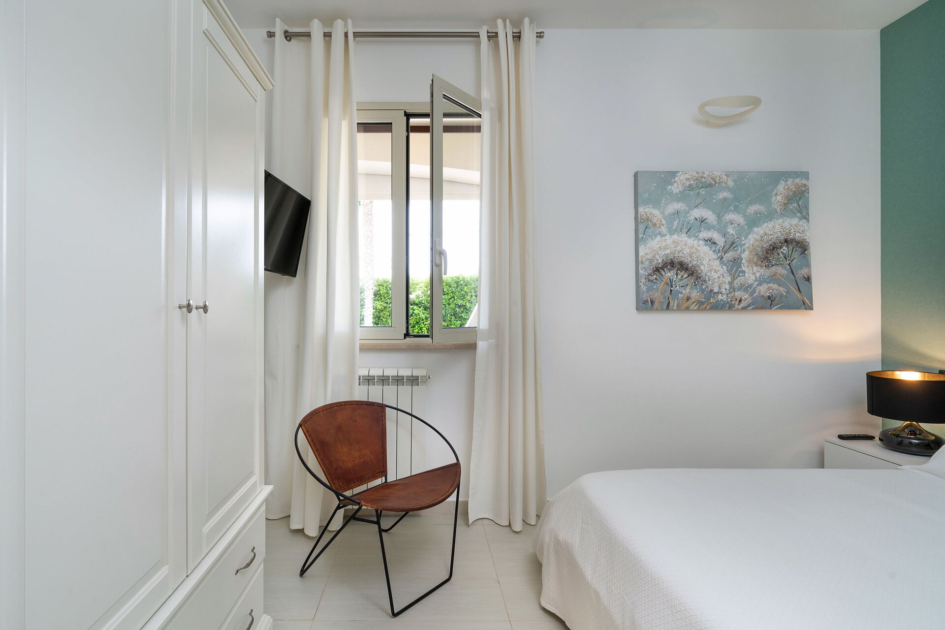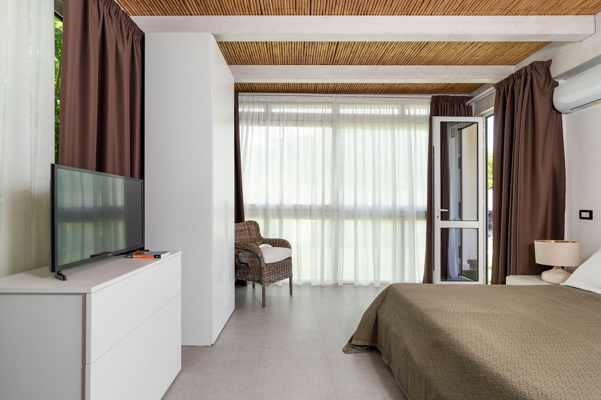 Begane grond (alleen van buitenaf toegankelijk, en binnen niet verbonden met de rest van de villa): slaapkamer met tweepersoonsbed (airconditioning, scherm) met eigen badkamer met douche.