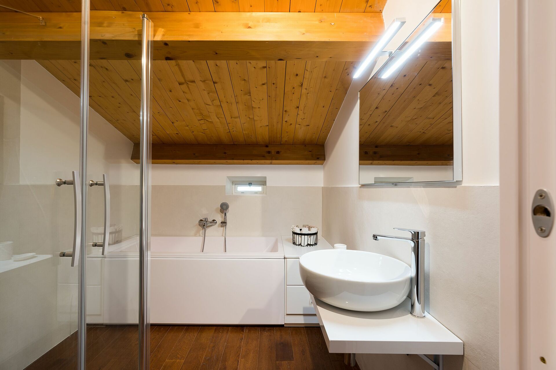 Tweede verdieping (op zolder): 1 suite met slaapkamer met tweepersoonsbed en eigen badkamer met ligbad en douche.
