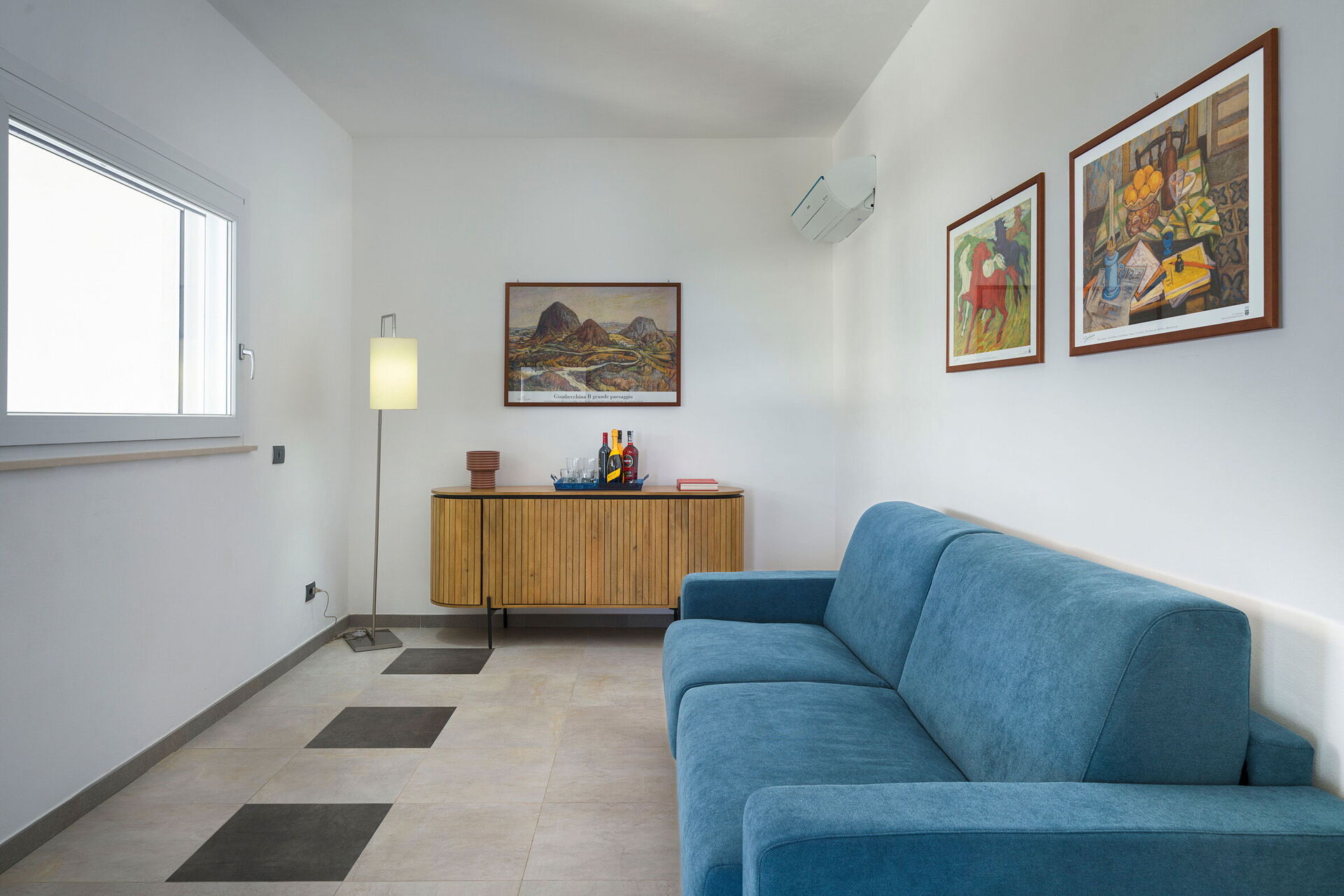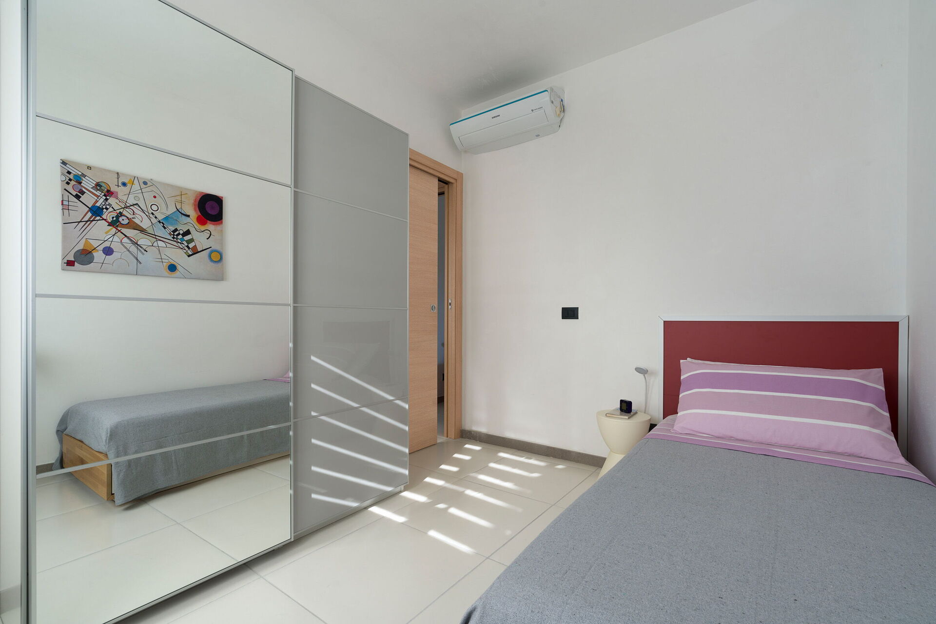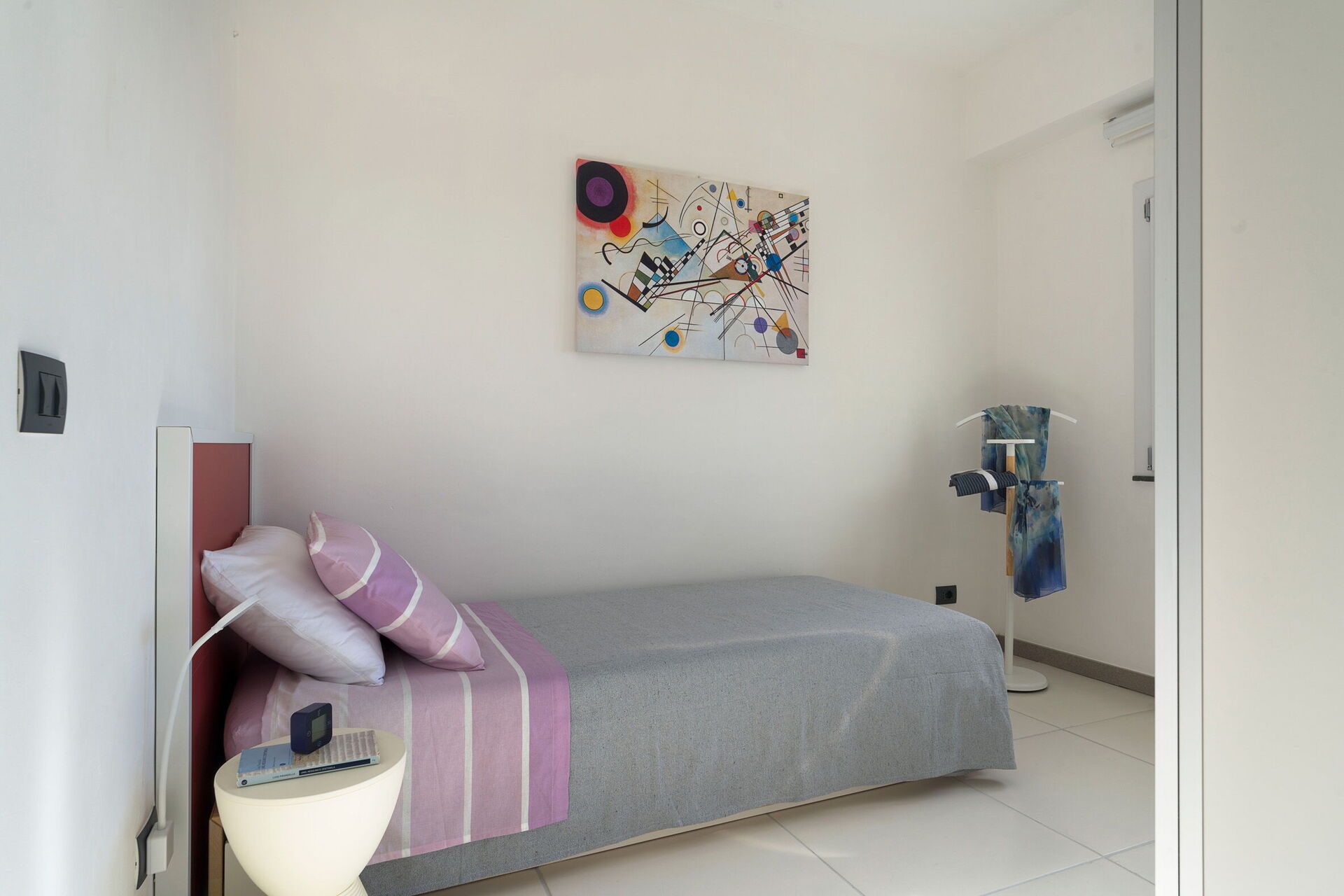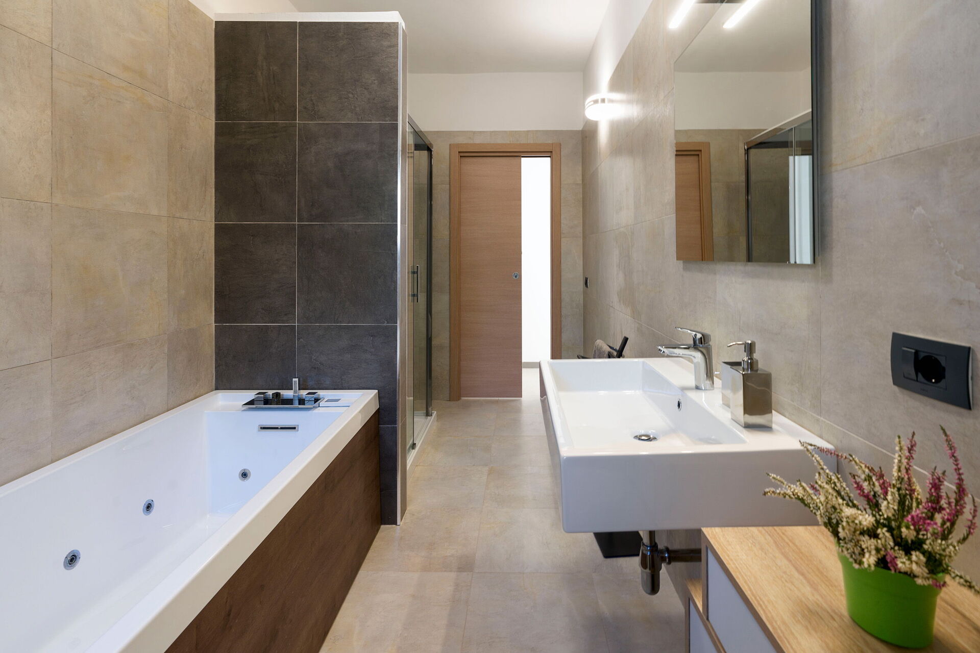 Eerste verdieping: (alleen van buitenaf bereikbaar en niet binnendoor verbonden met de rest van de villa): grote woonkamer (airconditioning, tv, scherm) met eethoek en toegang tot het panoramische terras, keuken (kookplaat, oven, vriezer, koelkast, vaatwasser, broodrooster, espressomachine), tweepersoonsslaapkamer (airconditioning, scherm) met privébadkamer met douche, 2 slaapkamers elk met een eenpersoonsbed (airconditioning, scherm), badkamer met douche, wasruimte.
