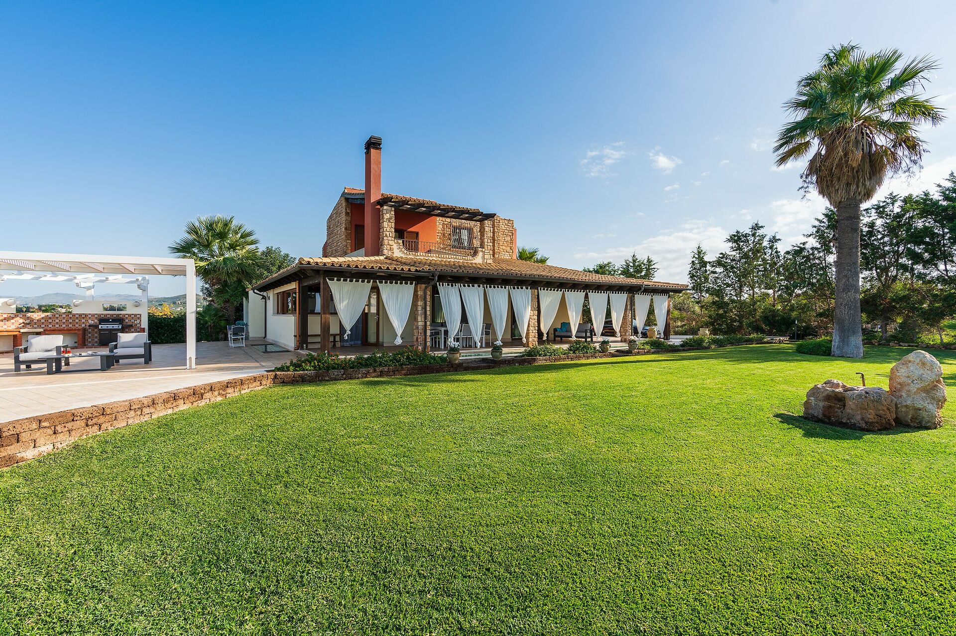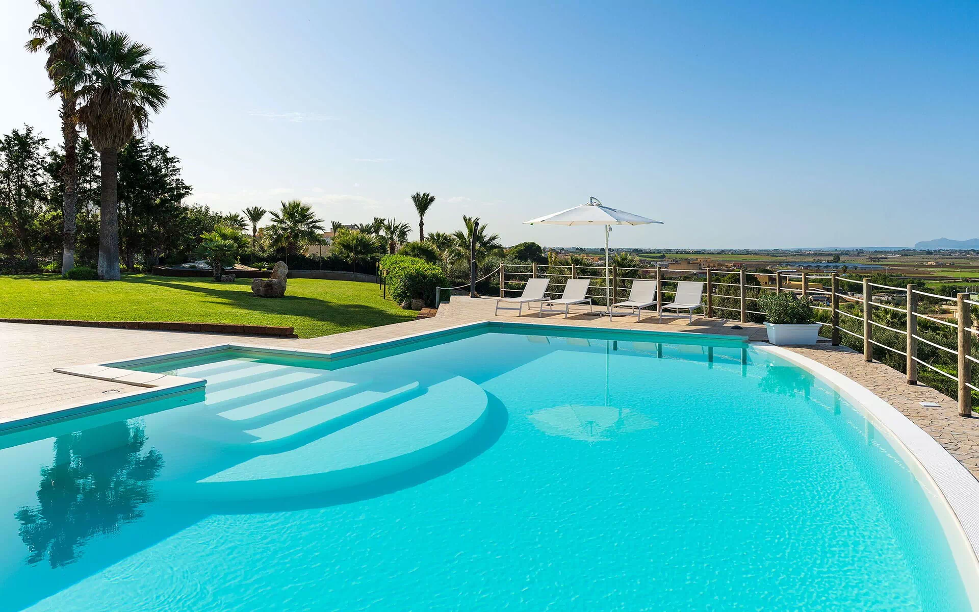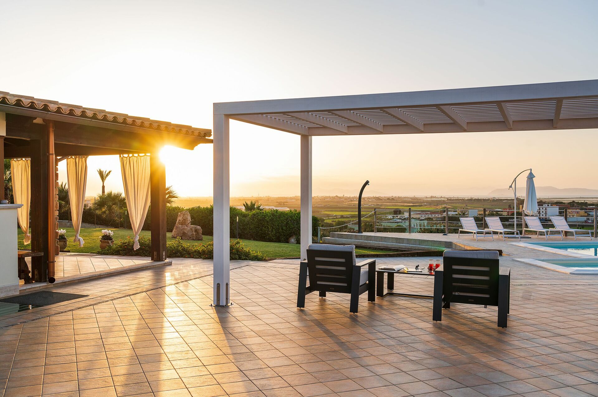 Omgeven door een zorgvuldig aangelegde tuin en ruime, stijlvol ingerichte terrassen, biedt dit elegante toevluchtsoord een adembenemend uitzicht dat zich uitstrekt van de Monte Erice tot aan de zoutvlaktes van Trapani en Paceco, en verder tot aan de schitterende Egadische Eilanden.