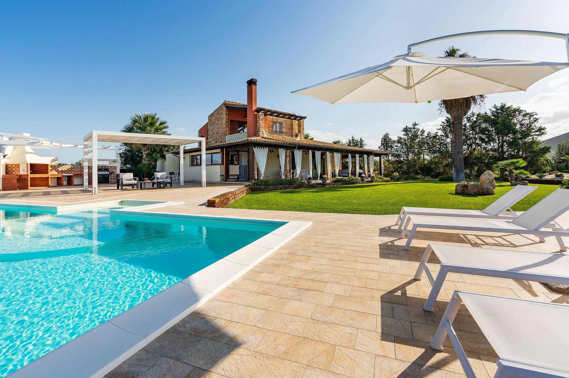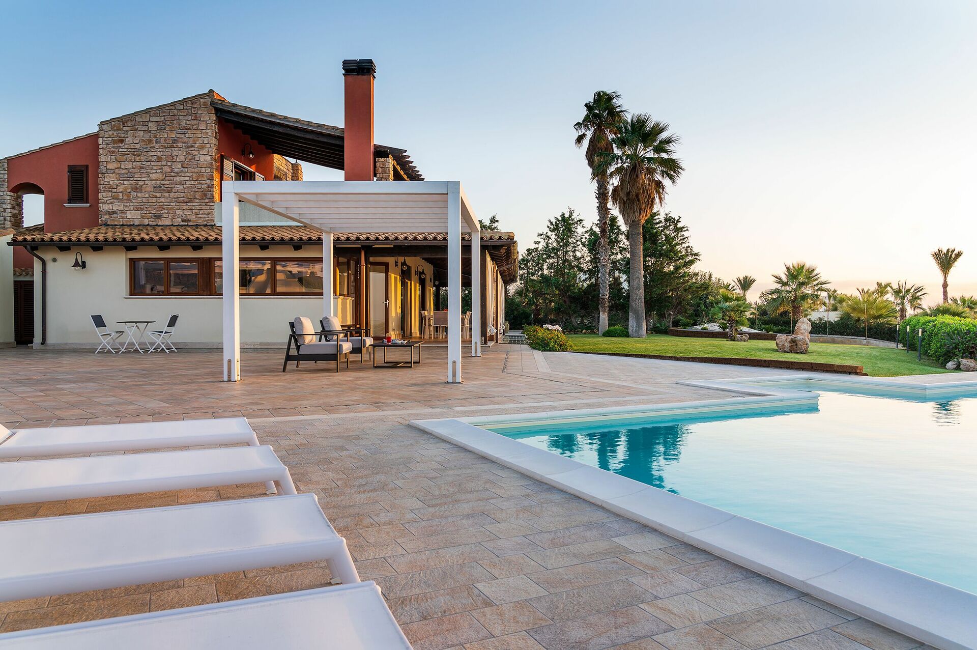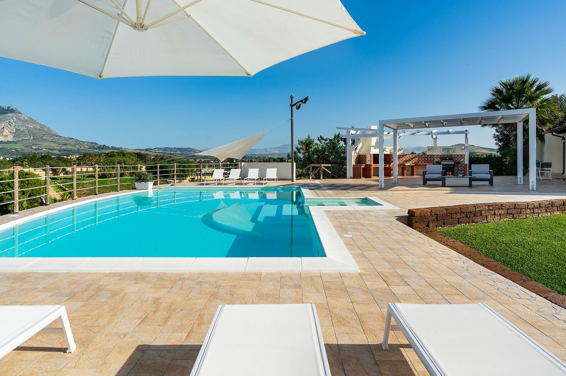 Omgeven door een zorgvuldig aangelegde tuin en ruime, stijlvol ingerichte terrassen, biedt dit elegante toevluchtsoord een adembenemend uitzicht dat zich uitstrekt van de Monte Erice tot aan de zoutvlaktes van Trapani en Paceco, en verder tot aan de schitterende Egadische Eilanden.