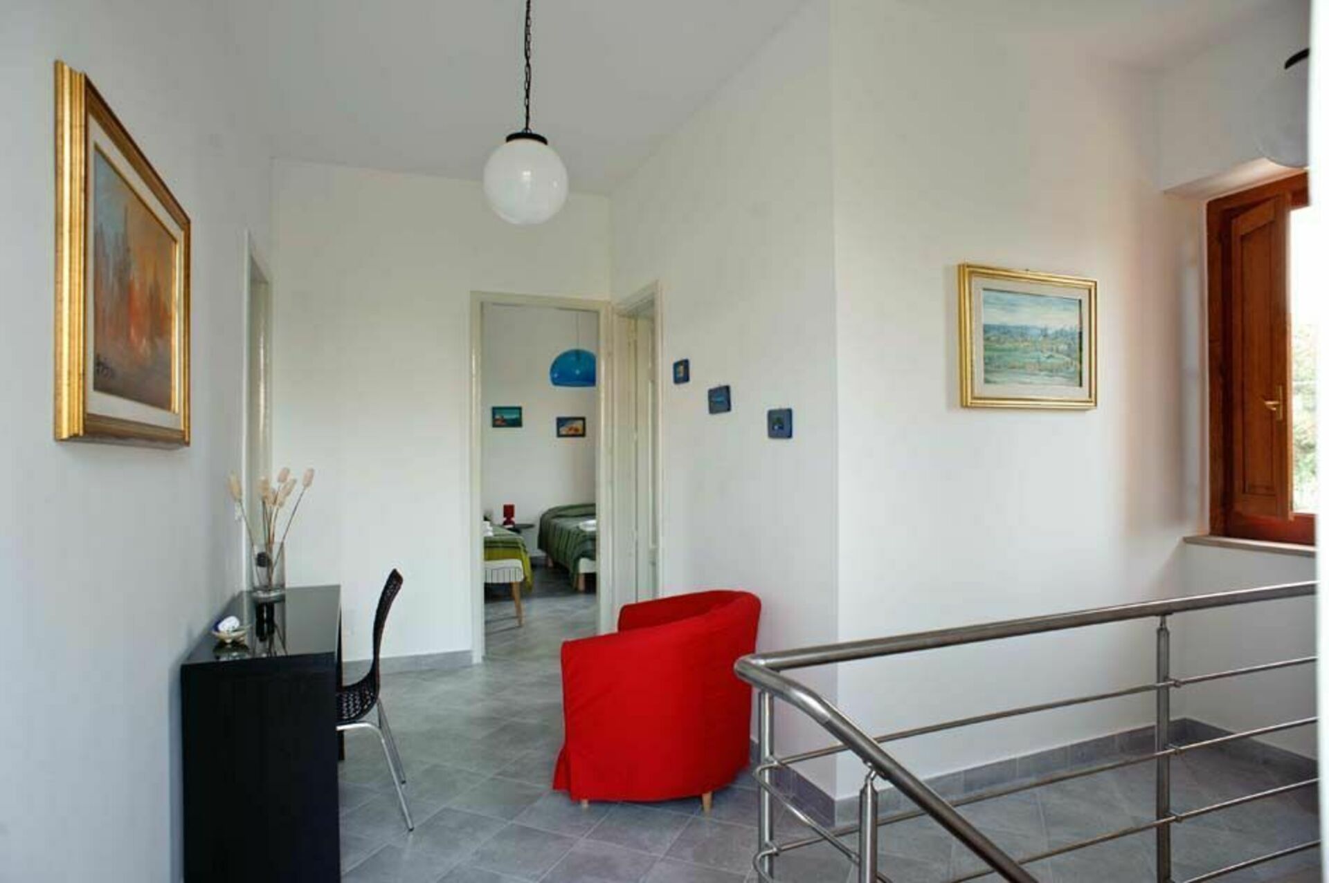 Eerste verdieping (ook toegankelijk via buitentrap): 1 slaapkamer met tweepersoonsbed, 1 slaapkamer met twee eenpersoonsbedden, 1 slaapkamer met twee eenpersoonsbedden, 2 badkamers met douche, klein terras.
