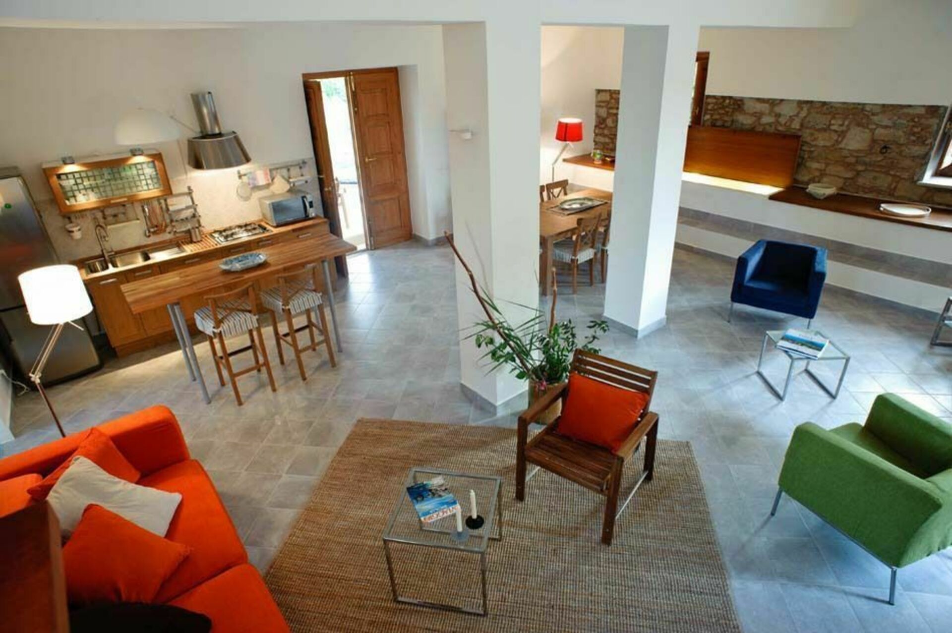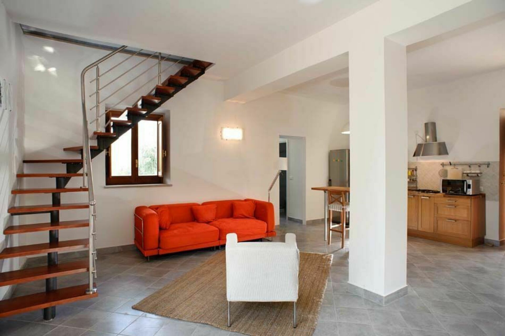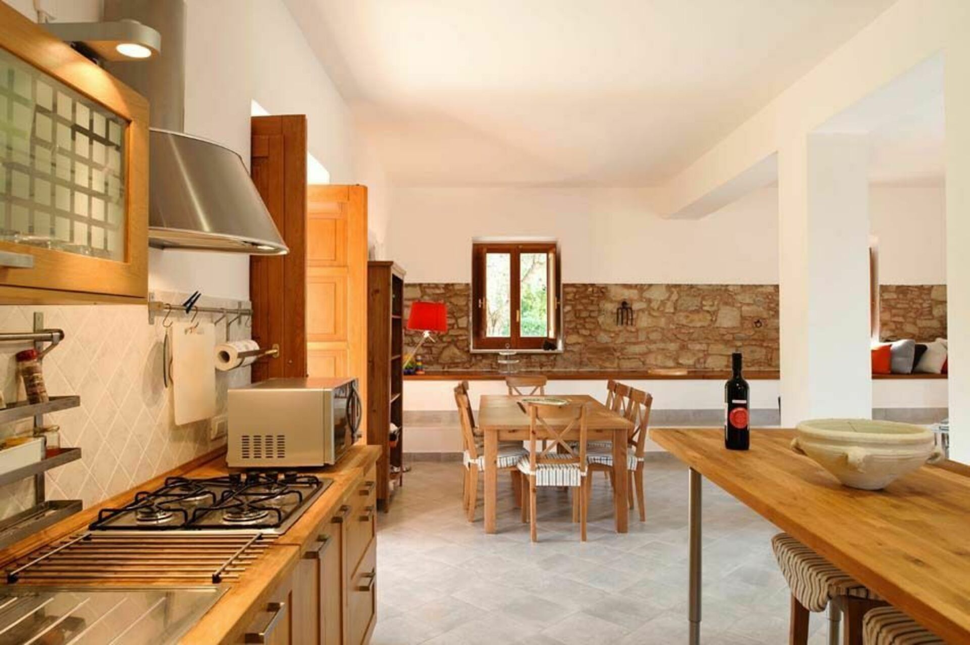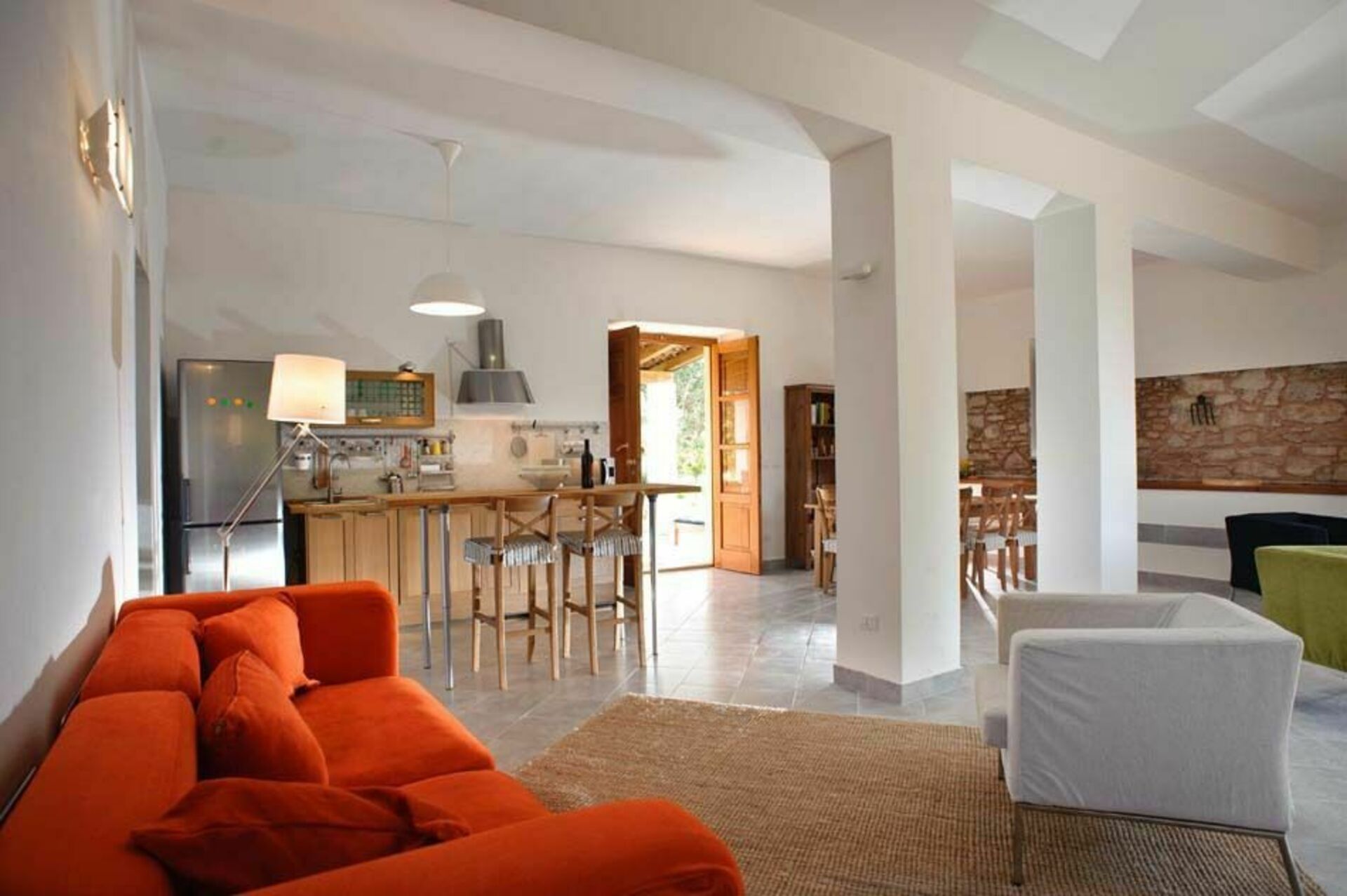 De begane grond is eenvoudig, maar elegant ingericht en beschikt over een ruime woon-/eetkamer met een keuken en een badkamer. Op de eerste verdieping, ook toegankelijk via een externe trap, zijn drie slaapkamers en twee badkamers. Buiten het huis wacht de gasten een schaduwrijk terras omgeven door olijf- en citrusbomen.