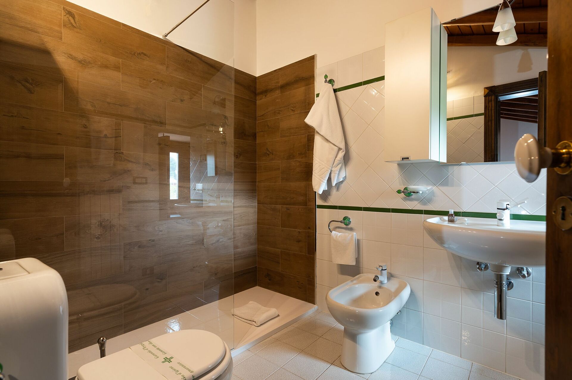 Ground floor: large open space living area with dining area; kitchen (oven, freezer, dishwasher, coffee maker); 1 WC; 2 double bedrooms, each with private bathroom with shower.