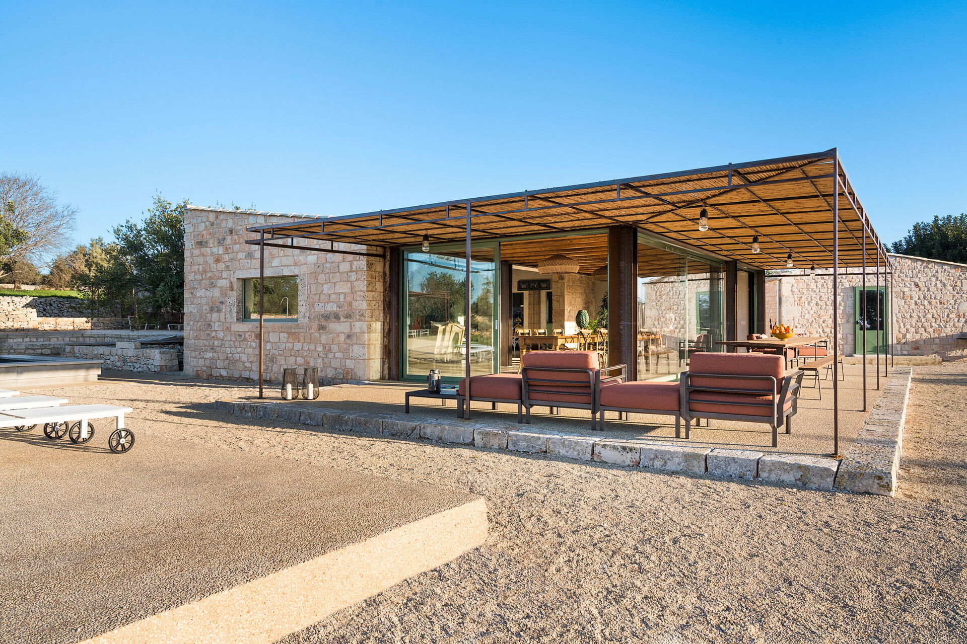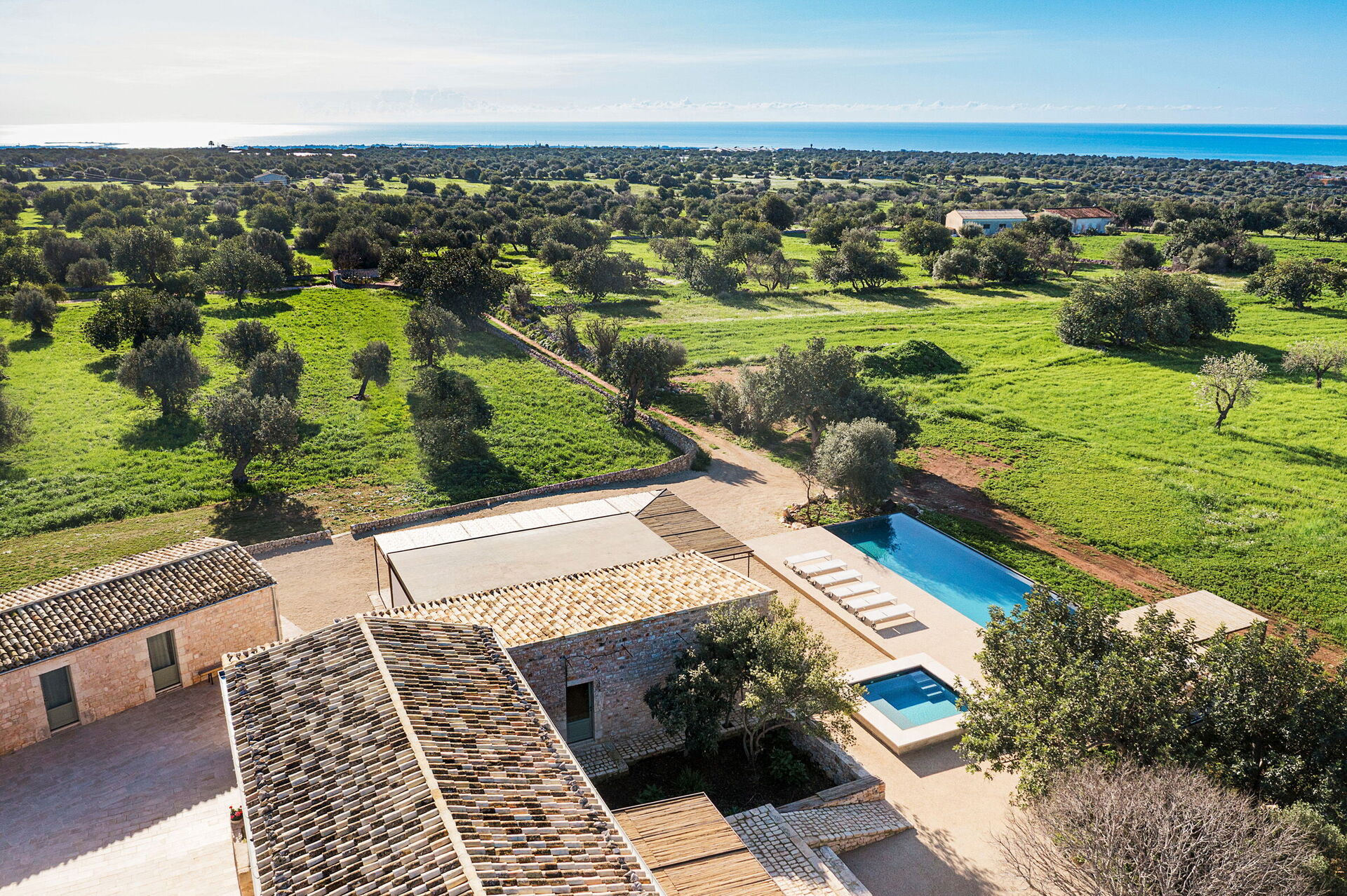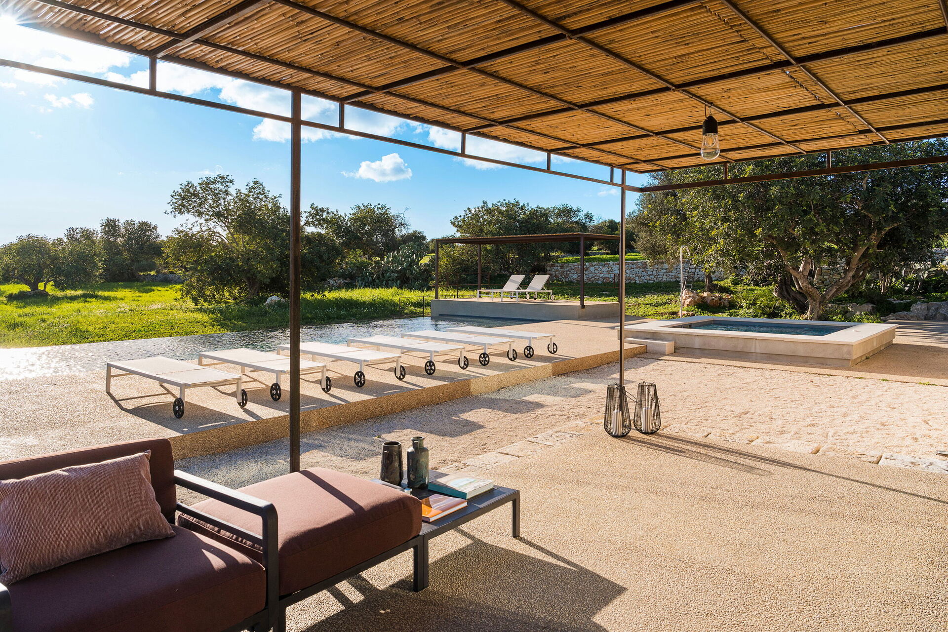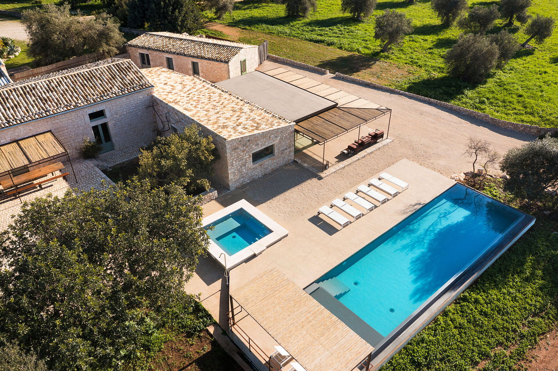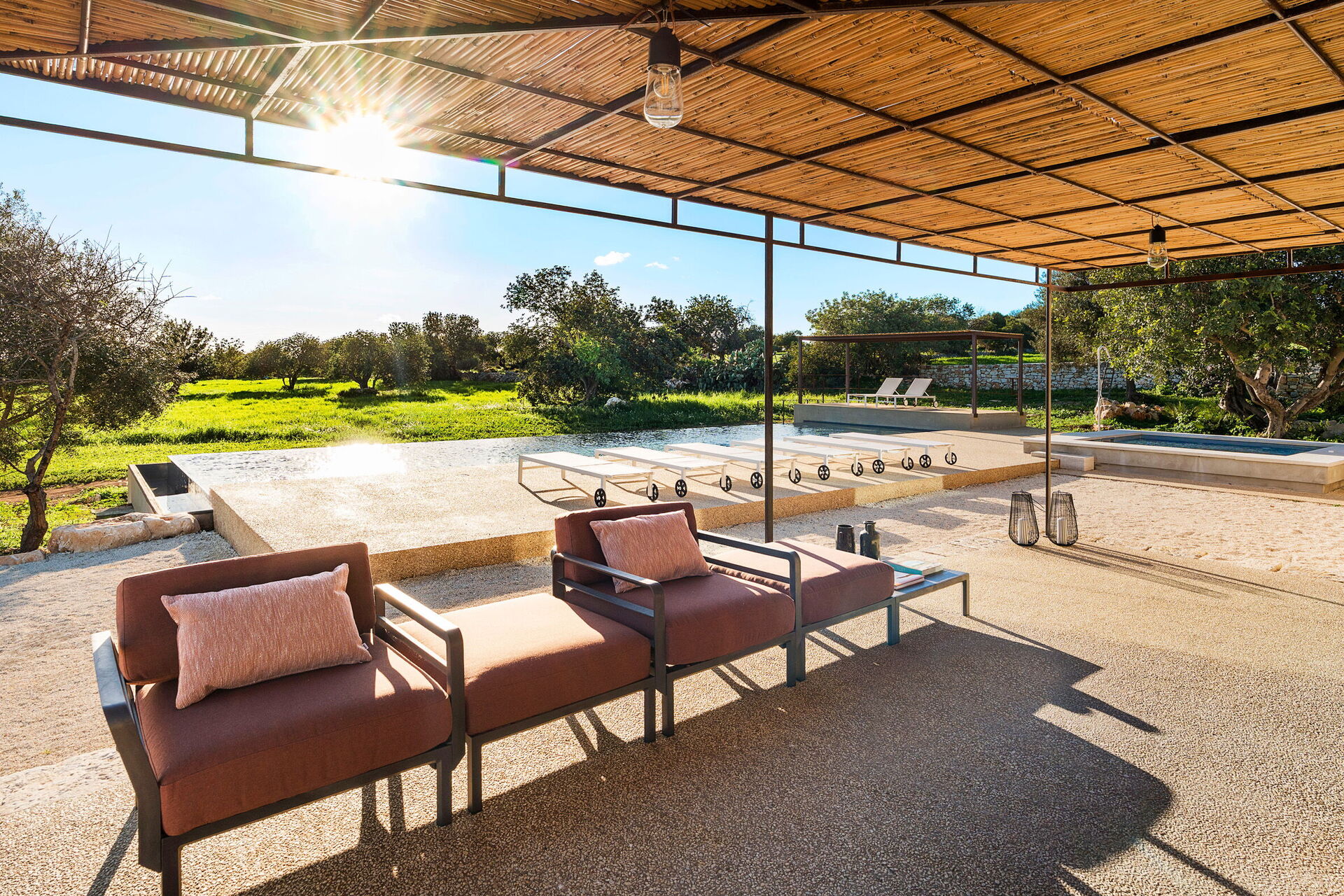 Het landgoed biedt veel buitenruimtes waar gasten tijd kunnen doorbrengen met familie of vrienden: buiten dineren, ontspannen bij het zoutwaterzwembad of op een ligbed met jacuzzi, en onvergetelijke momenten beleven in een schilderachtige omgeving onder de Siciliaanse zon.