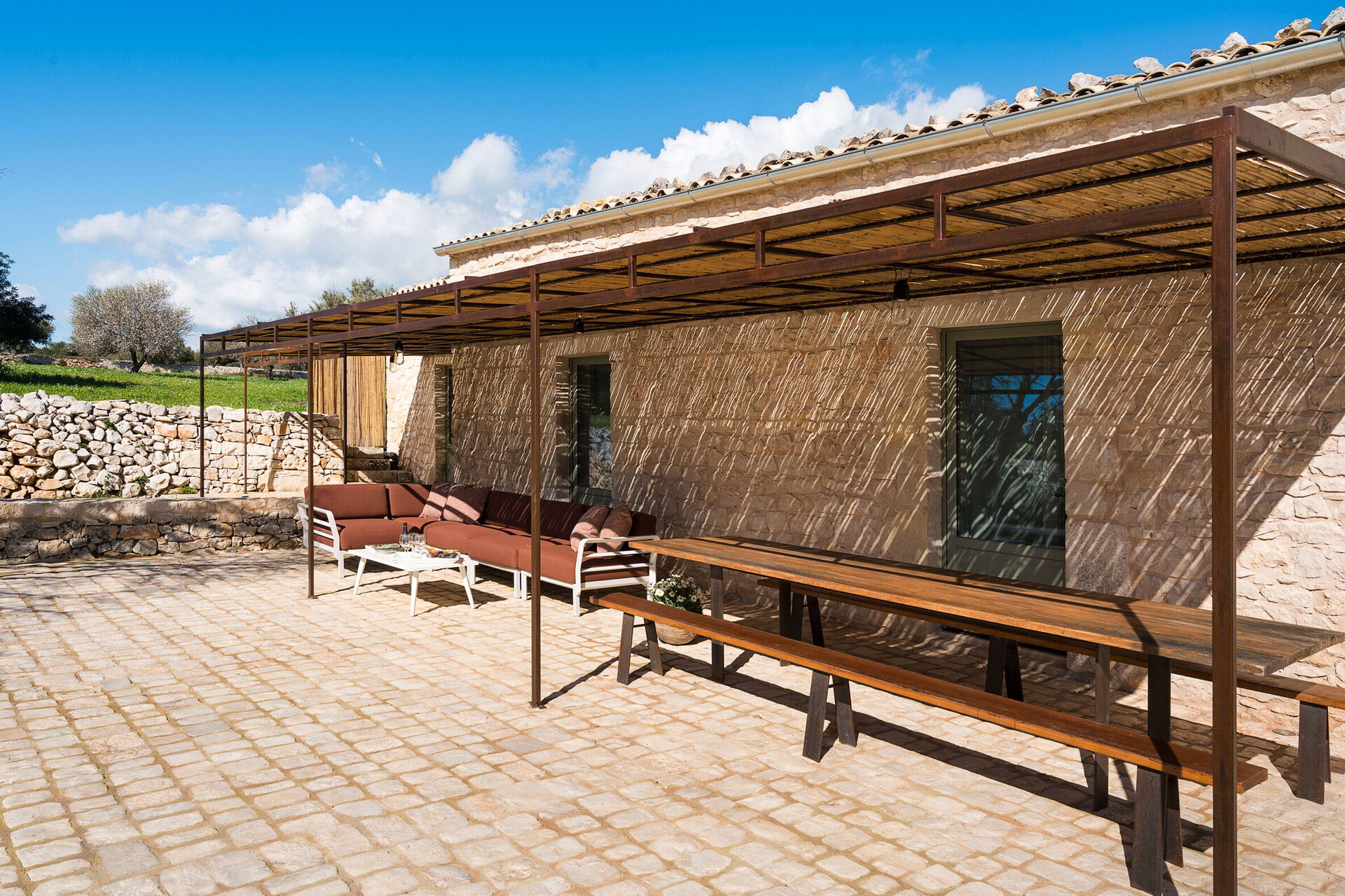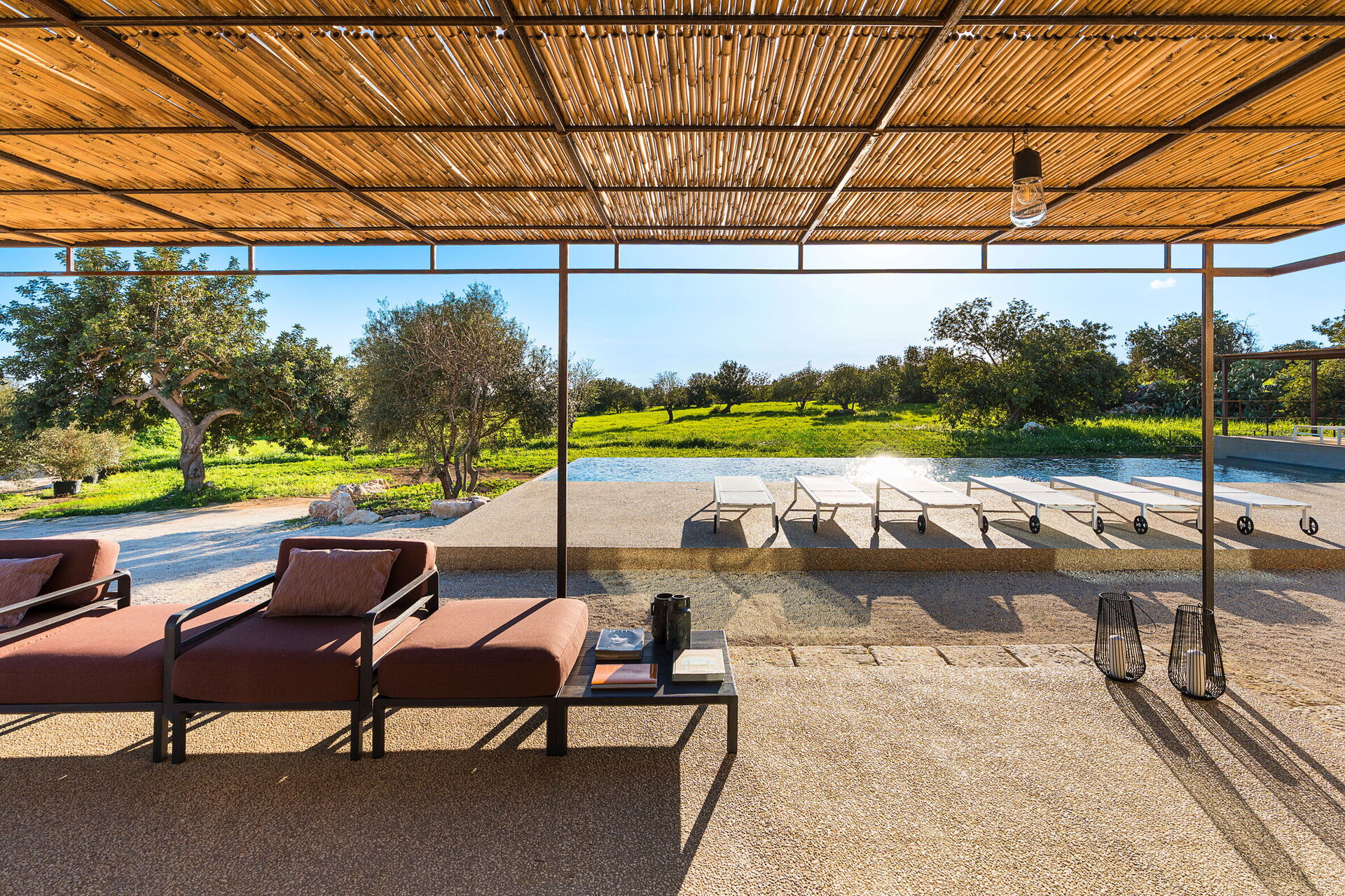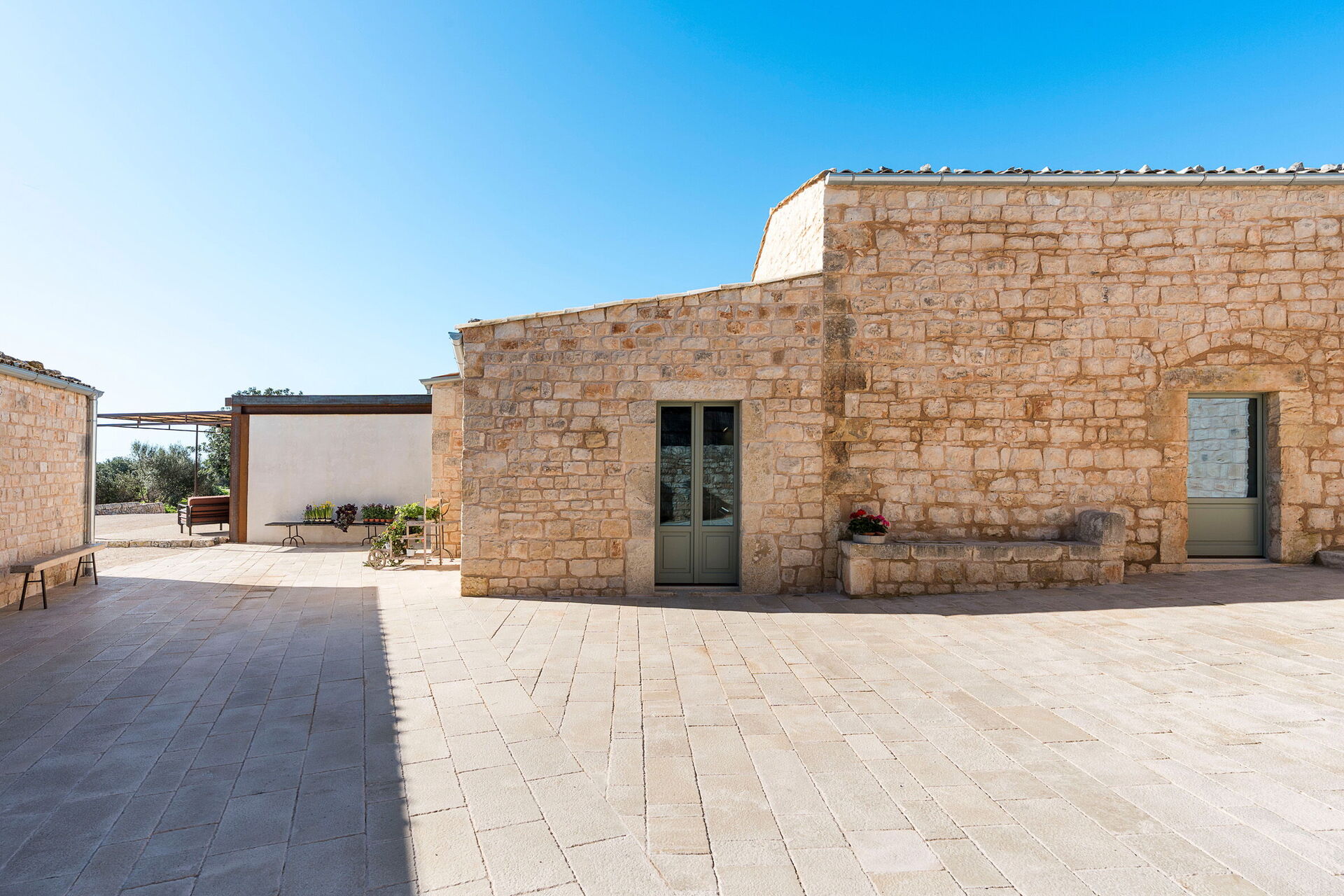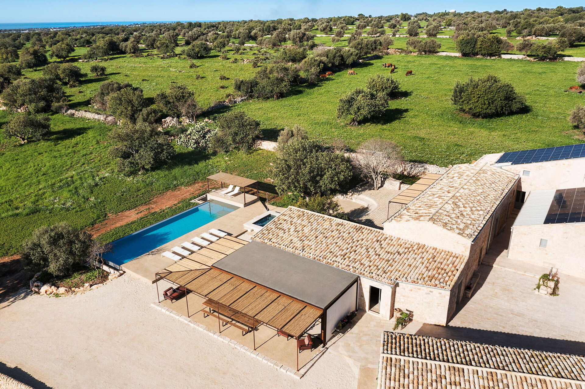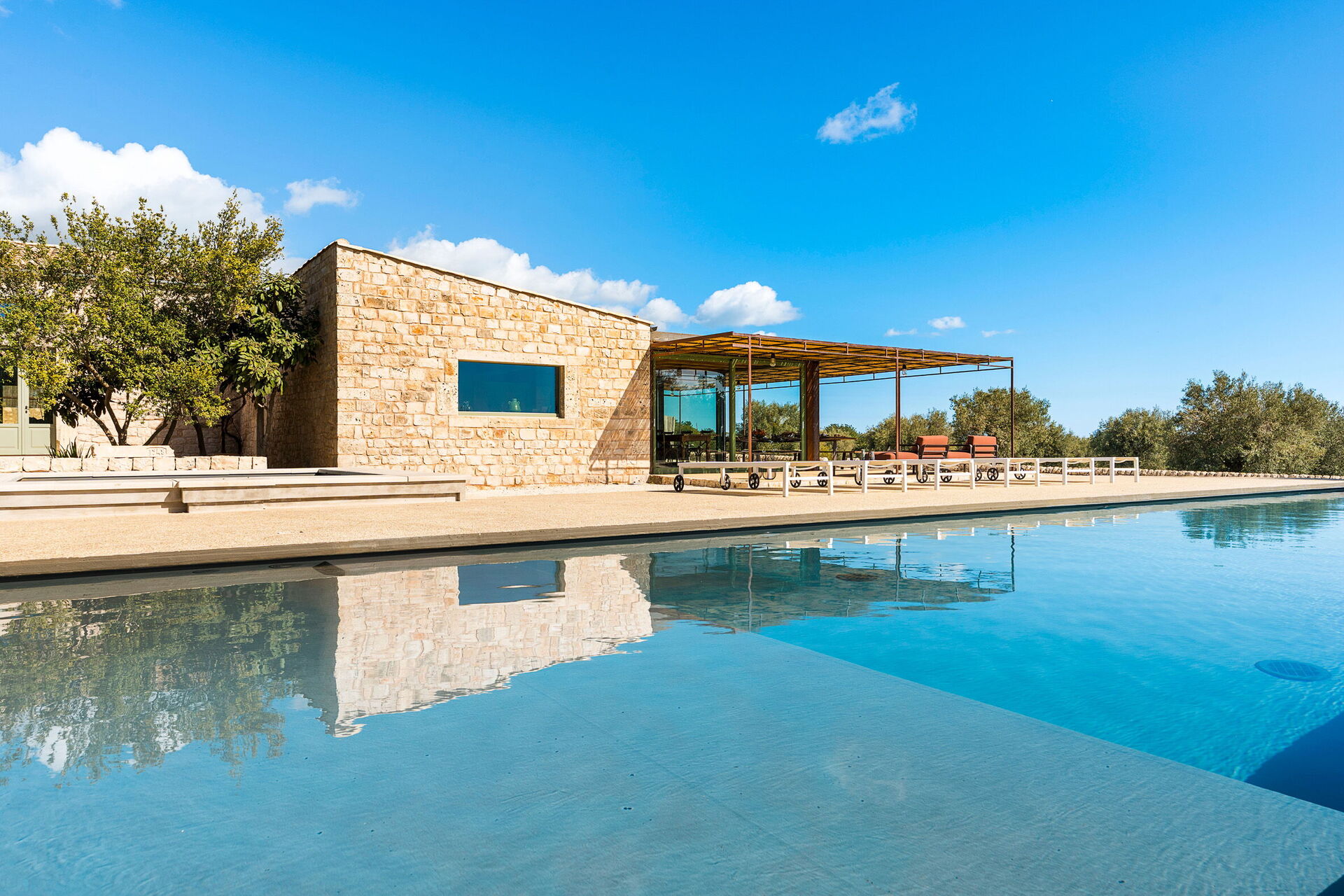 Het landgoed biedt veel buitenruimtes waar gasten tijd kunnen doorbrengen met familie of vrienden: buiten dineren, ontspannen bij het zoutwaterzwembad of op een ligbed met jacuzzi, en onvergetelijke momenten beleven in een schilderachtige omgeving onder de Siciliaanse zon.
