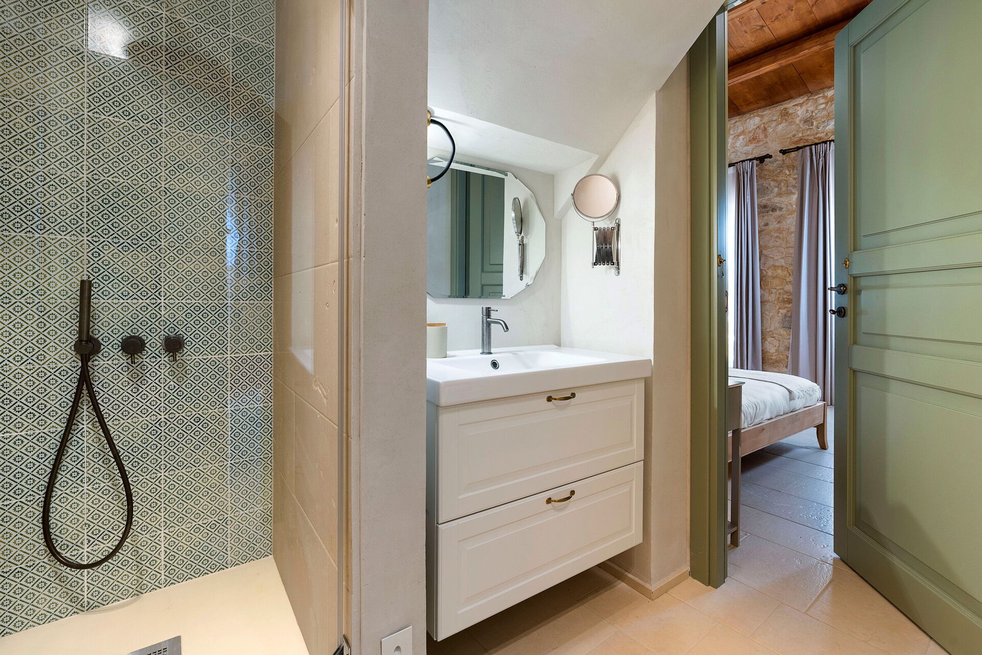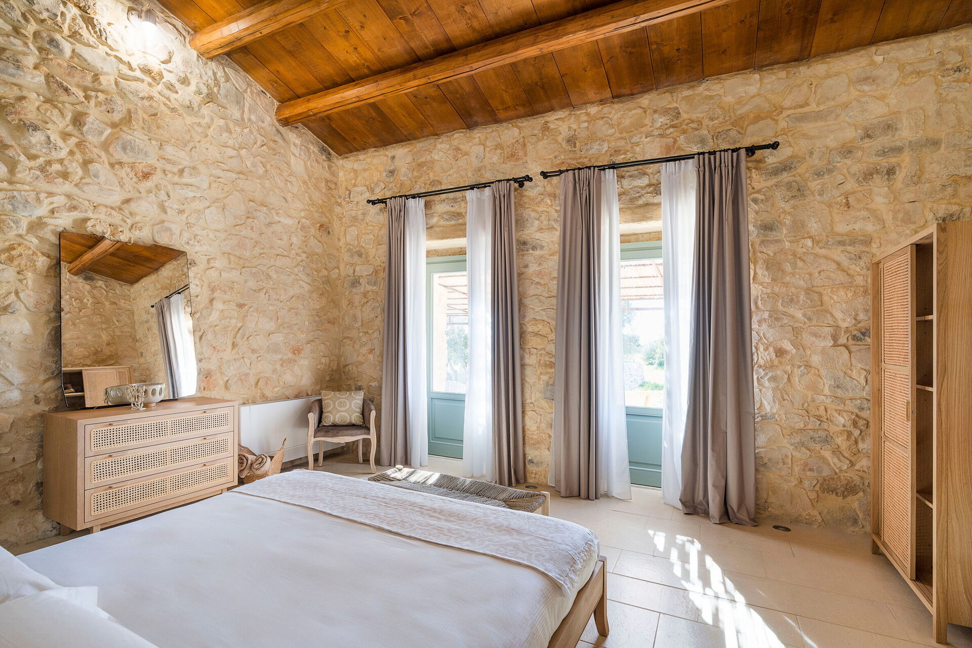 Begane grond (alleen van buitenaf toegankelijk en niet verbonden met de rest van de villa van binnenuit): 2 tweepersoonsslaapkamers (bedafmetingen: 180 x 200 cm) elk met een eigen badkamer met douche; slaapkamer met een tweepersoonsbed (bedafmetingen: 160 x 200 cm), een eenpersoonsbed en een eigen badkamer met douche; wasruimte.
