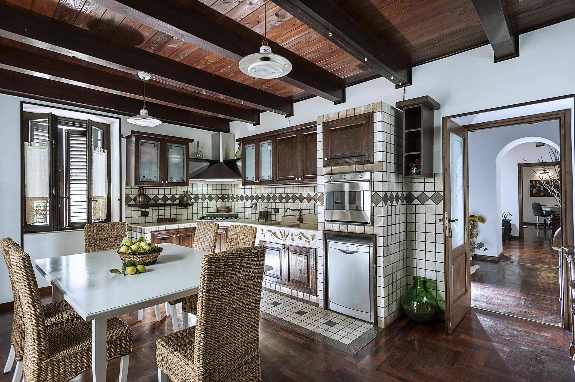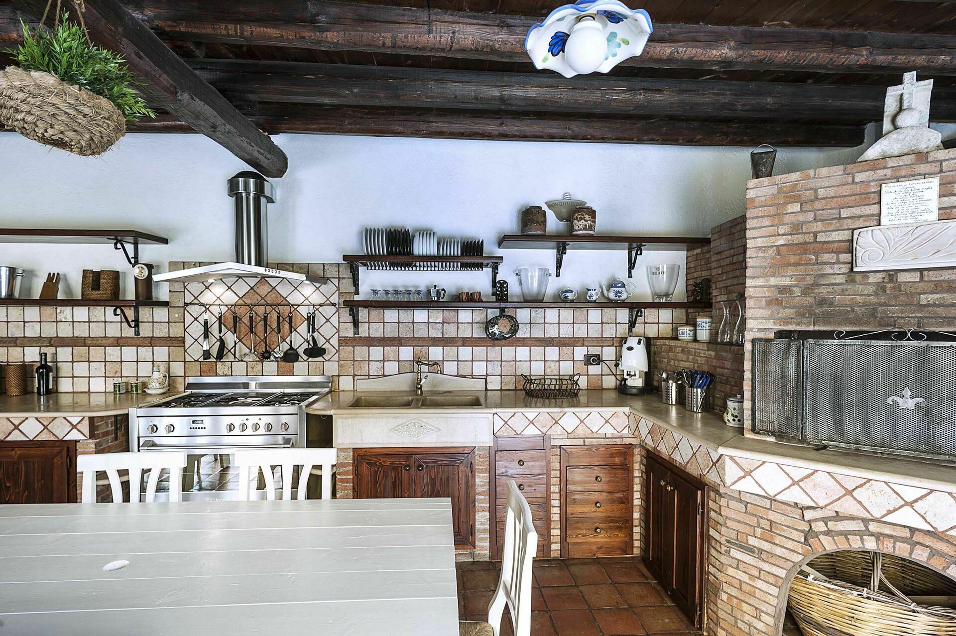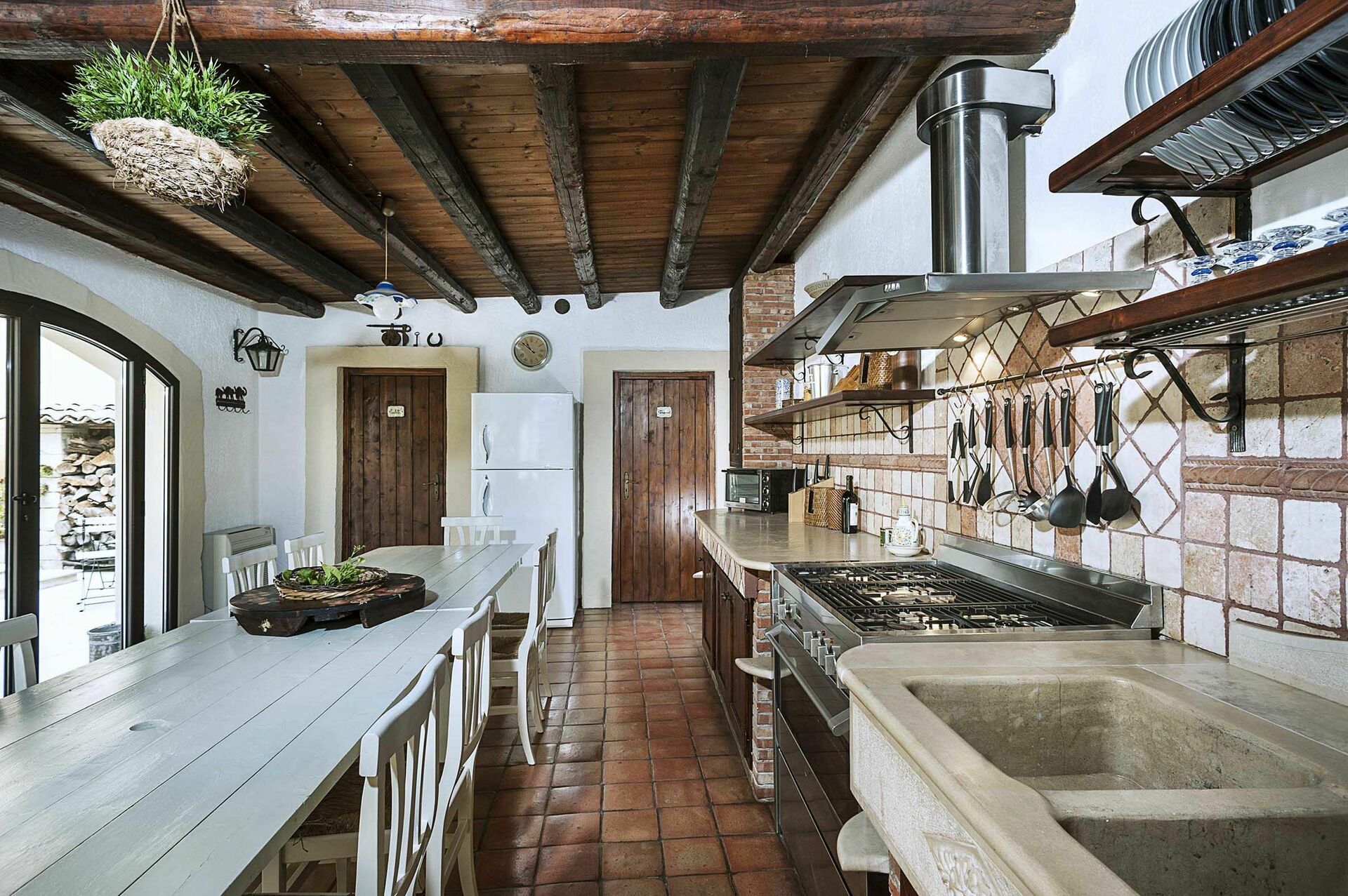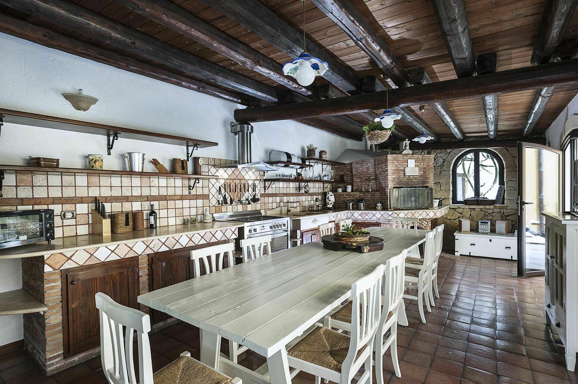 Binnen deze luxe vakantiewoning is er een grote kamer met een rustieke keuken met houtgestookte oven en een wasruimte met wasmachine.