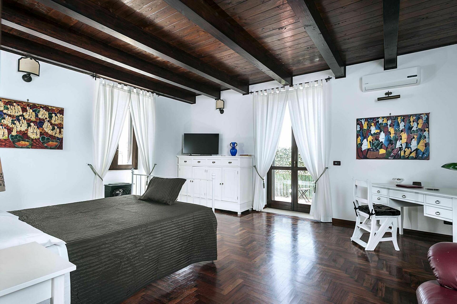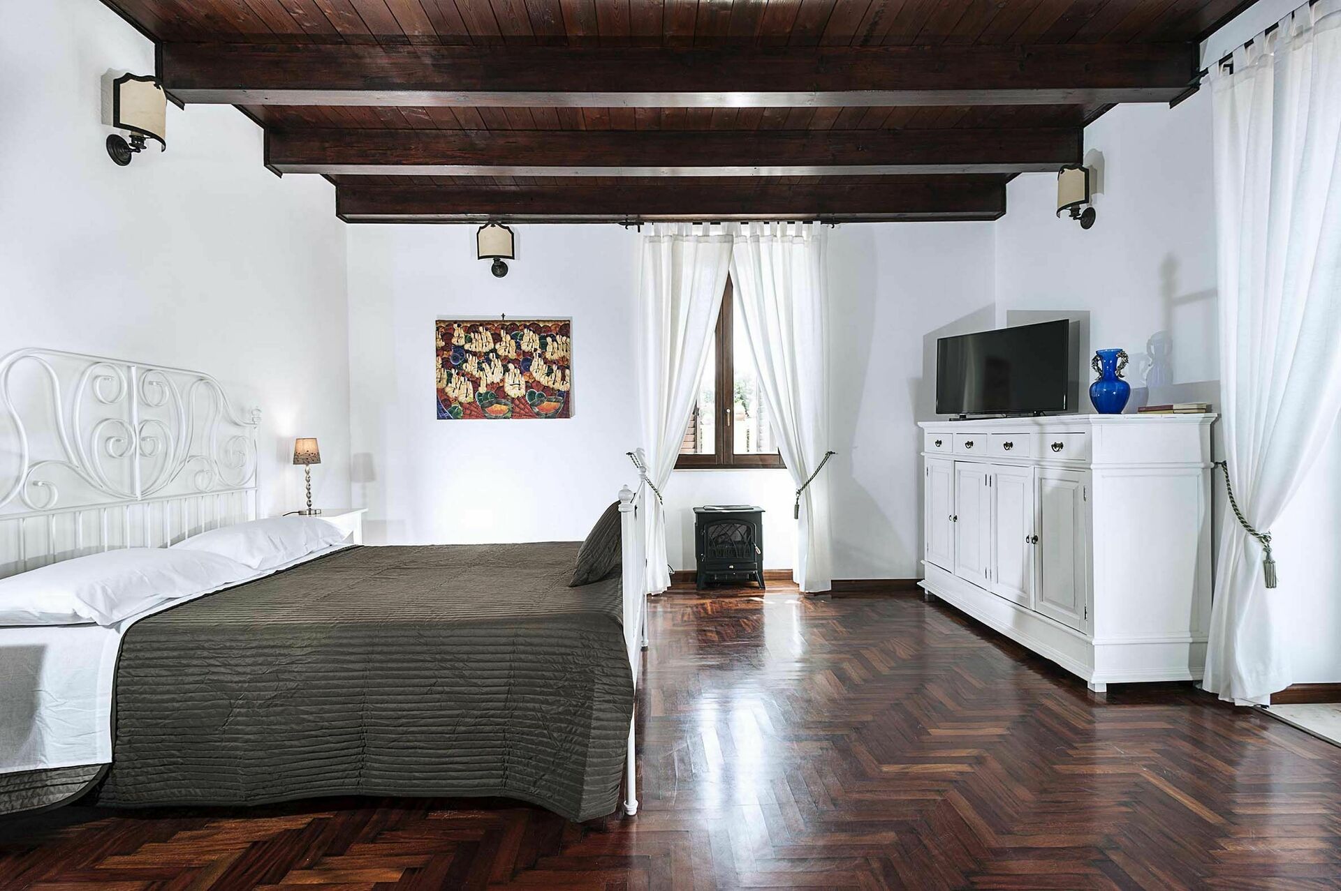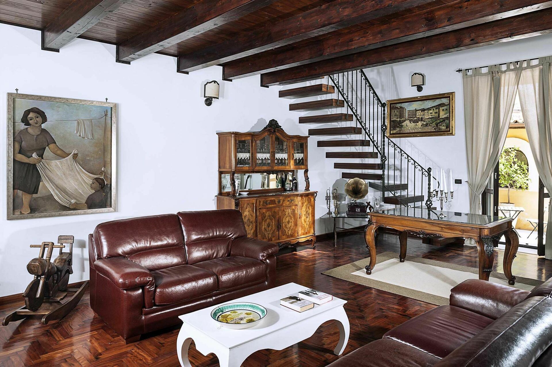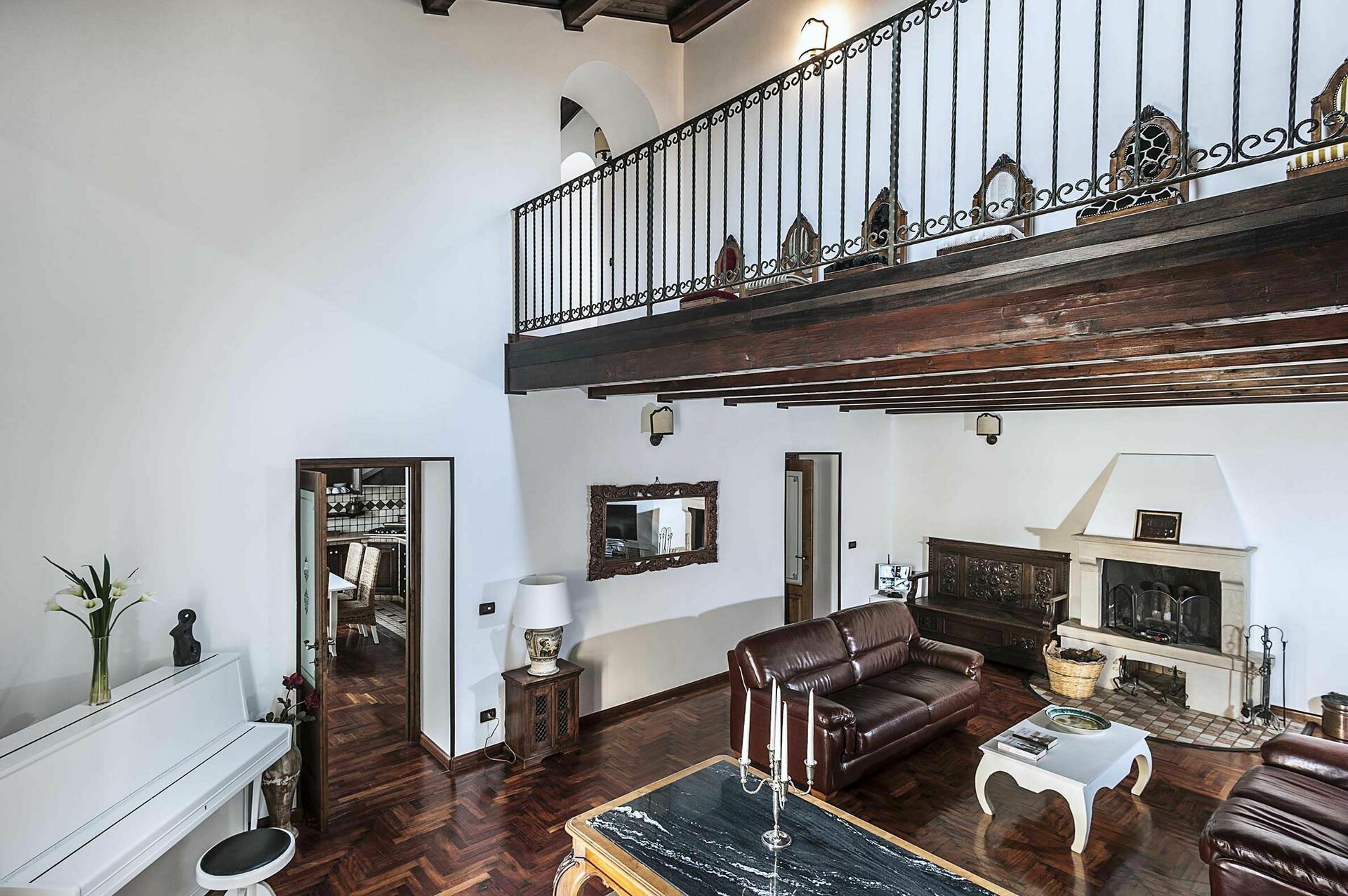 Binnen deze luxe vakantiewoning is er een grote kamer met een rustieke keuken met houtgestookte oven en een wasruimte met wasmachine.