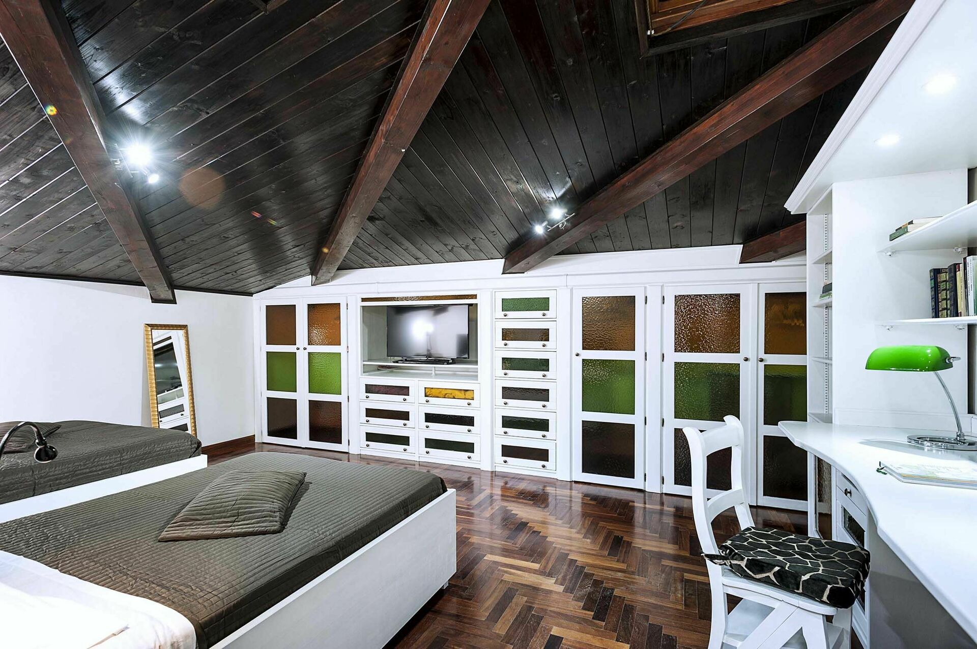 Eerste verdieping: 2 slaapkamers met tweepersoonsbed, slaapkamer met 2 grote eenpersoonsbedden, 2 badkamers met douche.