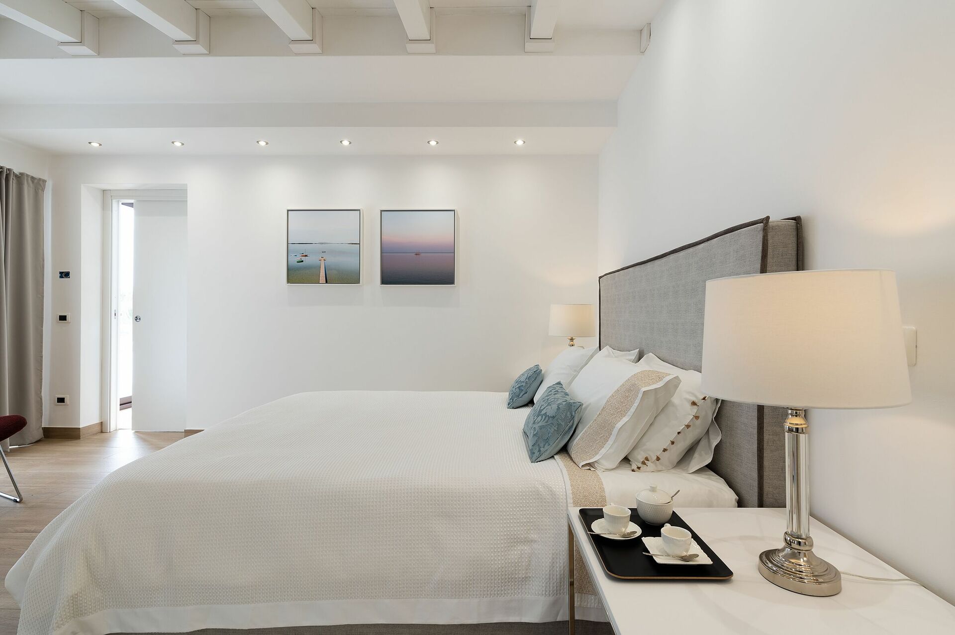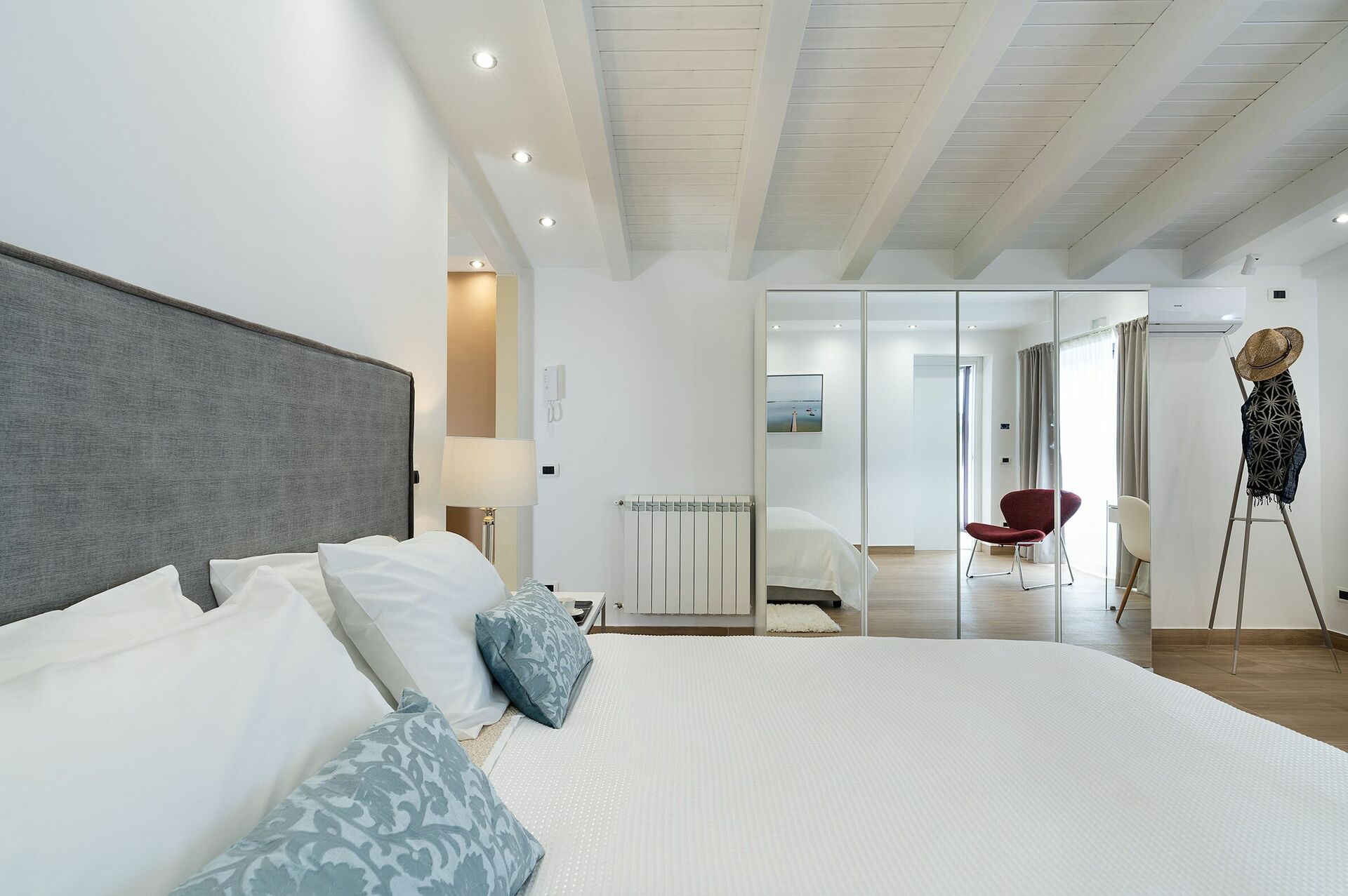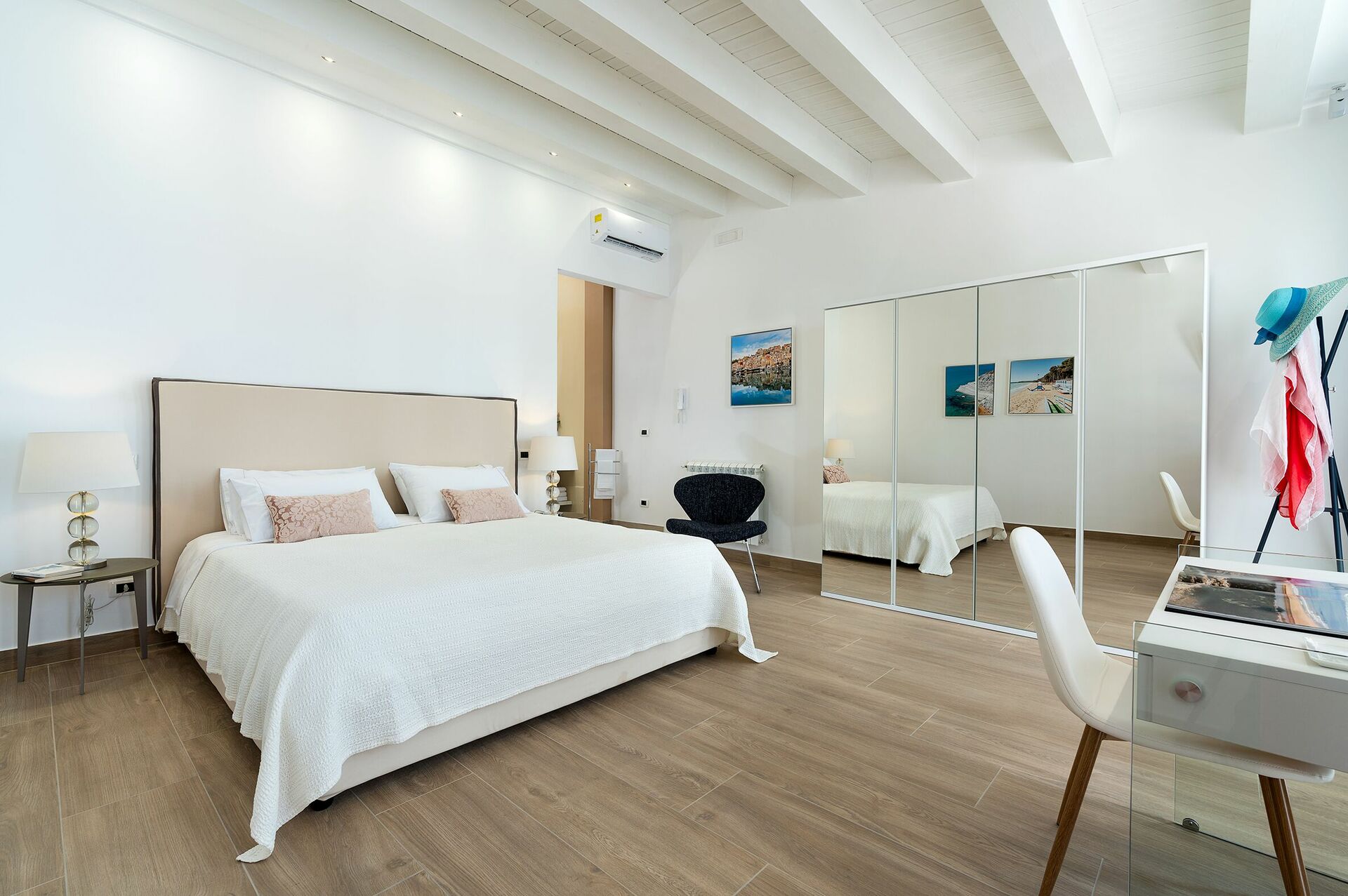 Eerste verdieping: slaapkamer met eigen badkamer met douche verbonden met een panoramisch balkon.
