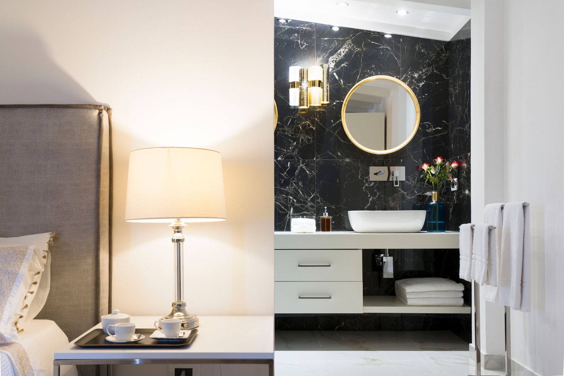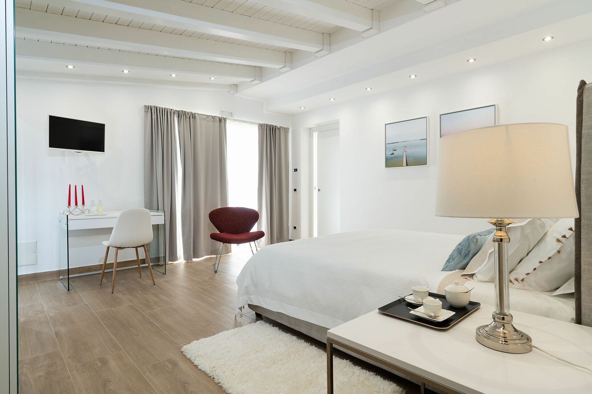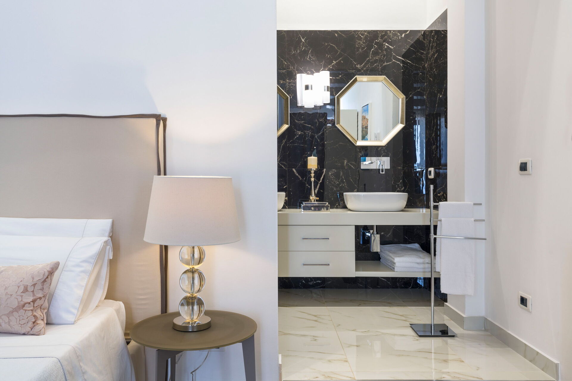 Eerste verdieping: slaapkamer met eigen badkamer met douche verbonden met een panoramisch balkon.
