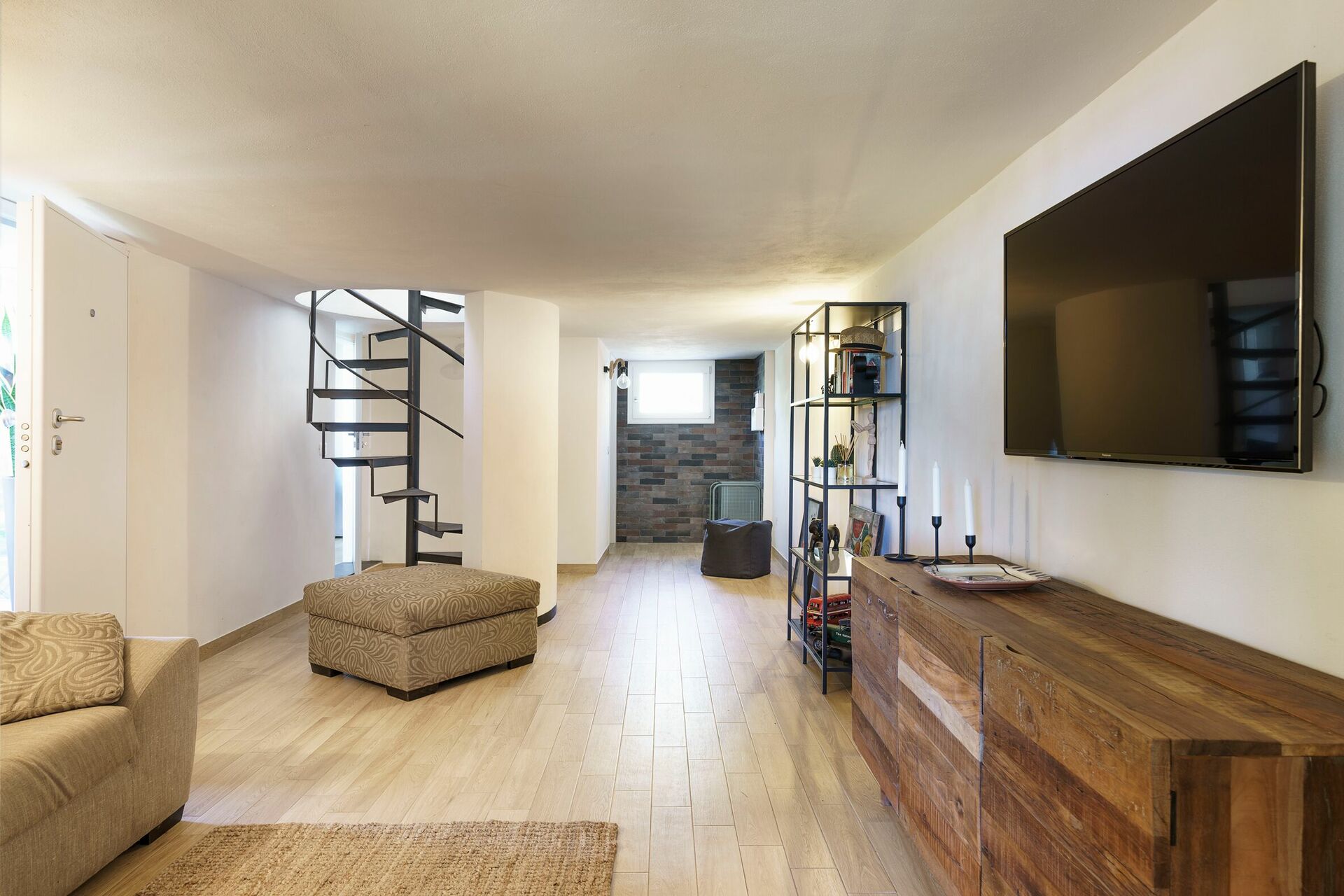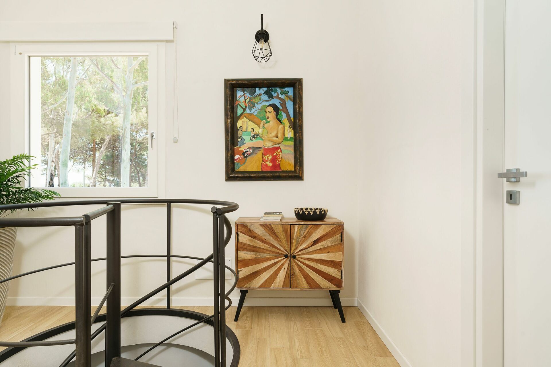 Binnen heeft het huis twee verdiepingen die binnen door een wenteltrap met elkaar verbonden zijn, en ook buiten.