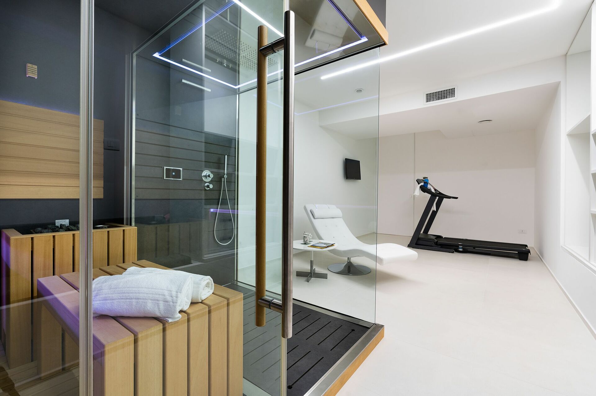 - wellnessruimte met sauna en een loopband