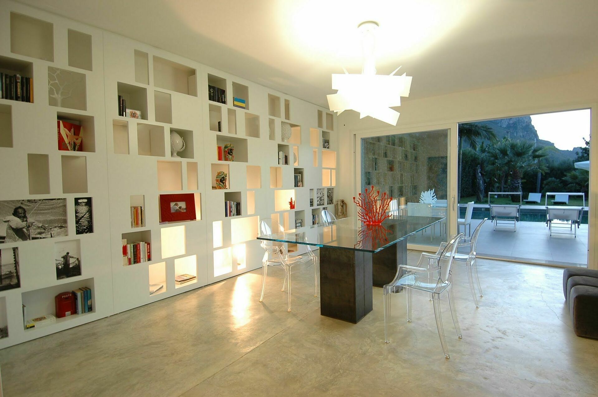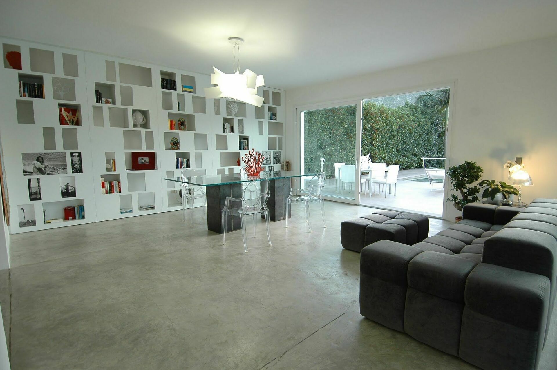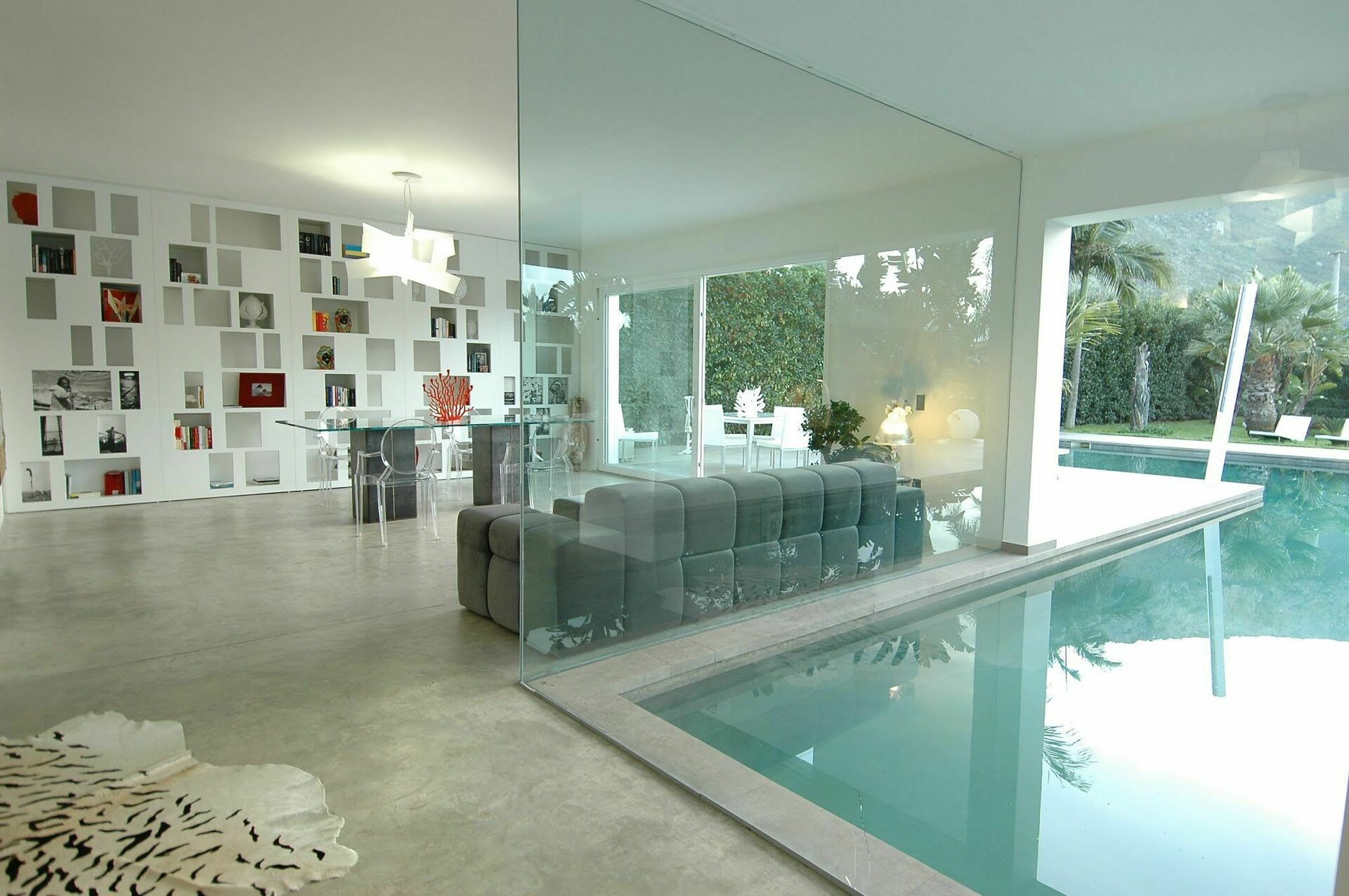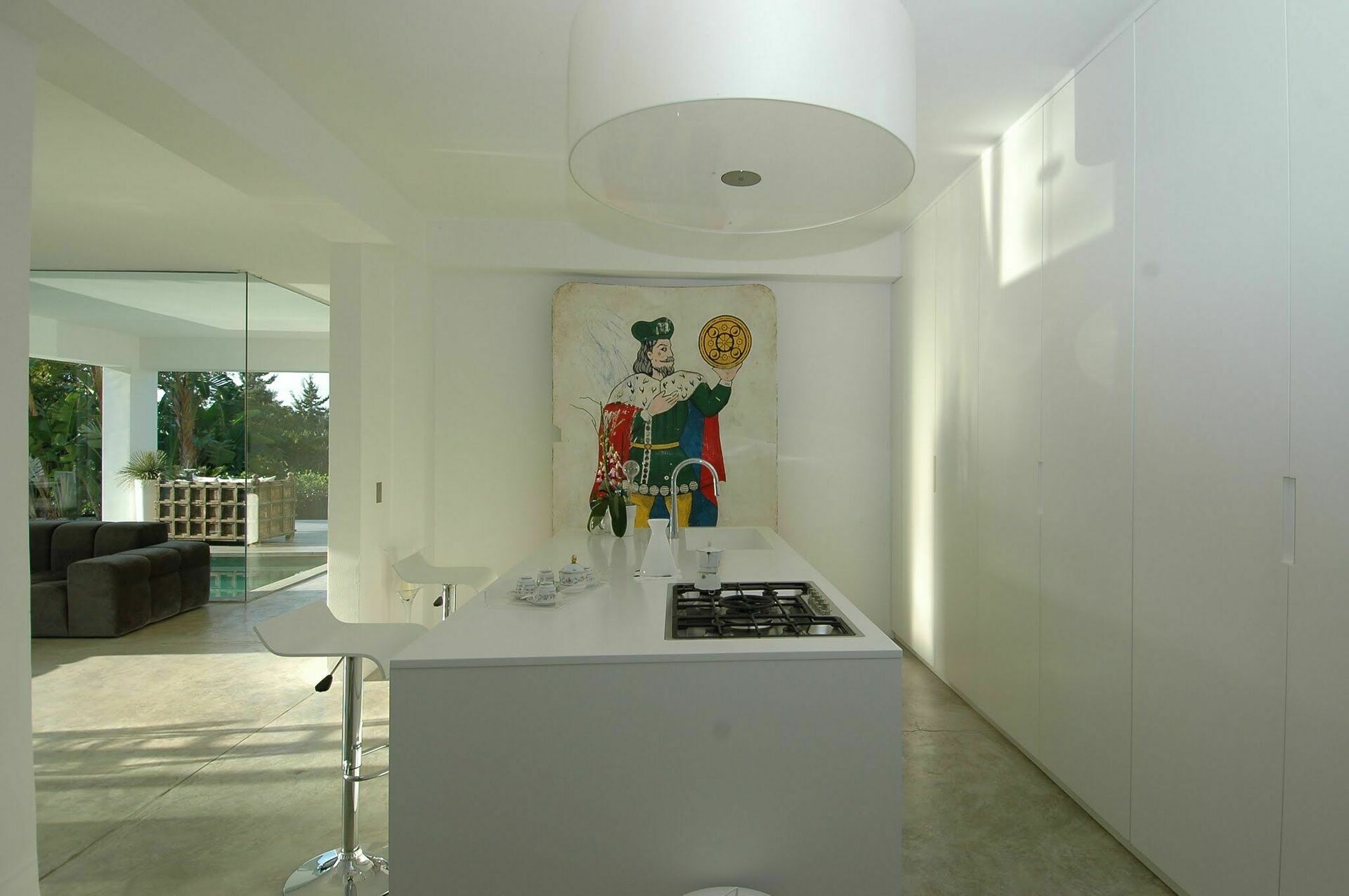 De grote woonkamer creëert een vloeiende open ruimte, benadrukt door de natuurlijke betonnen vloer en de grote ramen die de binnenruimte opnieuw definiëren zodat deze één wordt met de buitenkant. Hierdoor kunt u genieten van het uitzicht op het zwembad en lijkt het alsof het doorloopt in de woonkamer.