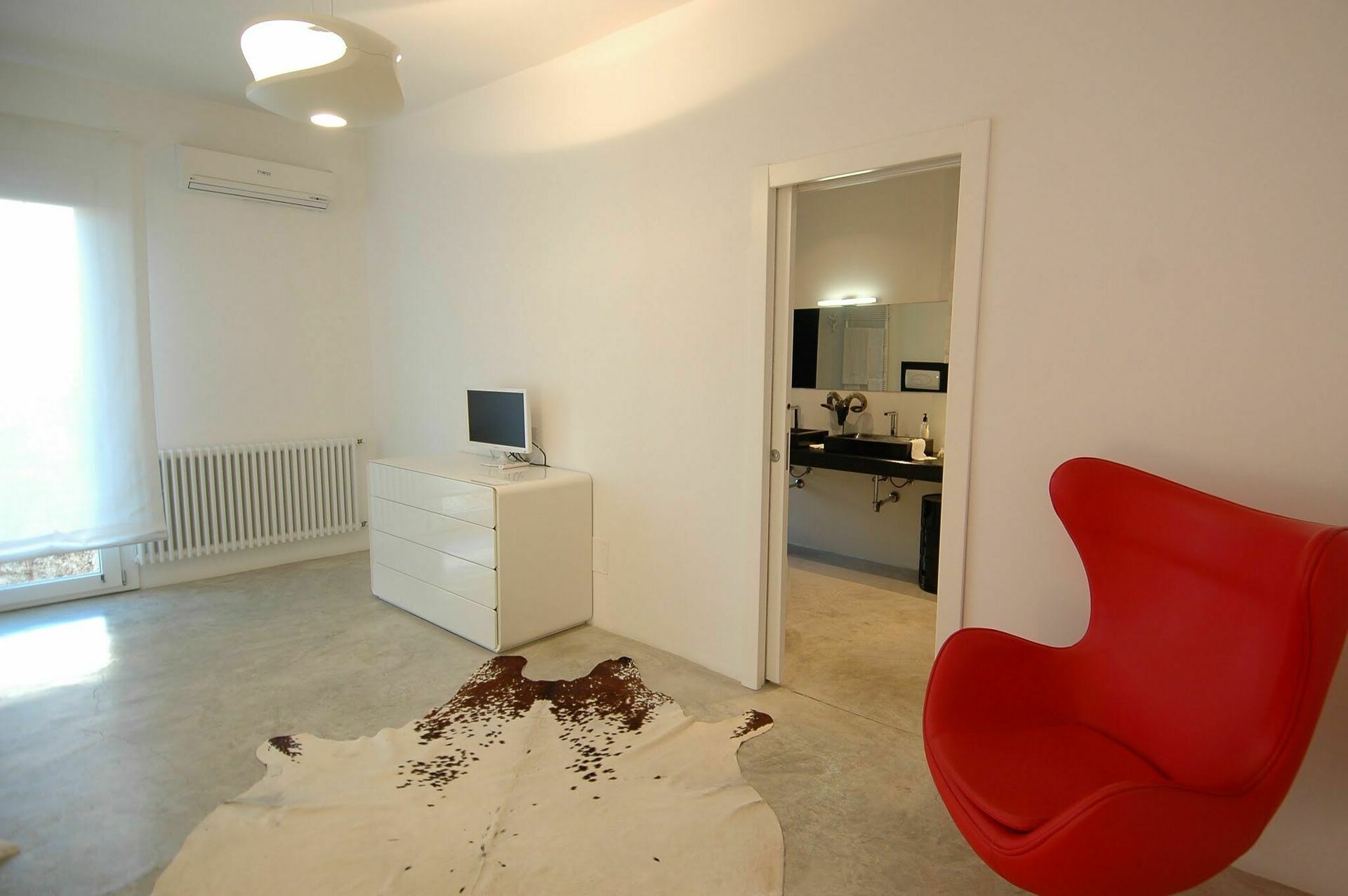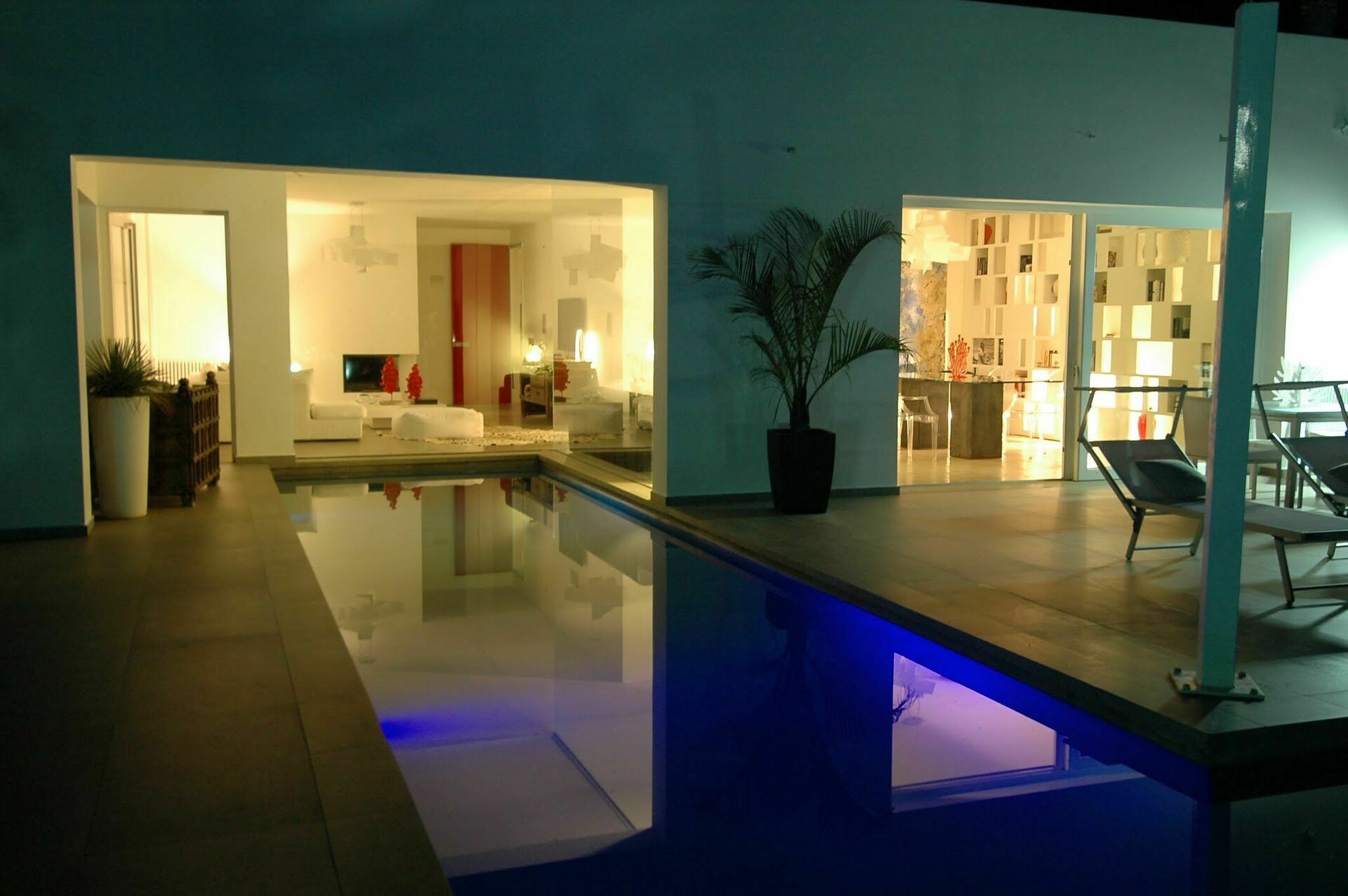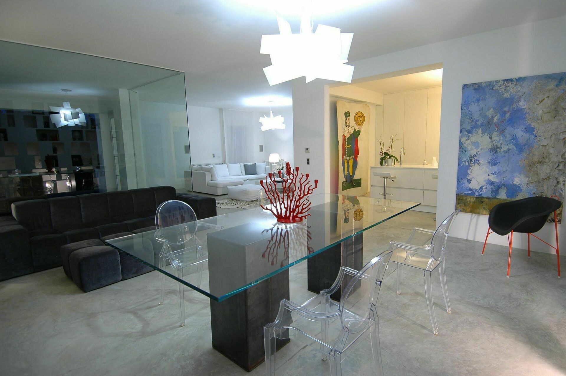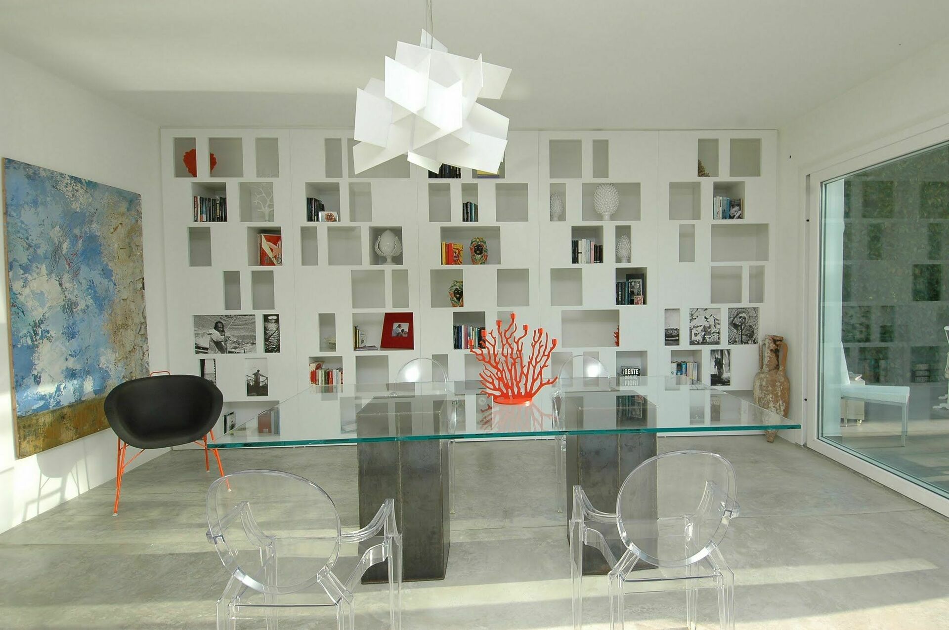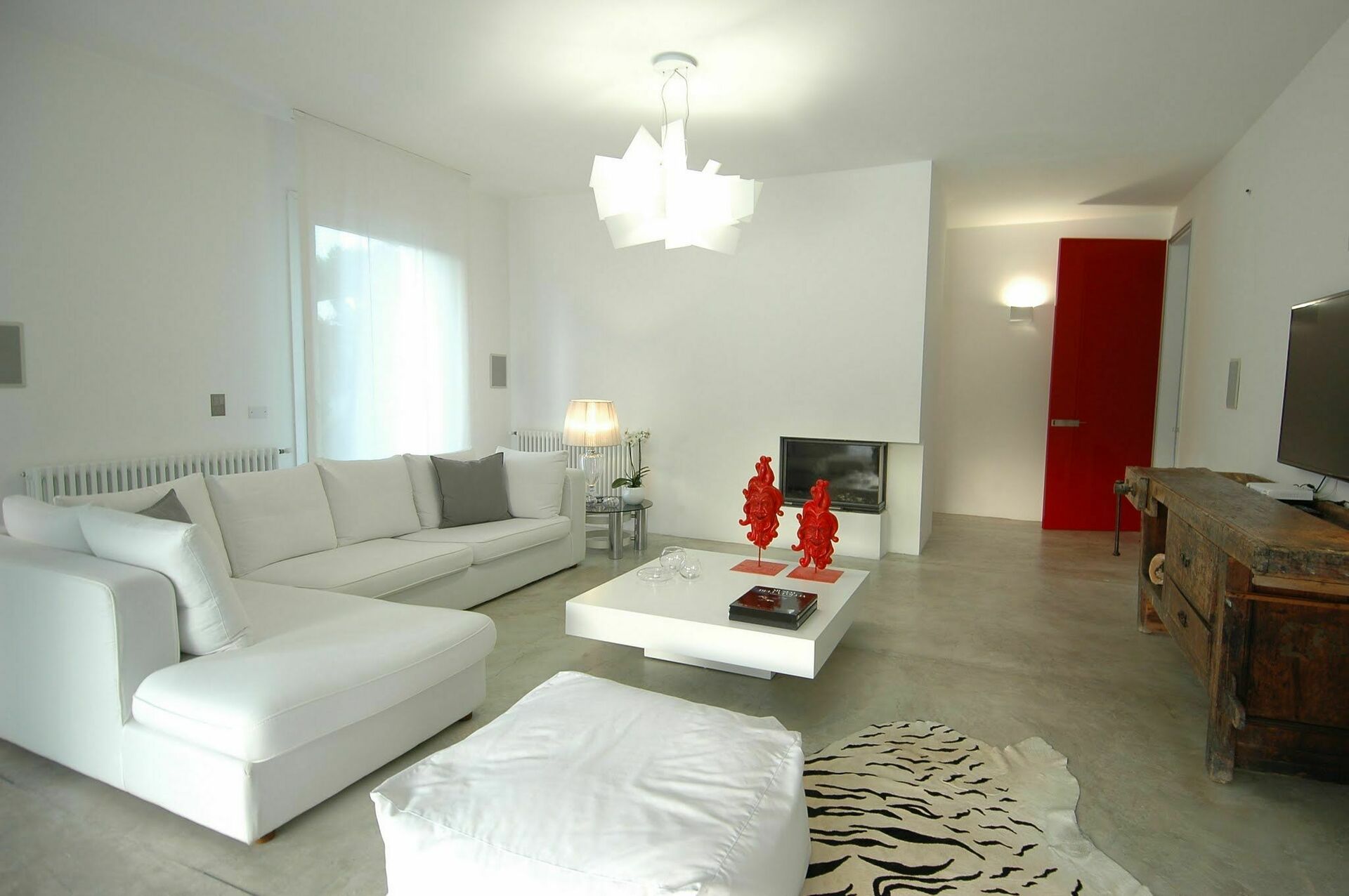 De grote woonkamer creëert een vloeiende open ruimte, benadrukt door de natuurlijke betonnen vloer en de grote ramen die de binnenruimte opnieuw definiëren zodat deze één wordt met de buitenkant. Hierdoor kunt u genieten van het uitzicht op het zwembad en lijkt het alsof het doorloopt in de woonkamer.