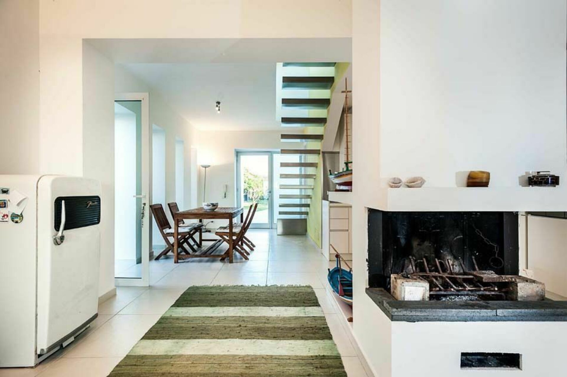 Op de begane grond bevinden zich een lichte woonkamer met open haard en eethoek, een keuken en een toilet. Vanuit de woonkamer leidt een zwevende trap naar de eerste verdieping met schuine plafonds, die drie slaapkamers en twee badkamers omvat.