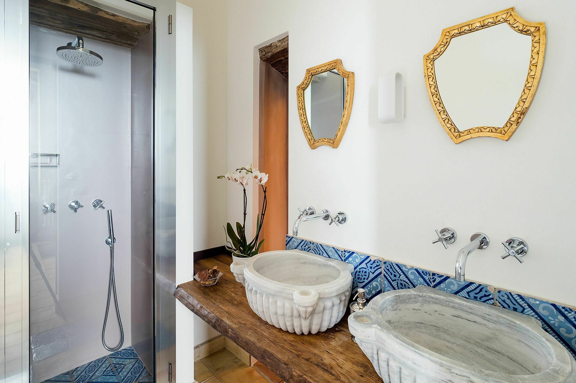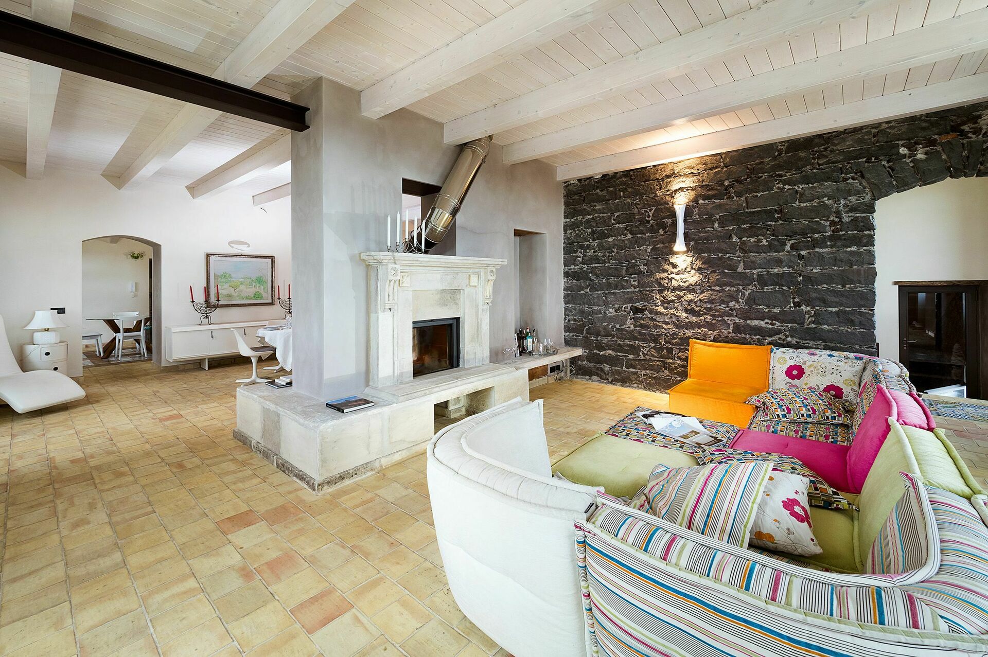 Deze stijlvolle interieurs combineren moderne kenmerken met traditionele elementen en omvatten op de begane grond van het landhuis een woonkamer met een lounge, een eetkamer, een keuken en een gastenbadkamer. Op de eerste verdieping zijn drie slaapkamers met en-suite badkamers en op de benedenverdieping, in de voormalige wijnperskamer, bevindt zich de wellnessruimte. De twee bijgebouwen herbergen respectievelijk een suite met een tweepersoonsbed op de zolder (Casetta) en een tweepersoonskamer (Dependance), beide met en-suite badkamers.