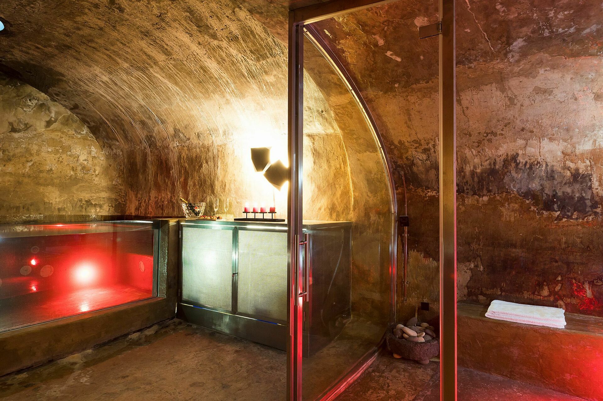 Benedenverdieping: wellnessruimte met jacuzzi, zoutgrot, sauna, Turks stoombad, multisensorische douche, ontspanningsruimte