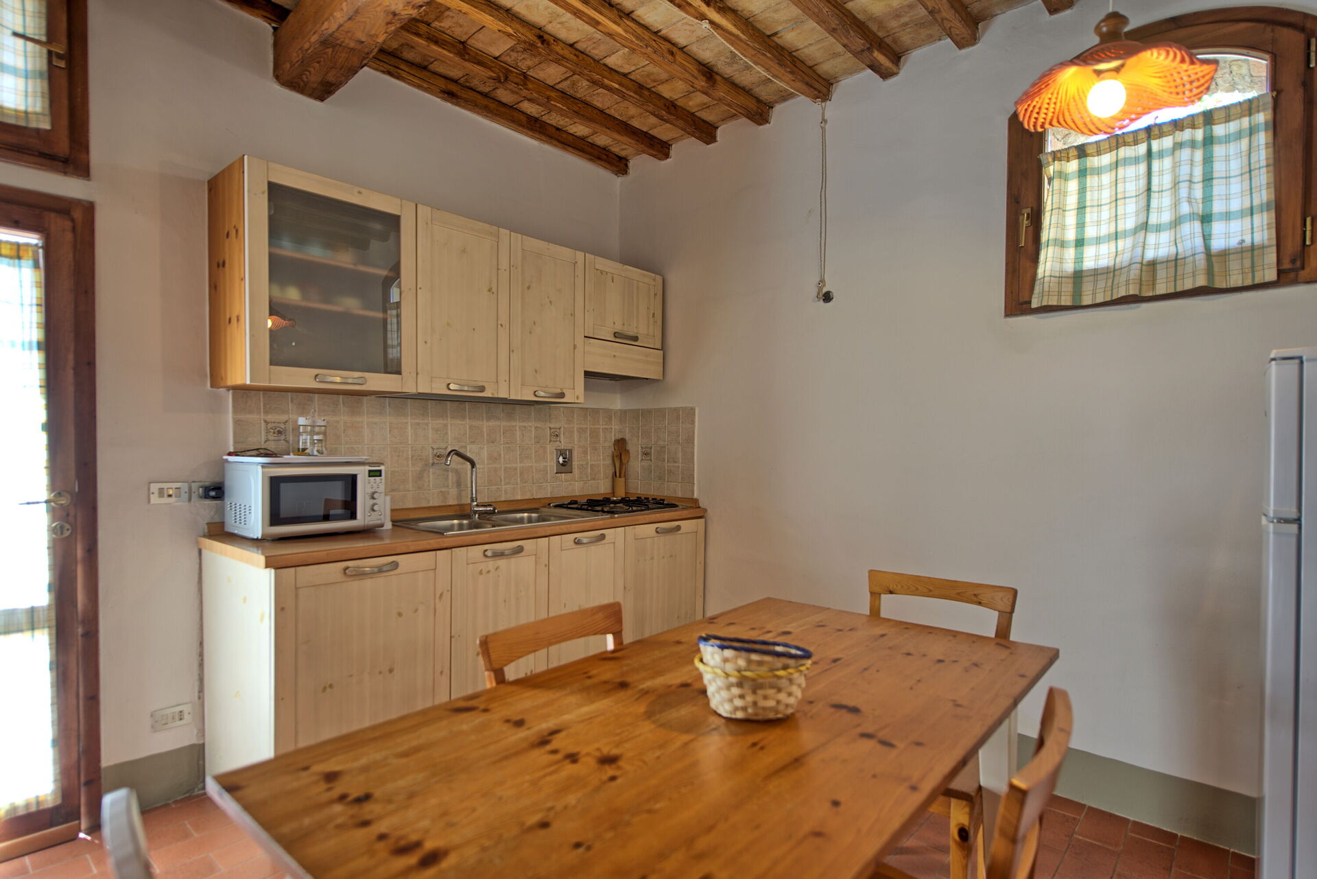 Begane grond (toegang vanaf het terras): kleine keuken (TV, koelkast, kookplaat, magnetron) met eettafel, slaapkamer met tweepersoonsbed (airconditioning), open naar de woonkamer, badkamer met douche.