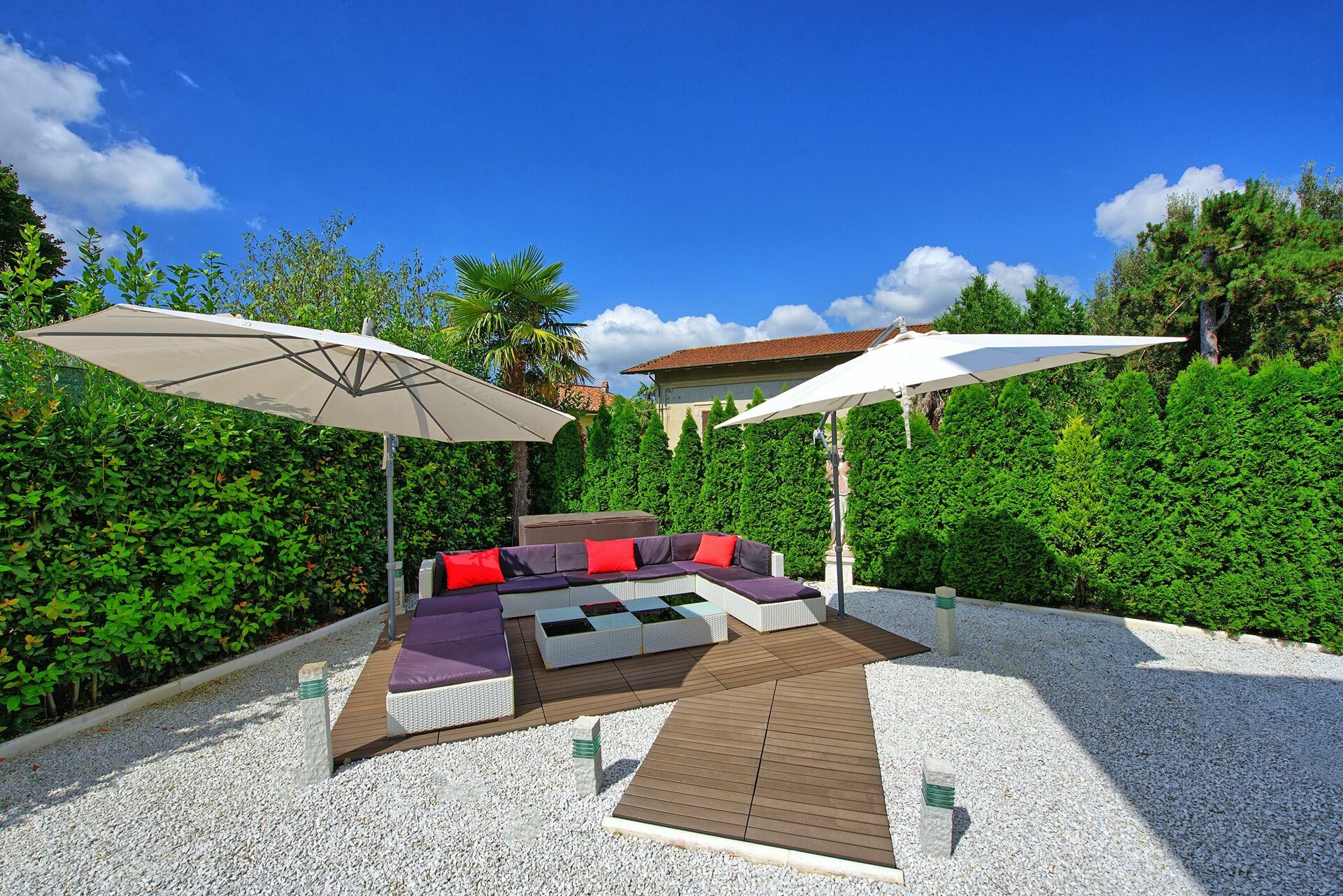De villa is omgeven door een zeer goed onderhouden tuin met comfortabel uitgeruste buitenruimtes (barbecue, banken, ligbedden, tafels en stoelen om buiten te kunnen eten) en een mooi privé zwembad.