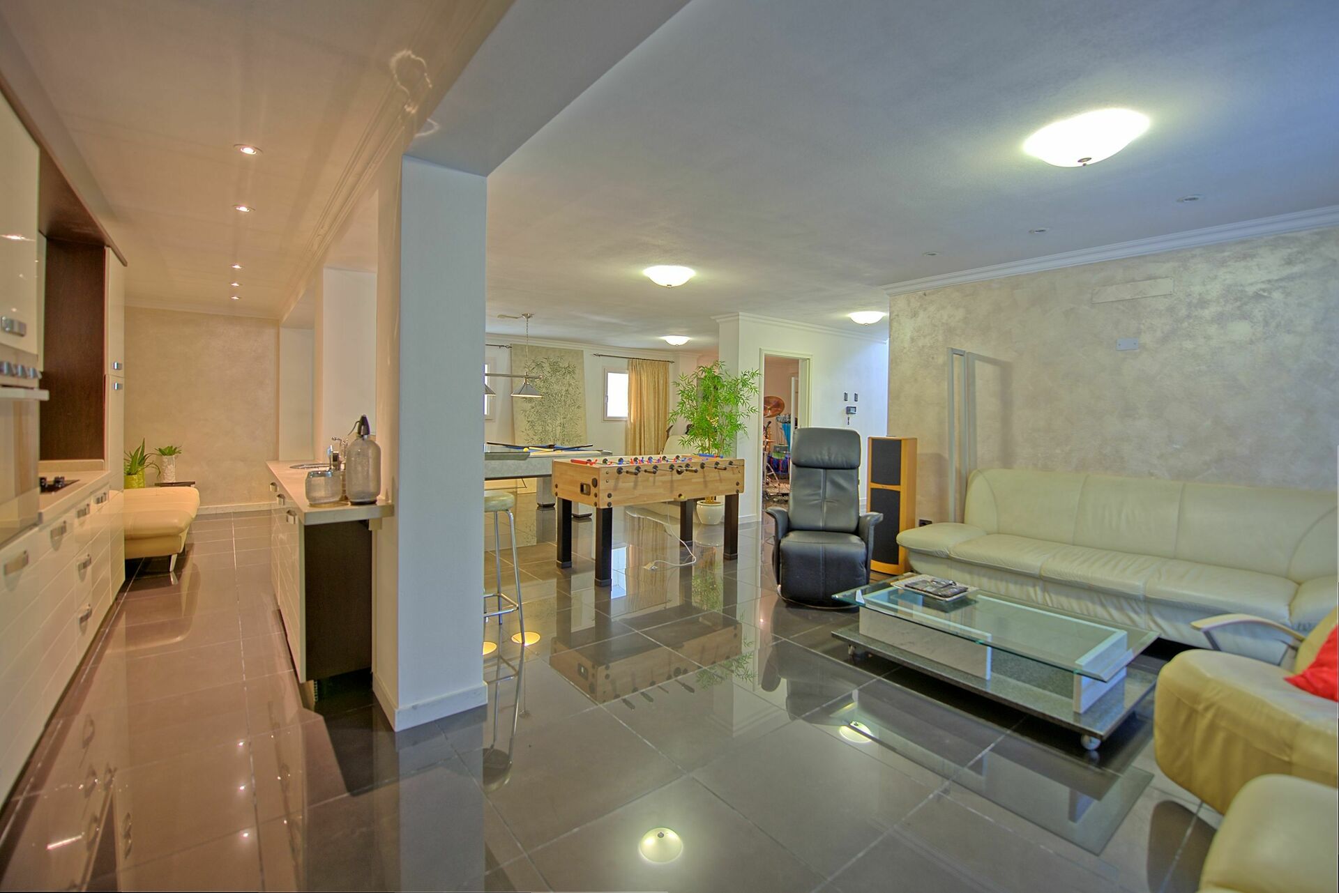 Onder verdieping (ook van buiten toegankelijk): woonkamer met kookhoek (oven, vriezer, vaatwasser), ruimte met bioscoop en dolby surround systeem, tafelvoetbaltafel, biljarttafel, muziekinstrumenten (slagwerk, keyboard, microfoon), wasruimte (wasmachine en wasdroger), badkamer met douche.