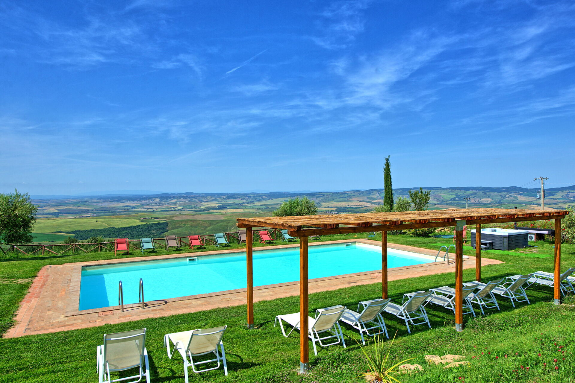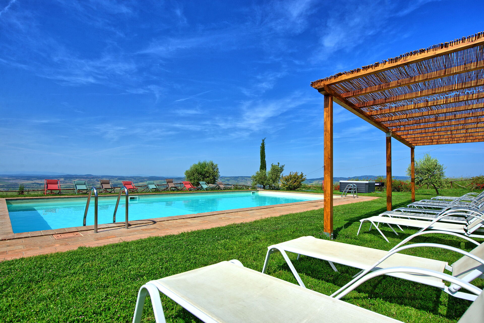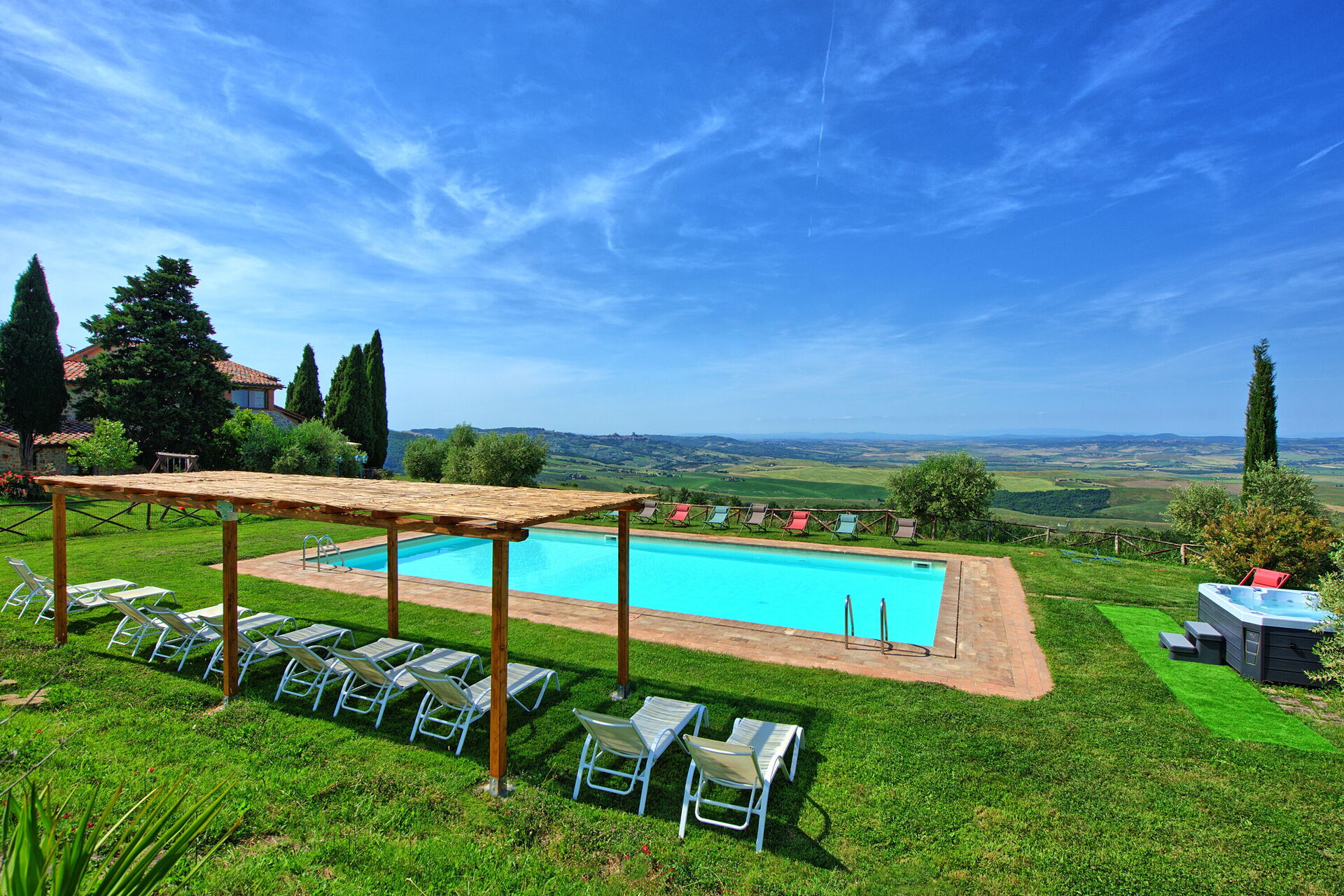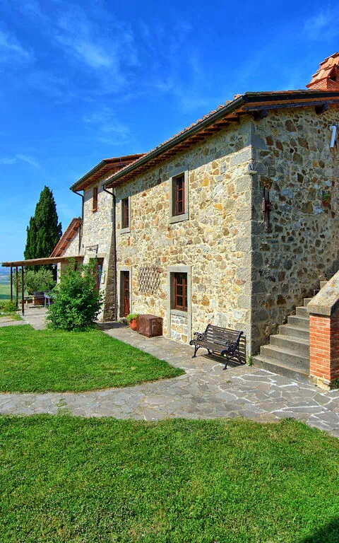 Vakantievilla met een privé zwembad en Jacuzzi in de Val D’Orcia, omgeven door een grote tuin en een panoramisch uitzicht over de vallei.
