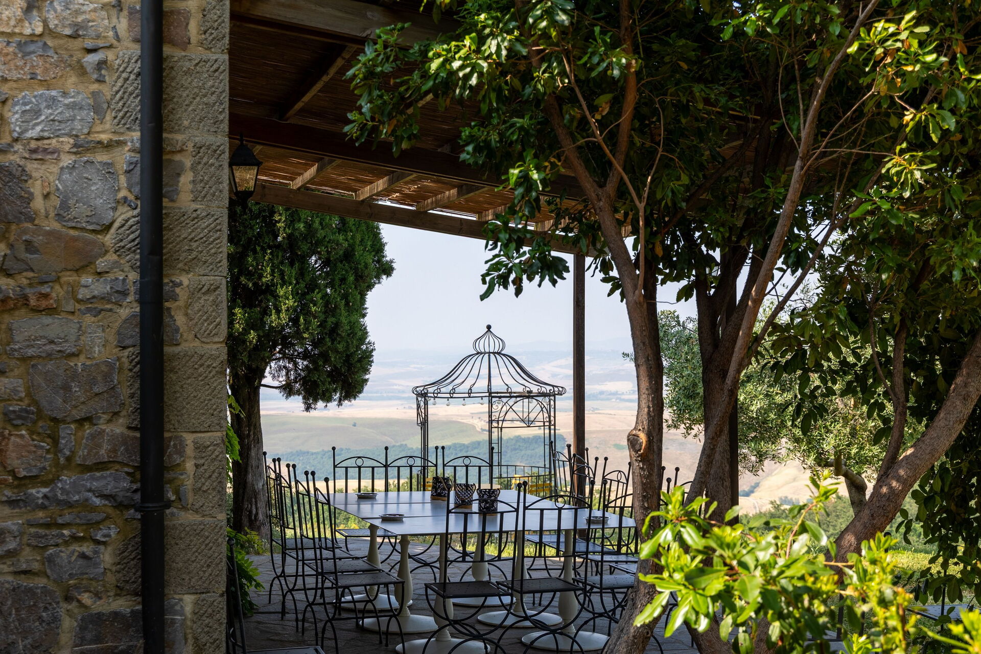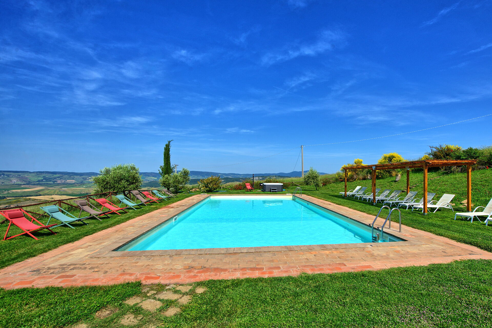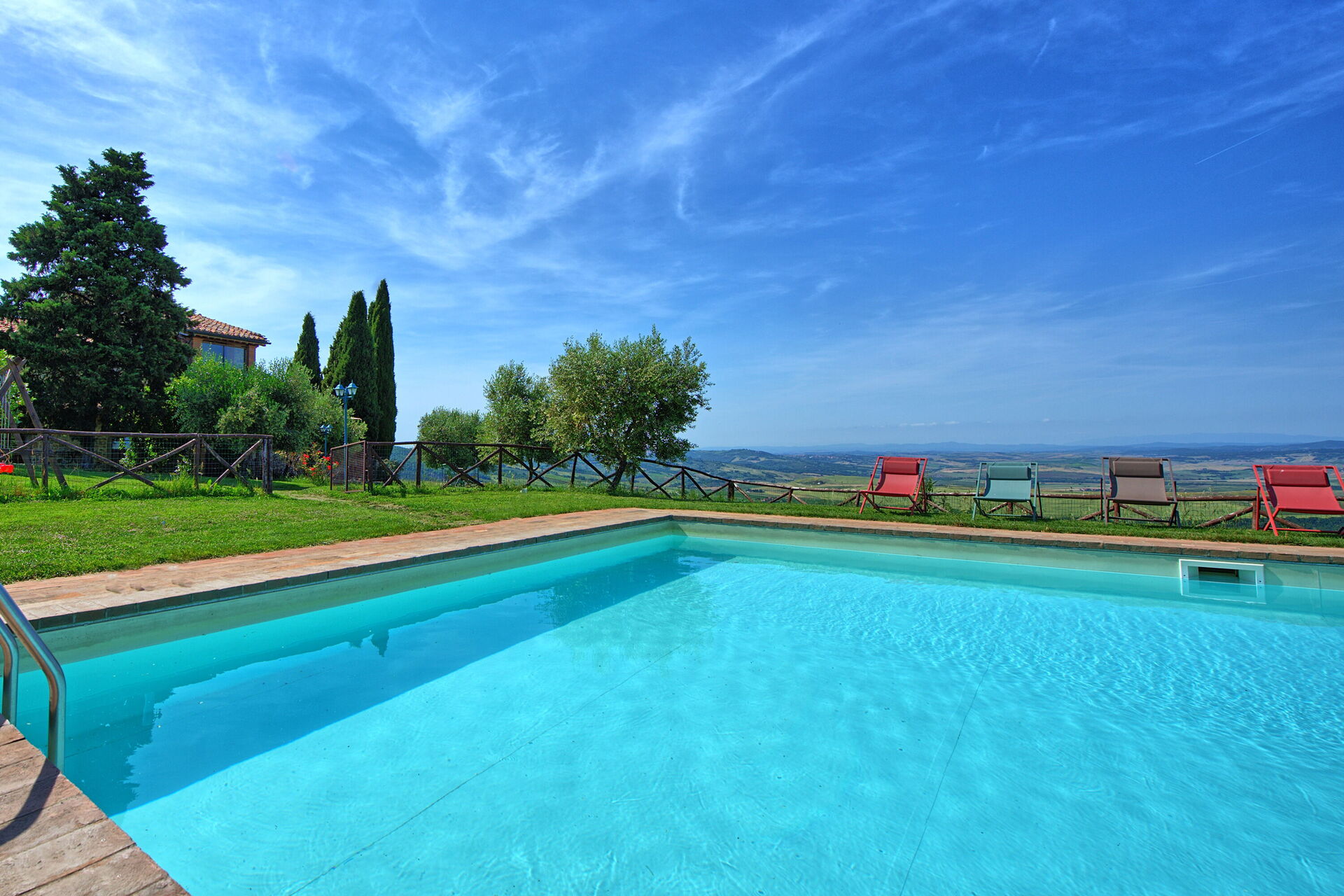 Vakantievilla met een privé zwembad en Jacuzzi in de Val D’Orcia, omgeven door een grote tuin en een panoramisch uitzicht over de vallei.