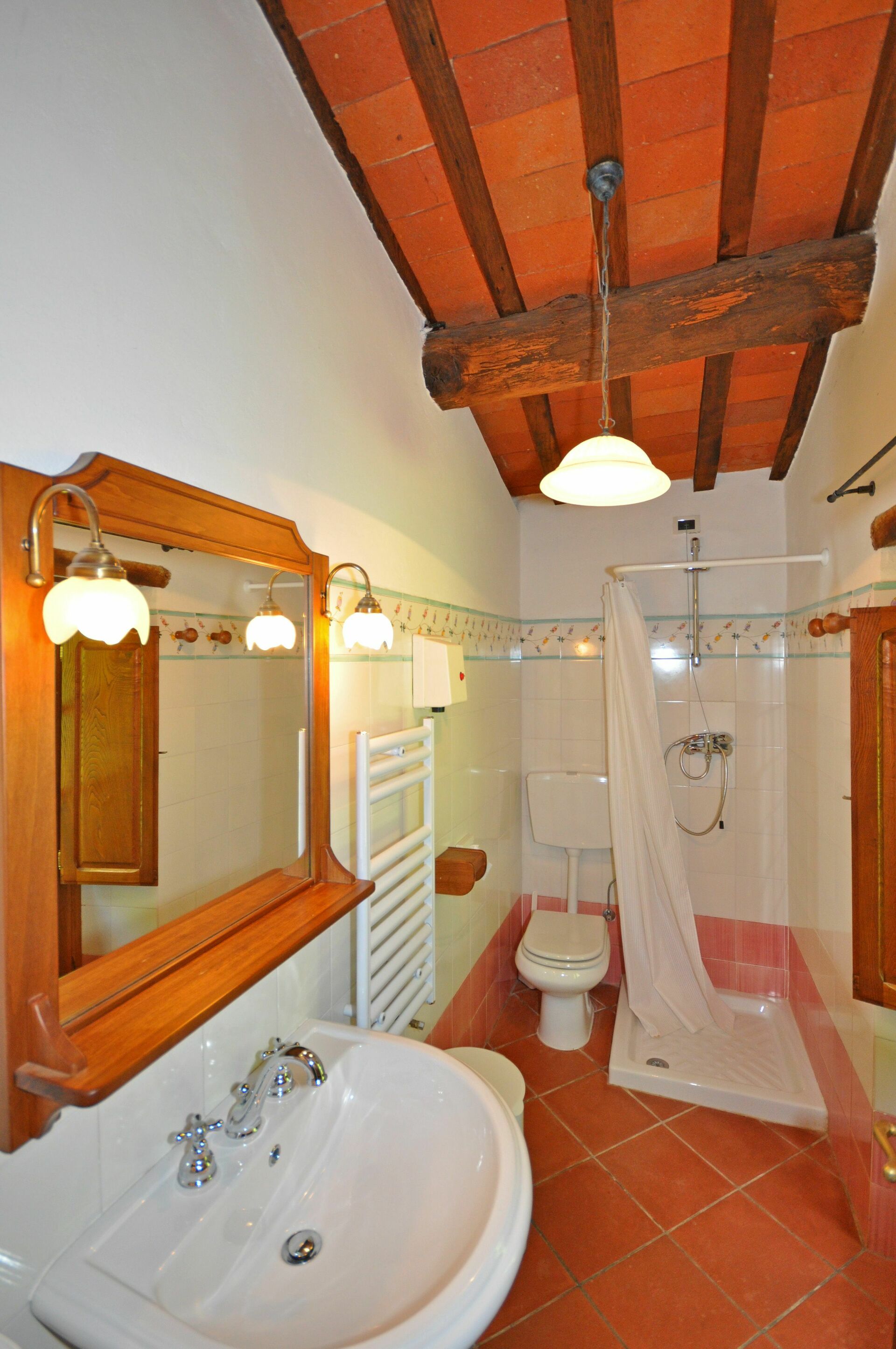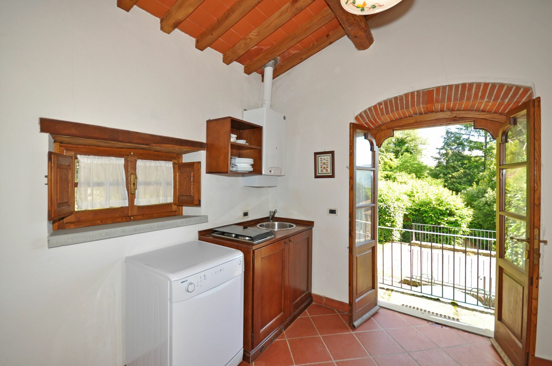 1° verdieping (toegang over een privé terras): keukenhoek (vaatwasser, vriezer, 2 elektrische kookplaten), badkamer met bad (haardroger).