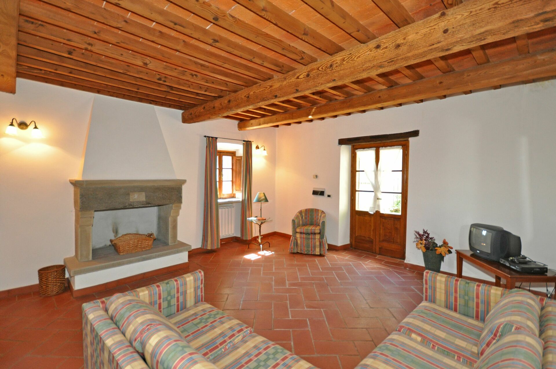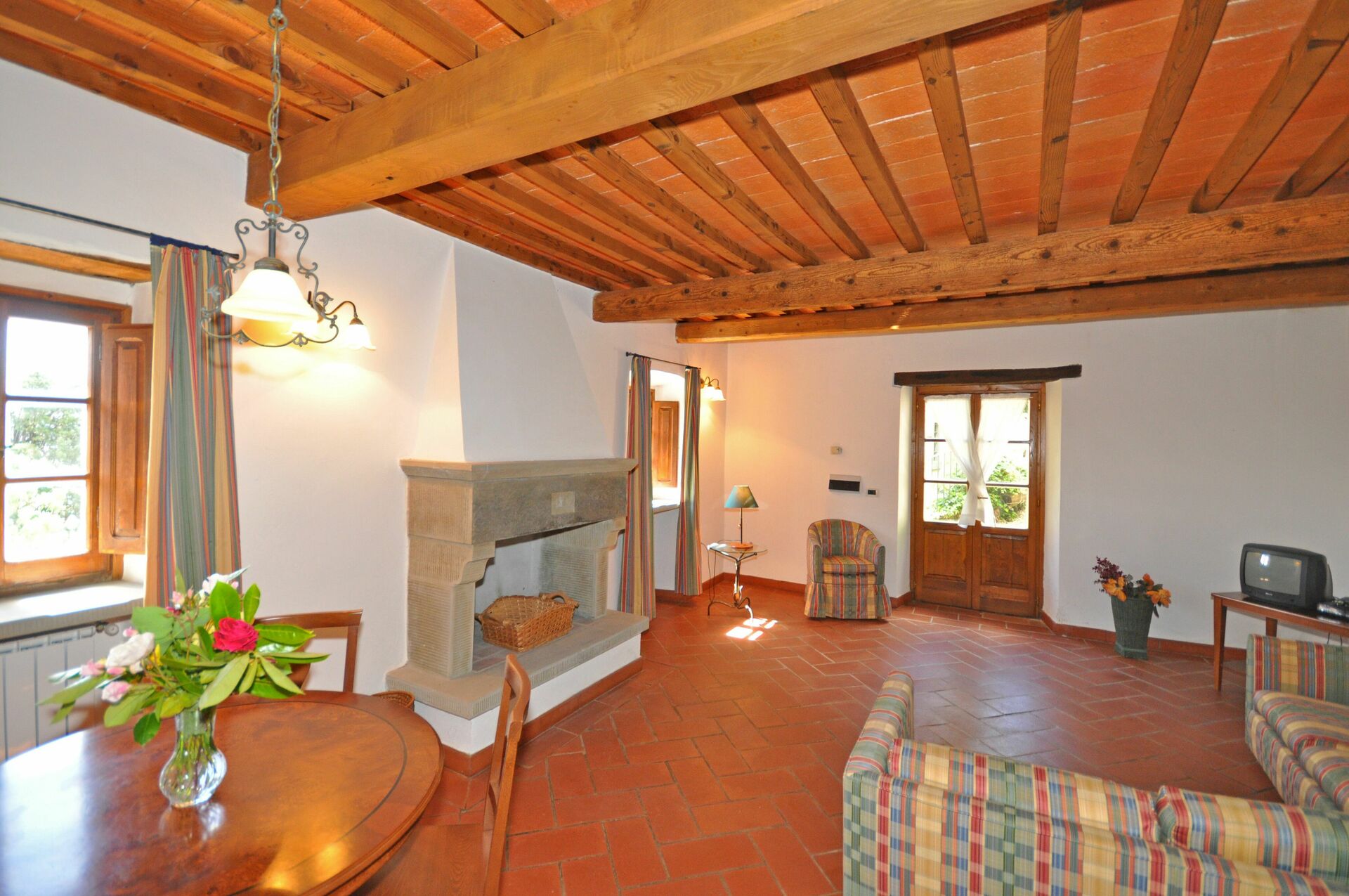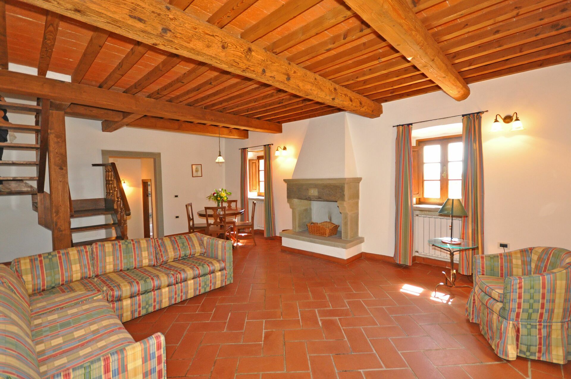 2 treden hoger: woon/eetkamer (sat-TV) met open haard.