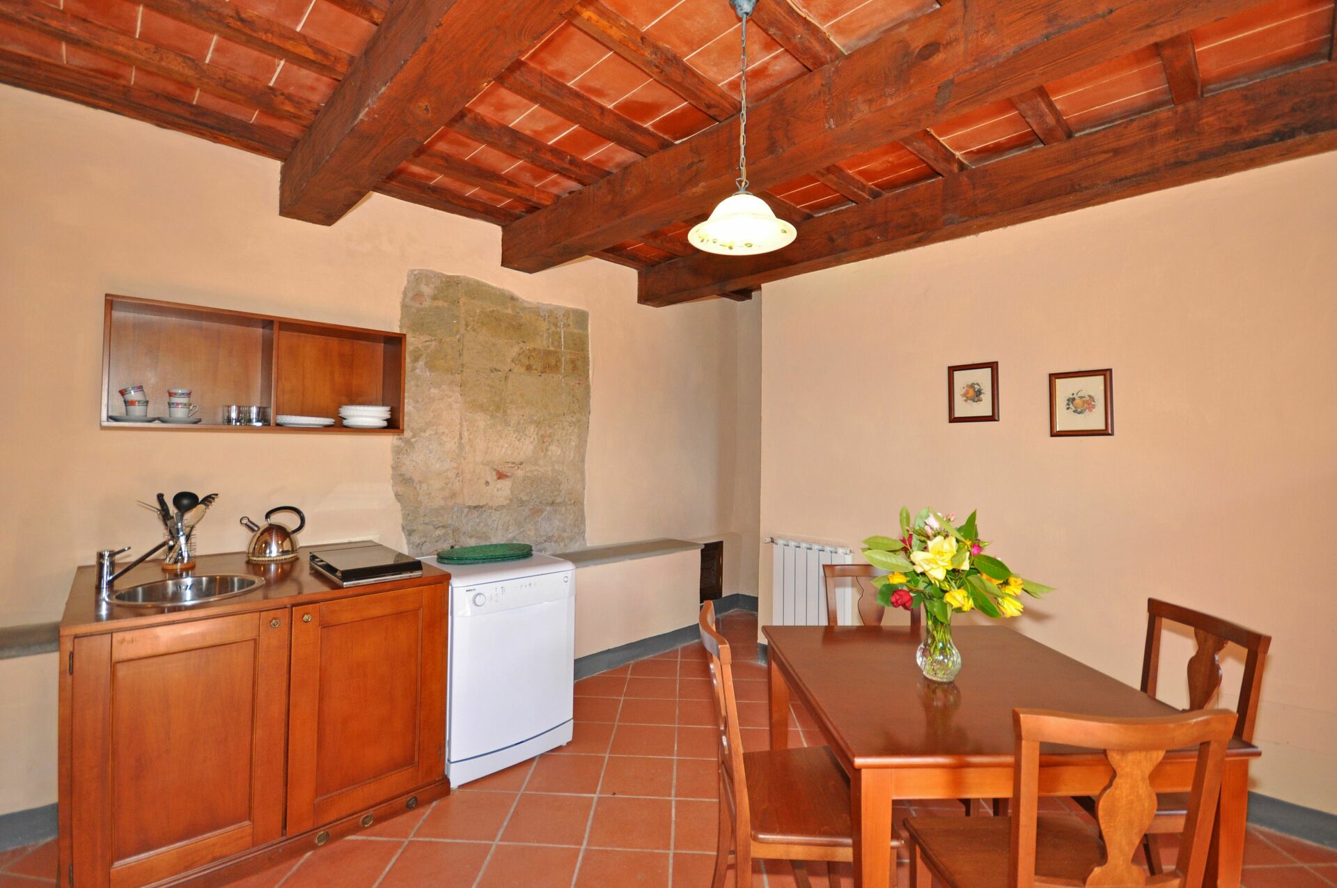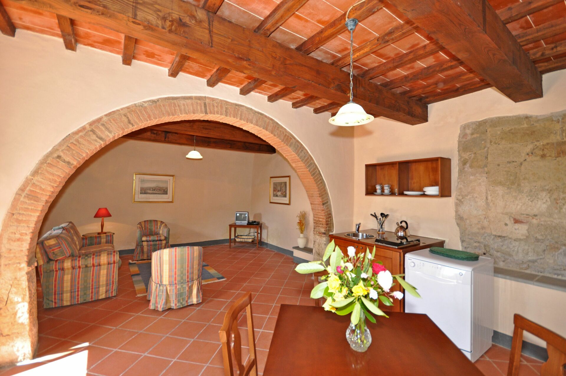 B.G.: woonkamer (sat-TV), keukenhoek (vaatwasser, 4 elektrische kookplaten), eetruimte en toegang naar de privé buitenruimte.