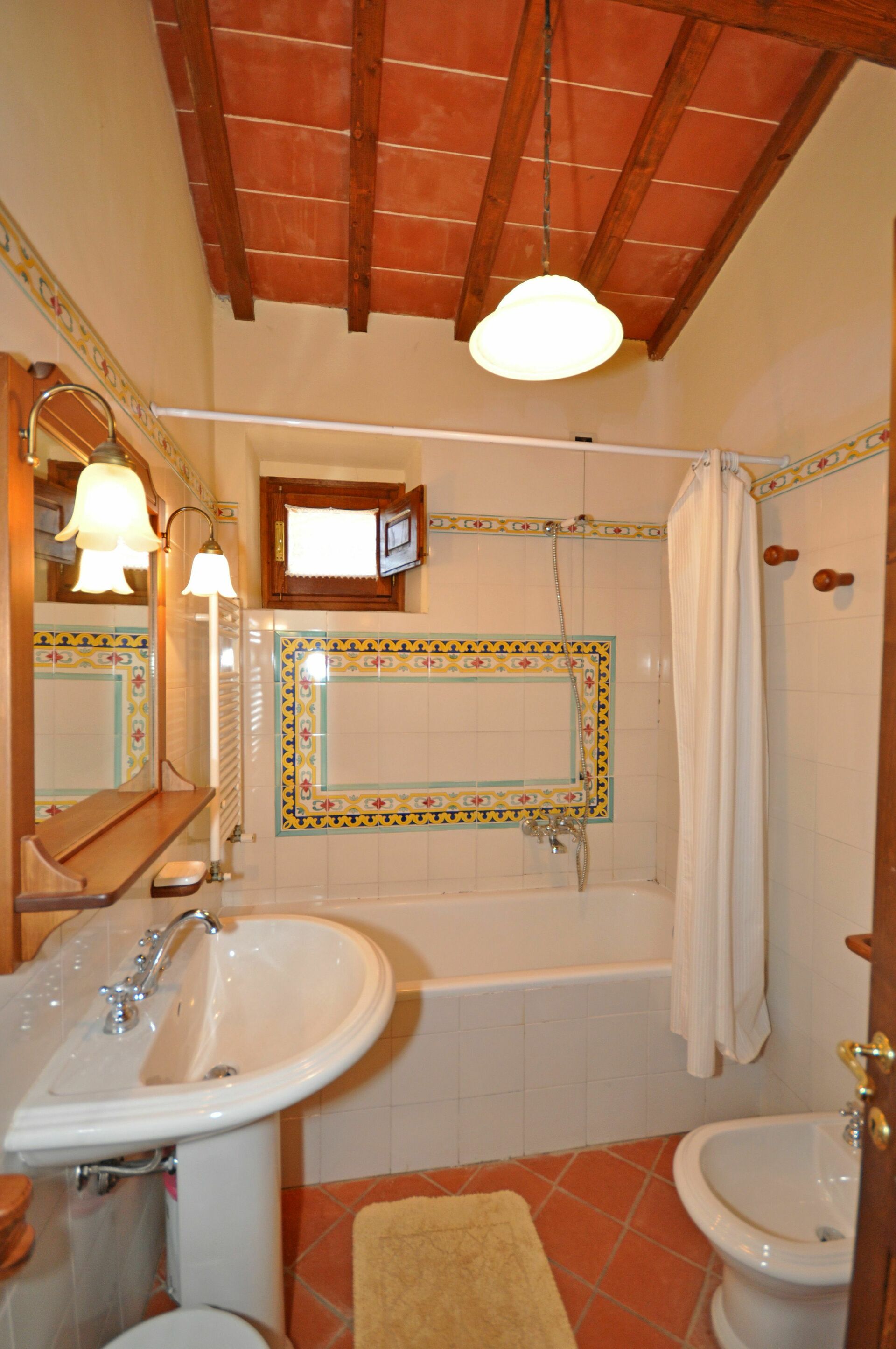 1° verdieping: slaapkamer met tweepersoonsbed, slaapkamer met 2 eenpersoonsbedden, badkamer met bad (haardroger).
