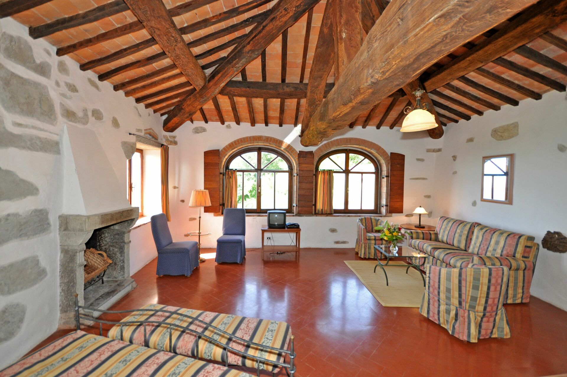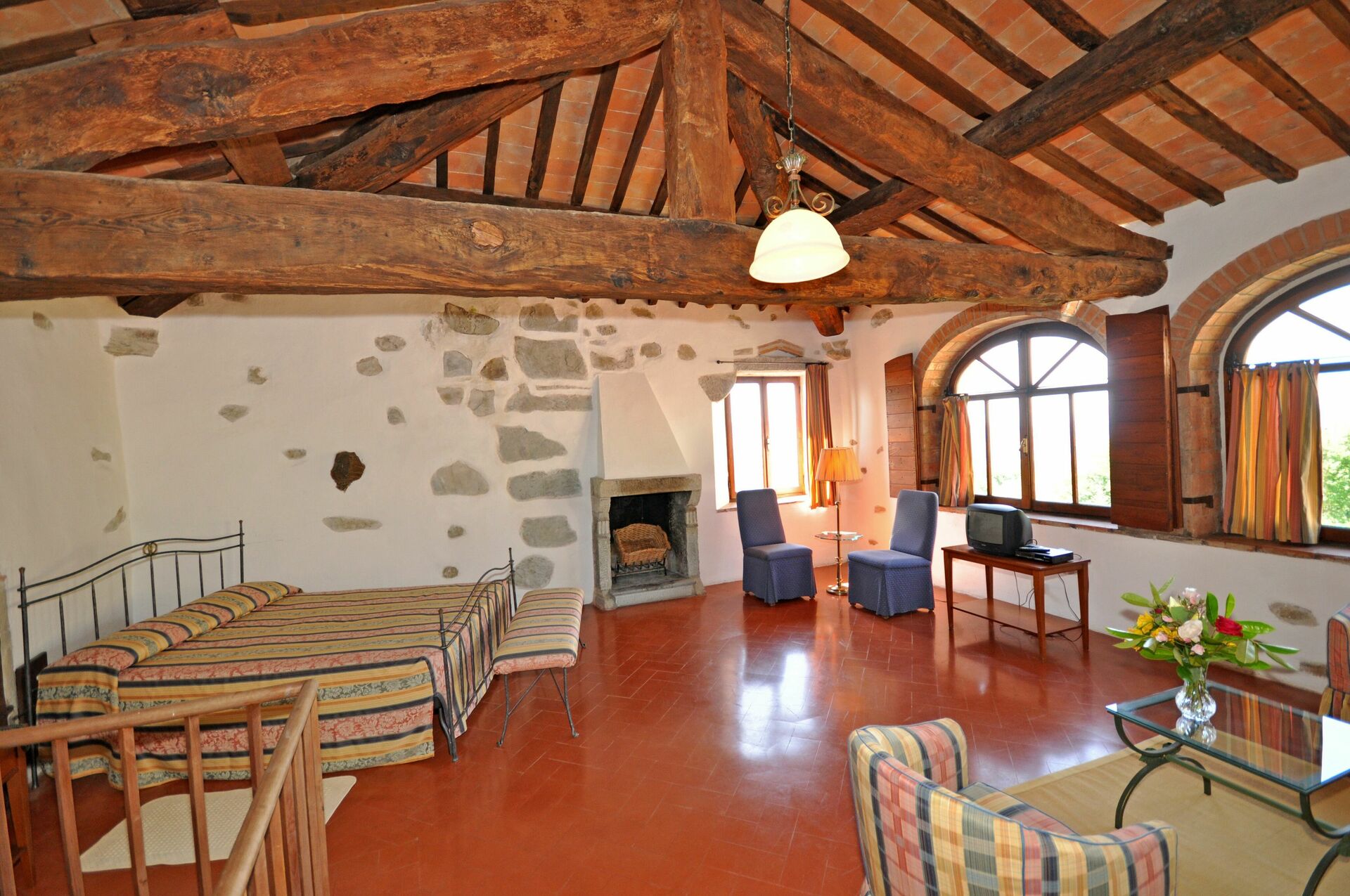2° verdieping (in de toren): grote suite met tweepersoonsbed, open haard en woonruimte (sat-TV).