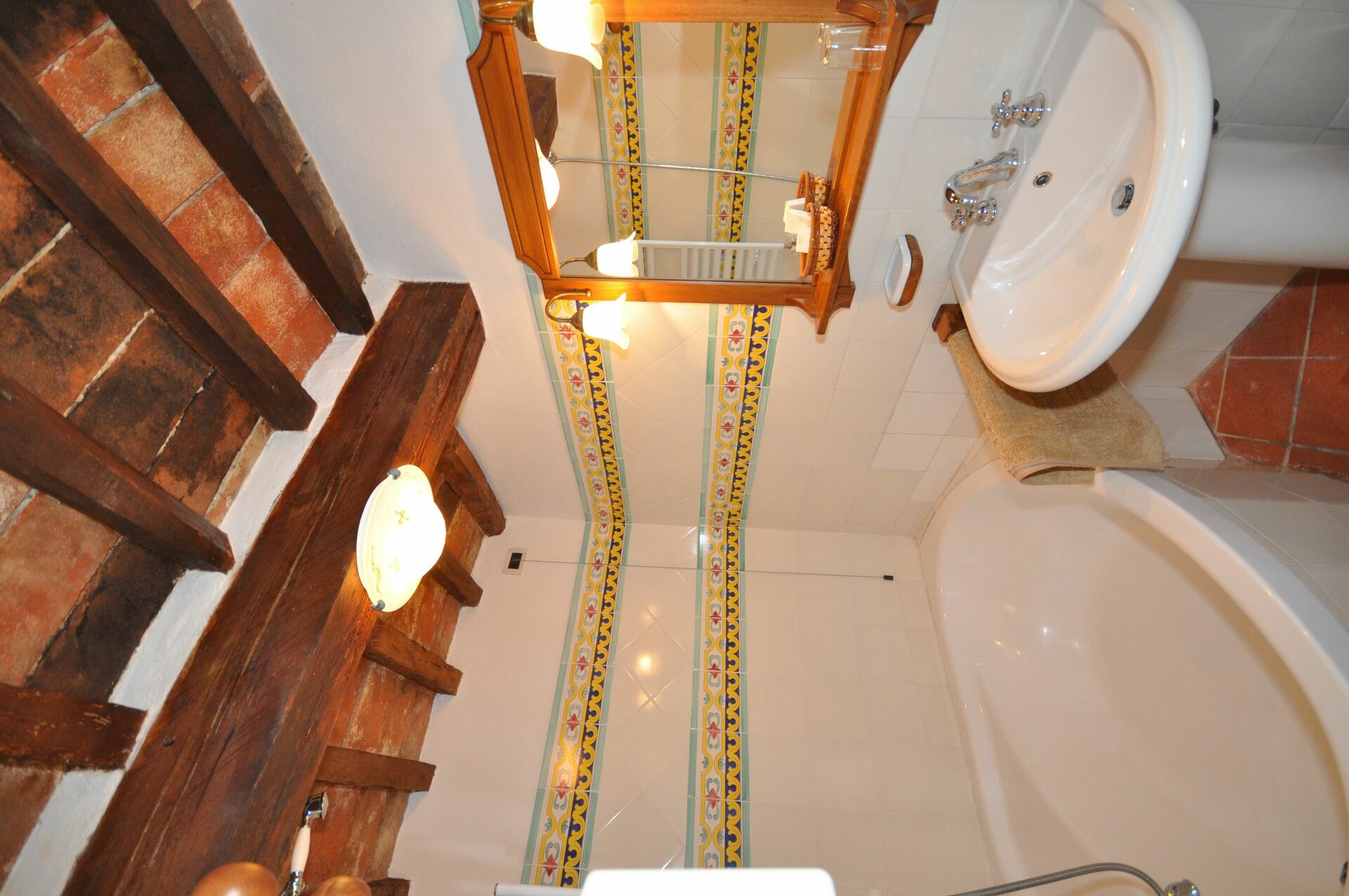 2 treden hoger: kleine eetkeuken (2 elektrische kookplaten), badkamer met bad (haardroger).