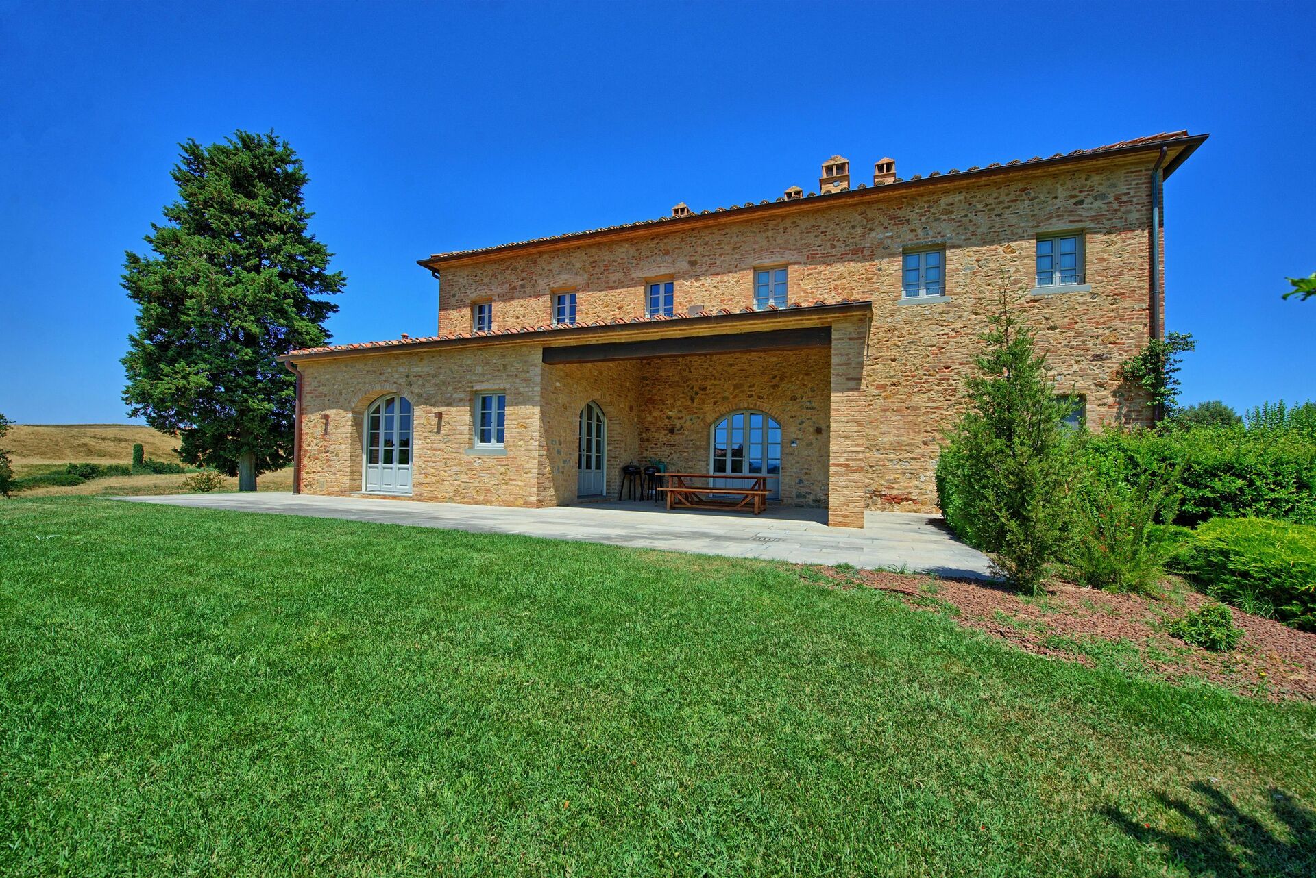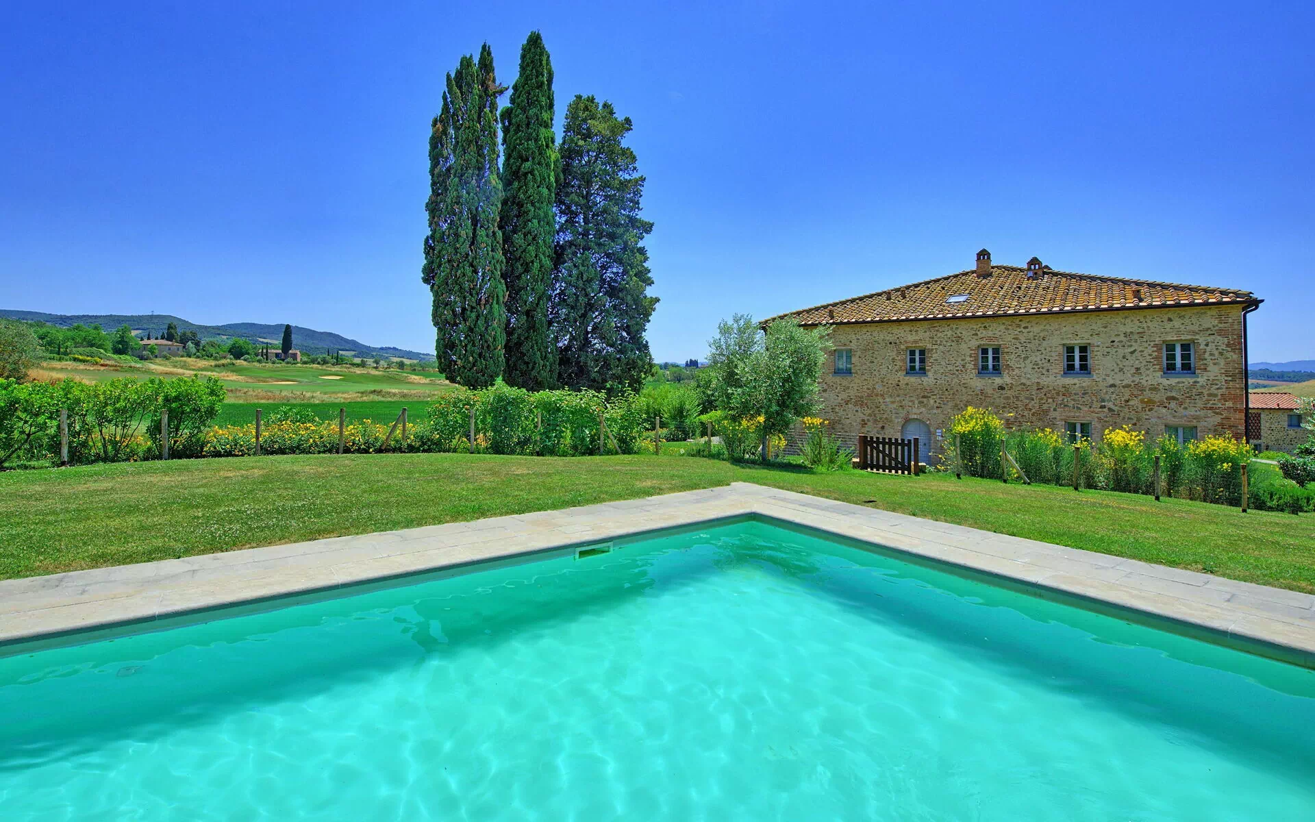 The villa and surrounding area are even more beautiful than the photos suggest. We spent six days there and were sad to leave. Castelfalfi is very centrally located to all the major towns in Tuscany. Most places are about 30-45 minutes away. The villa itself is within a beautiful hotel and golf resort, so you have access to nice restaurants on the property nearby. We loved the kitchen. It has two large sets of French doors that open up completely so that you feel like you’re indoor/outdoor at the same time. We loved cooking and eating there - though we mostly ate in the covered patio, which has a nice picnic table.We loved the kitchen. It has two large sets of French doors that open up completely so that you feel like you’re indoor/outdoor at the same We loved the bedrooms. I stayed in the master bedroom which has brick vault ceilings and french doors that open to give a wonderful view of the countryside. The other bedroom also has French doors.time. We loved cooking and eating there - though we mostly ate in the covered patio, which has a nice picnic table. We loved the bedrooms. I stayed in the master bedroom which has brick vault ceilings and french doors that open to give a wonderful view of the countryside. The other bedroom also has French doors.Fantastic. The three major sites - San Gimignano, Sienna, Volterra, Pisa - are all 30-45 minutes away. Florence is about 1h20 minutes.The pool is nice though it’s often filled with bugs given that the villa is out in the countryside. However the property is well maintained and we saw staff cleaning the pool a few times during our stay.