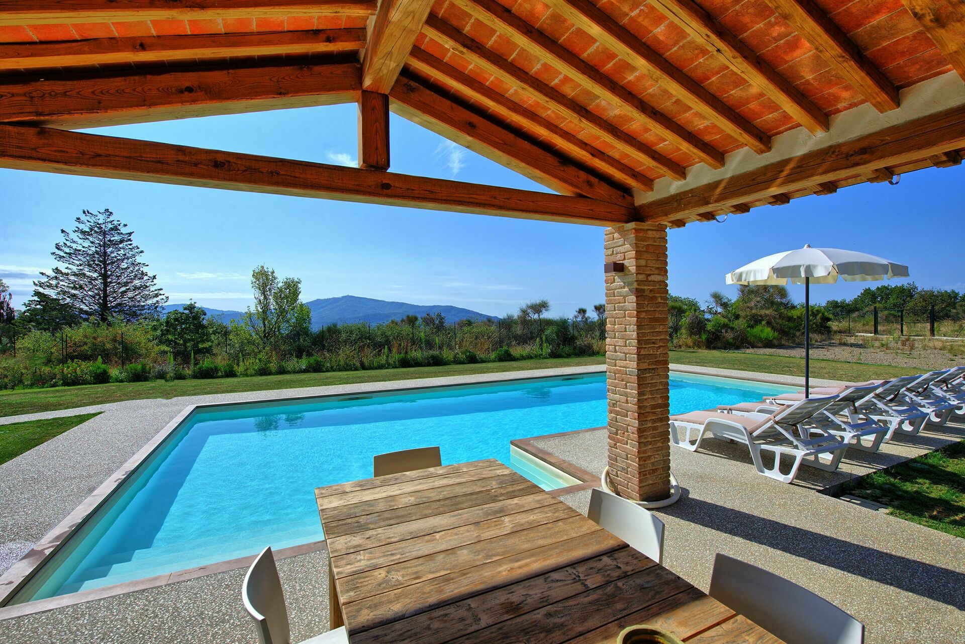 Een grote tuin omringt de villa en een exclusief zwembad staat de gasten volledig ter beschikking. Onder de overdekte loggia , ingericht met een tafel en stoelen, kan men heerlijk buiten eten.