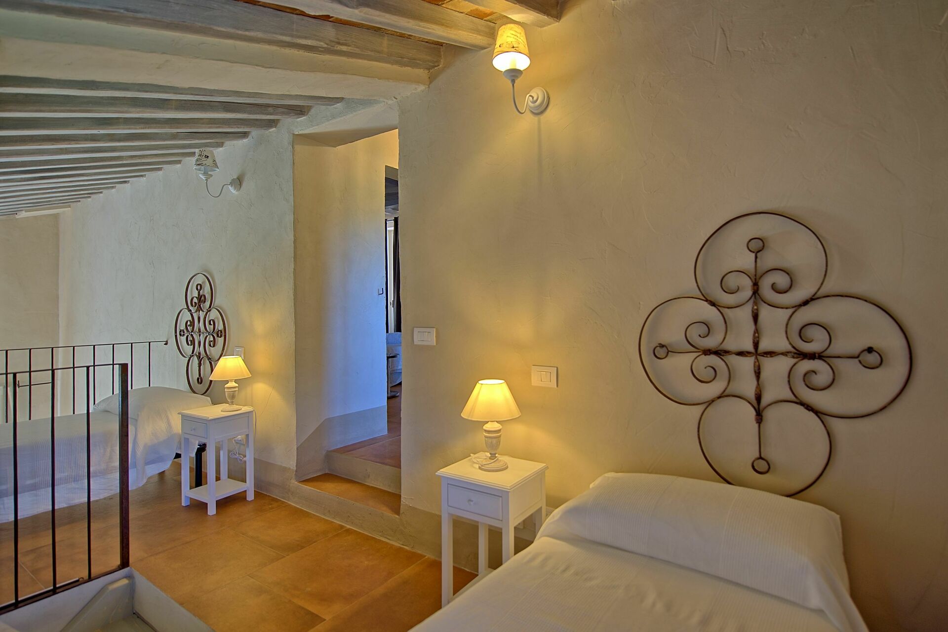 Eerste verdieping: slaapkamer met twee eenpersoonsbedden (opent op de benedenverdieping) en badkamer met douche. Deze slaapkamer kan via een binnendeur verbonden worden met het hoofdgebouw, die in verbinding staat met een van de tweepersoonskamers beschreven op de tweede verdieping van de hoofdvilla.