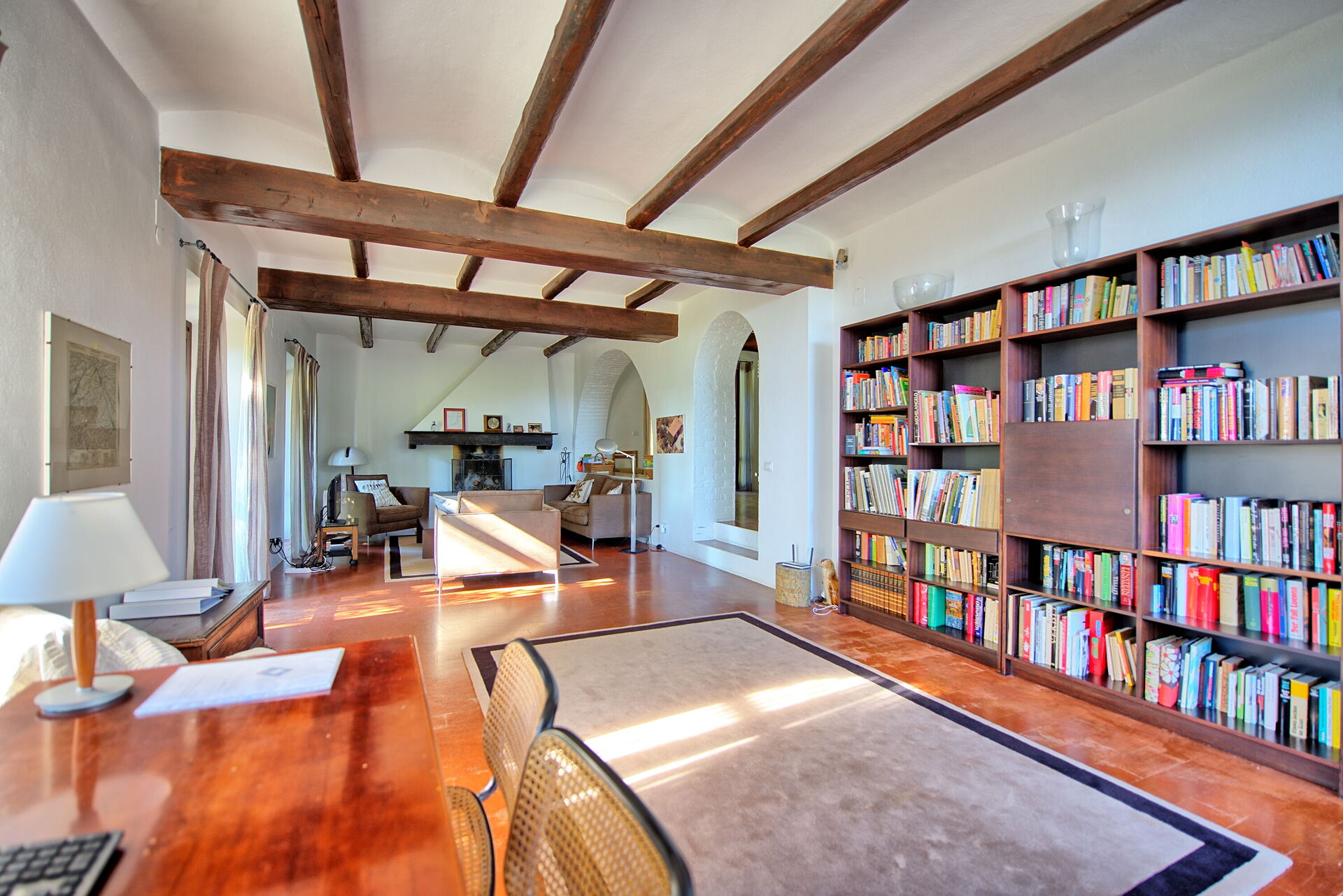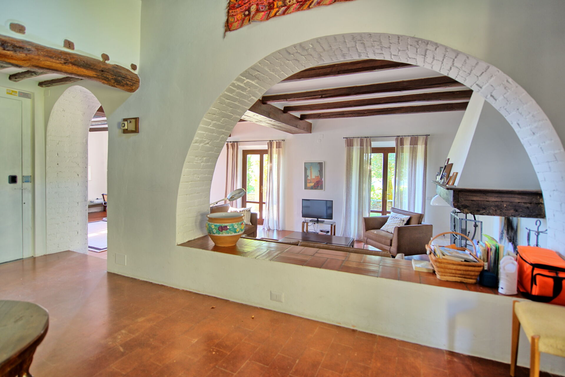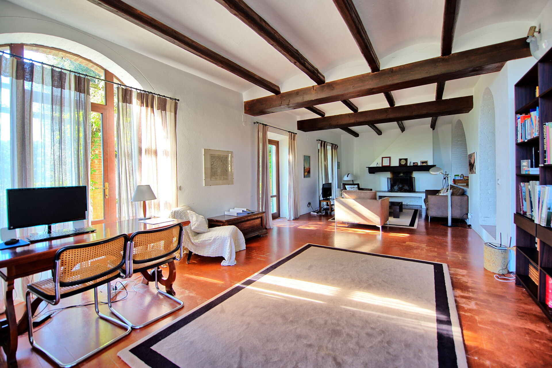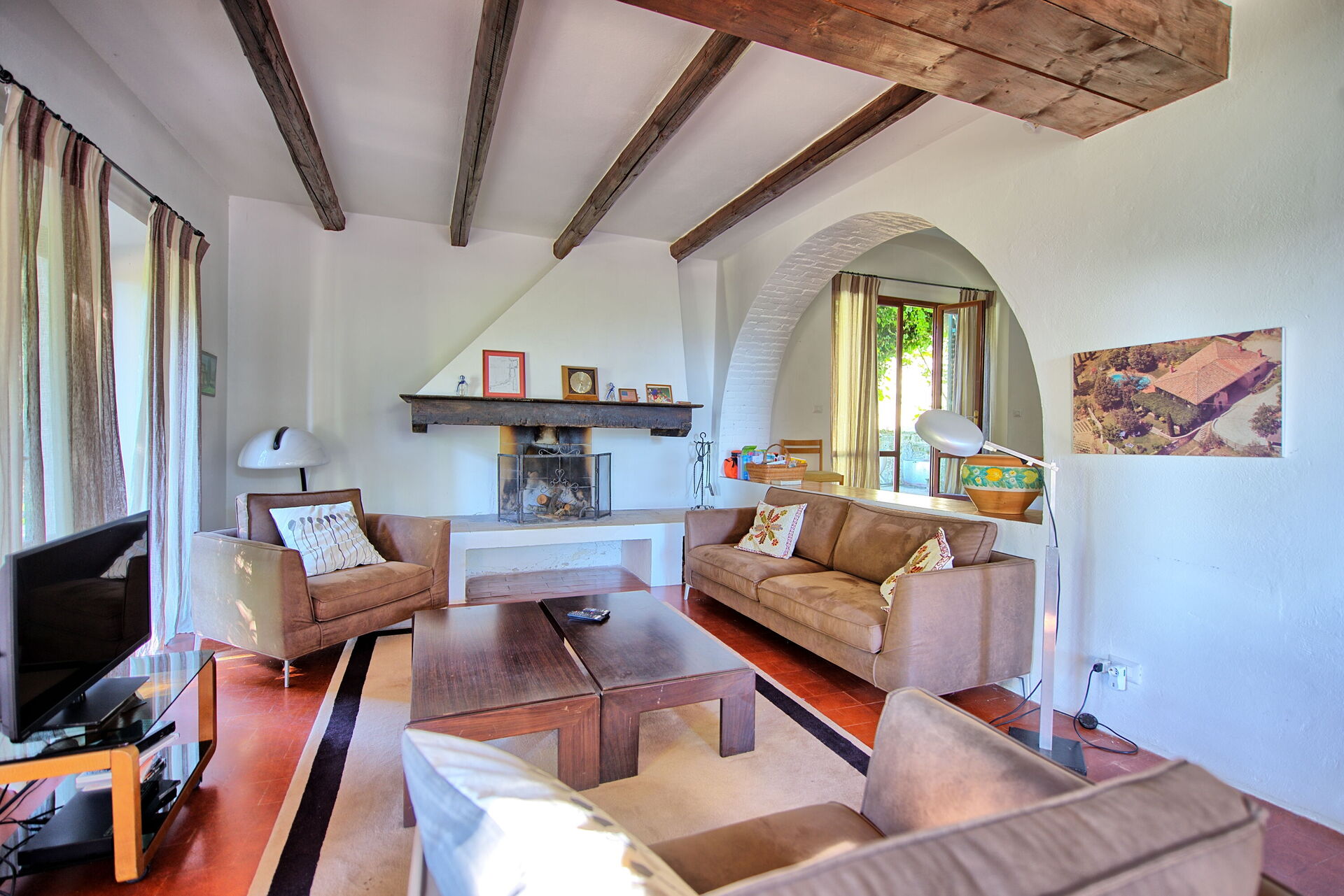2 treden lager:grote woonkamer met open werkende haard, ingericht met een bank en leunstoelen, LCD satelliet TV, aan de andere kant staat een bureau met een computer en printer ter beschikking van de gasten. De woonkamer heeft verschillende grote glazen deuren, die toegang geven tot een overdekt patio met tafel en stoelen om buiten te kunnen eten.