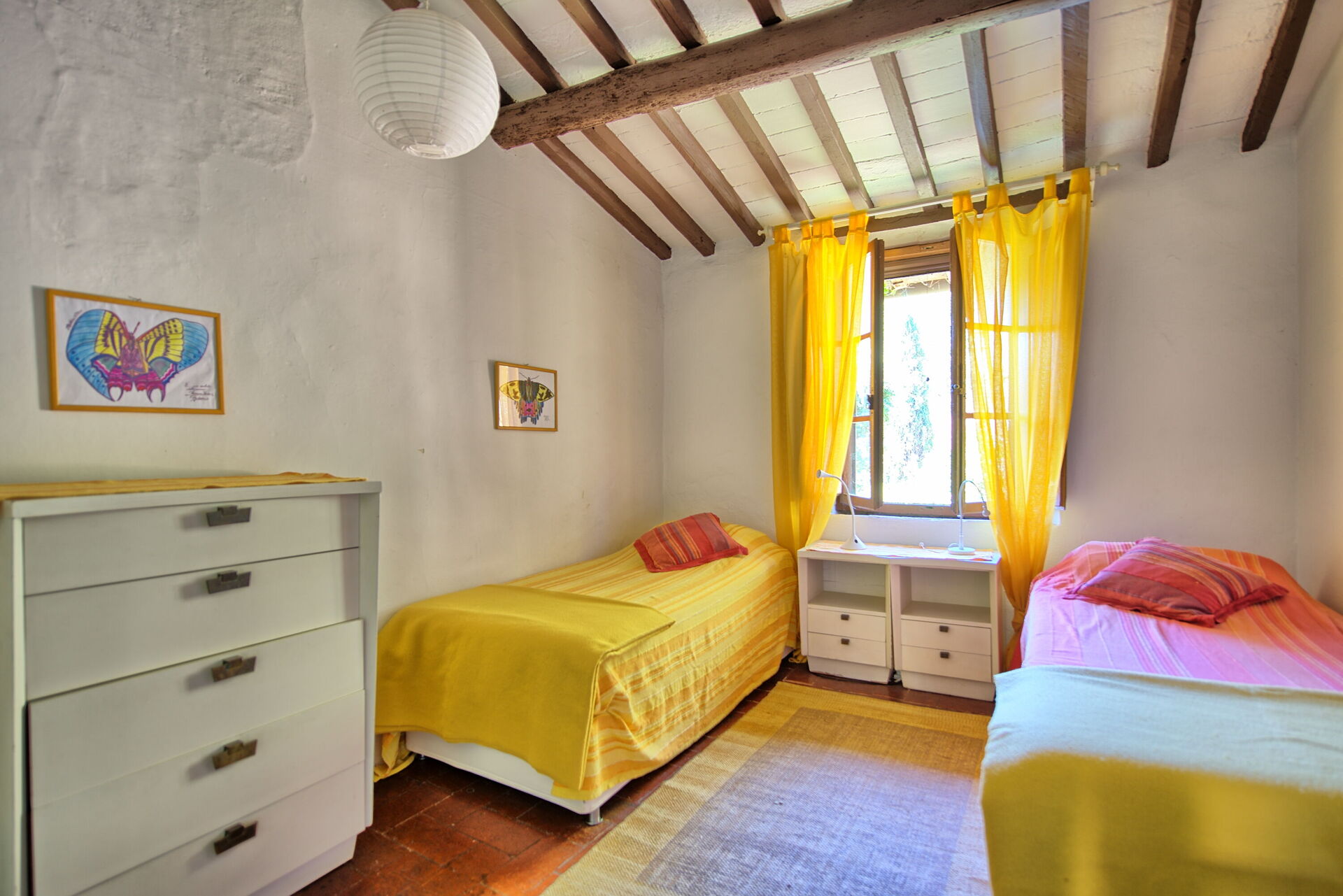 Eerste verdieping:12 treden omhoog, kleine gang naar rechts met een slaapkamer met tweepersoonsbed en een tweede slaapkamer met een “Frans” bed. Deze 2 slaapkamers delen een badkamer met douche. Aan de andere kant van de gang is er een slaapkamer met tweepersoonsbed met uitgang naar de tuin (met een trap omlaag); slaapkamer met twee eenpersoonsbedden; slaapkamer met een eenpersoonsbed; deze 3 slaapkamers hebben één badkamer met douche in de gang.
