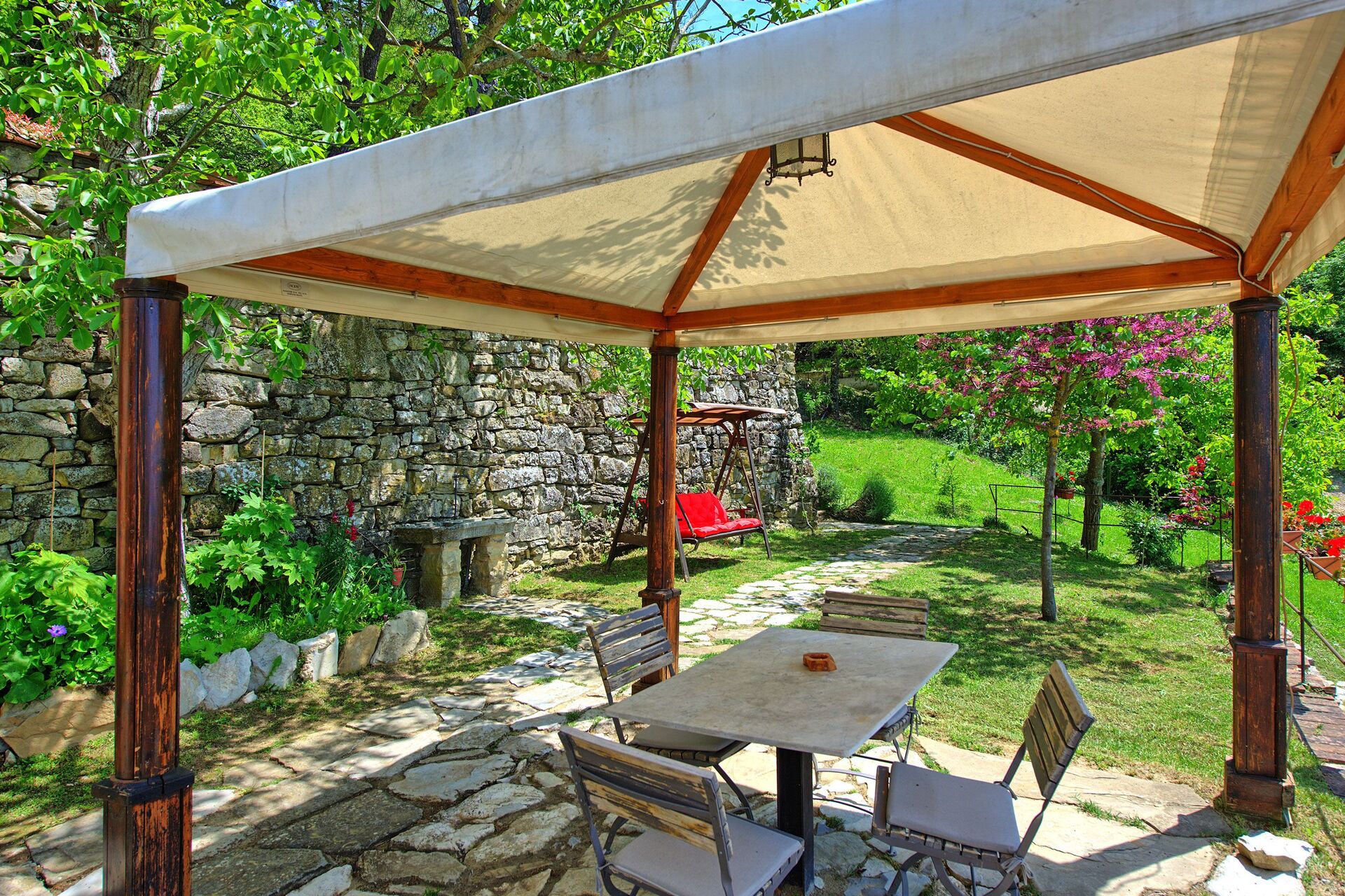 De woning heeft twee verdiepingen, met beide niveaus direct toegankelijk vanuit de tuin dankzij de ligging op een heuvel.